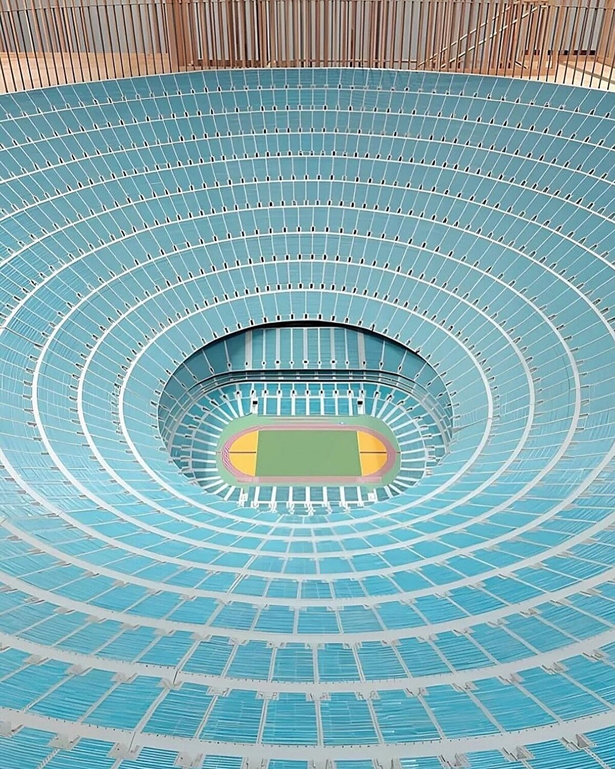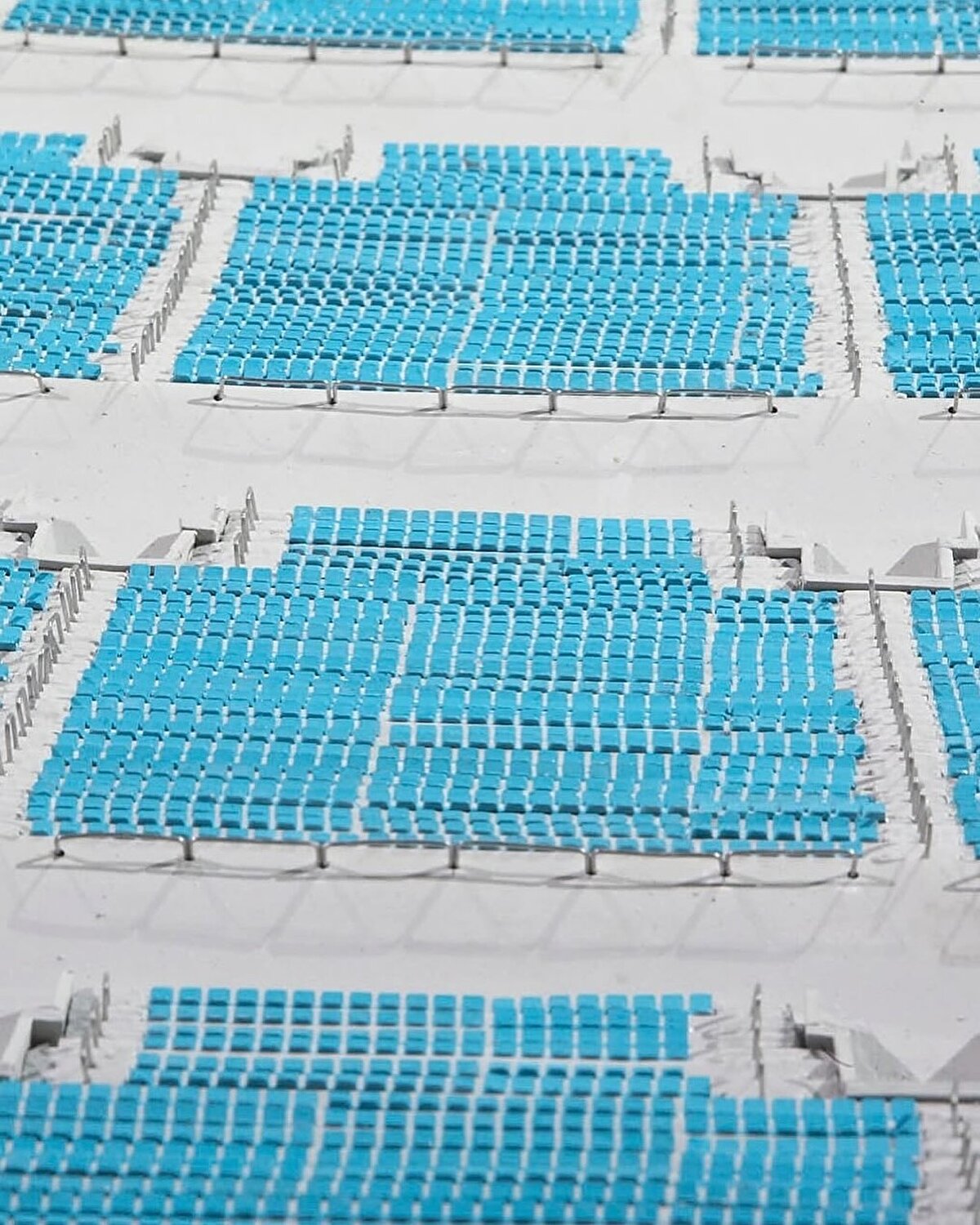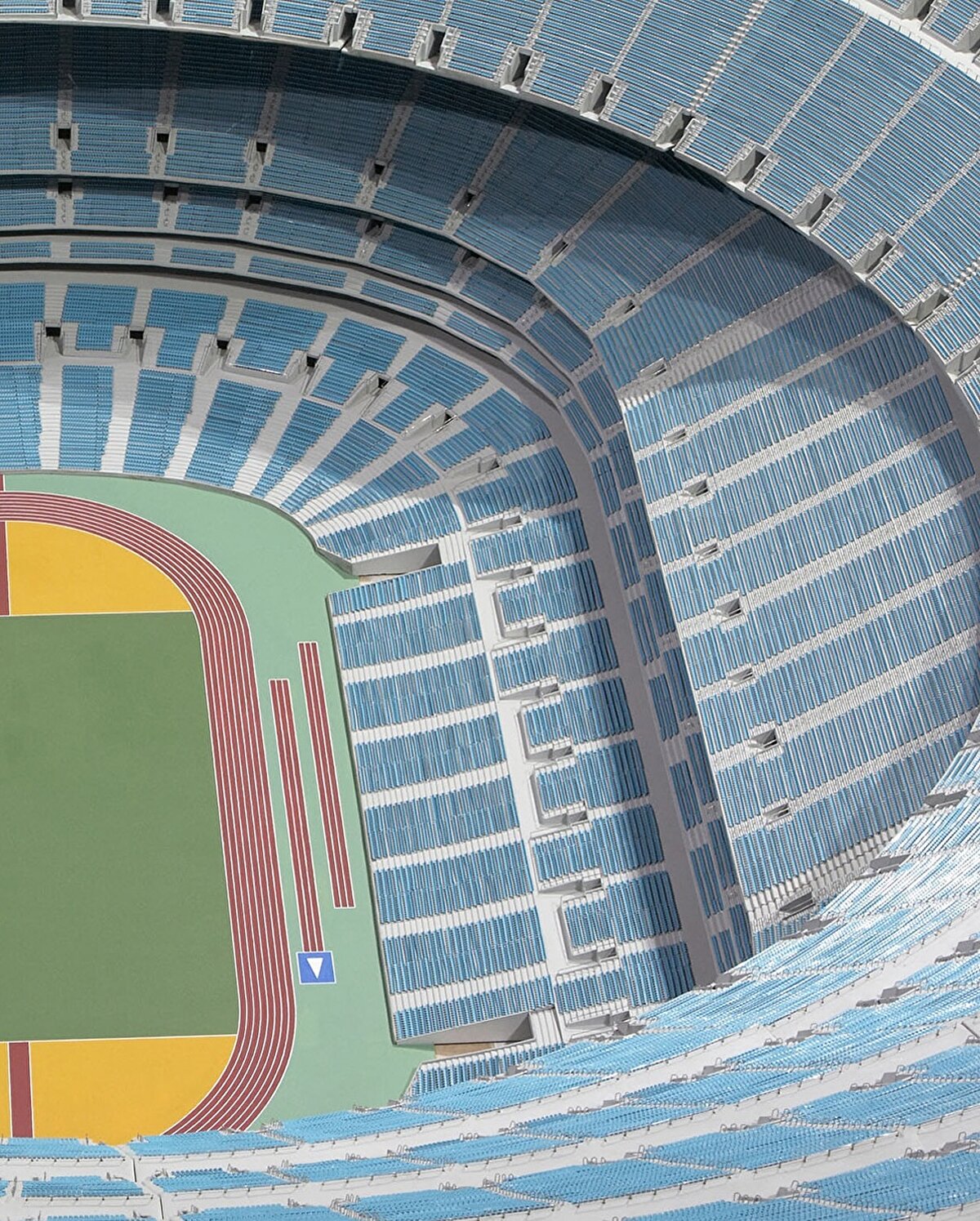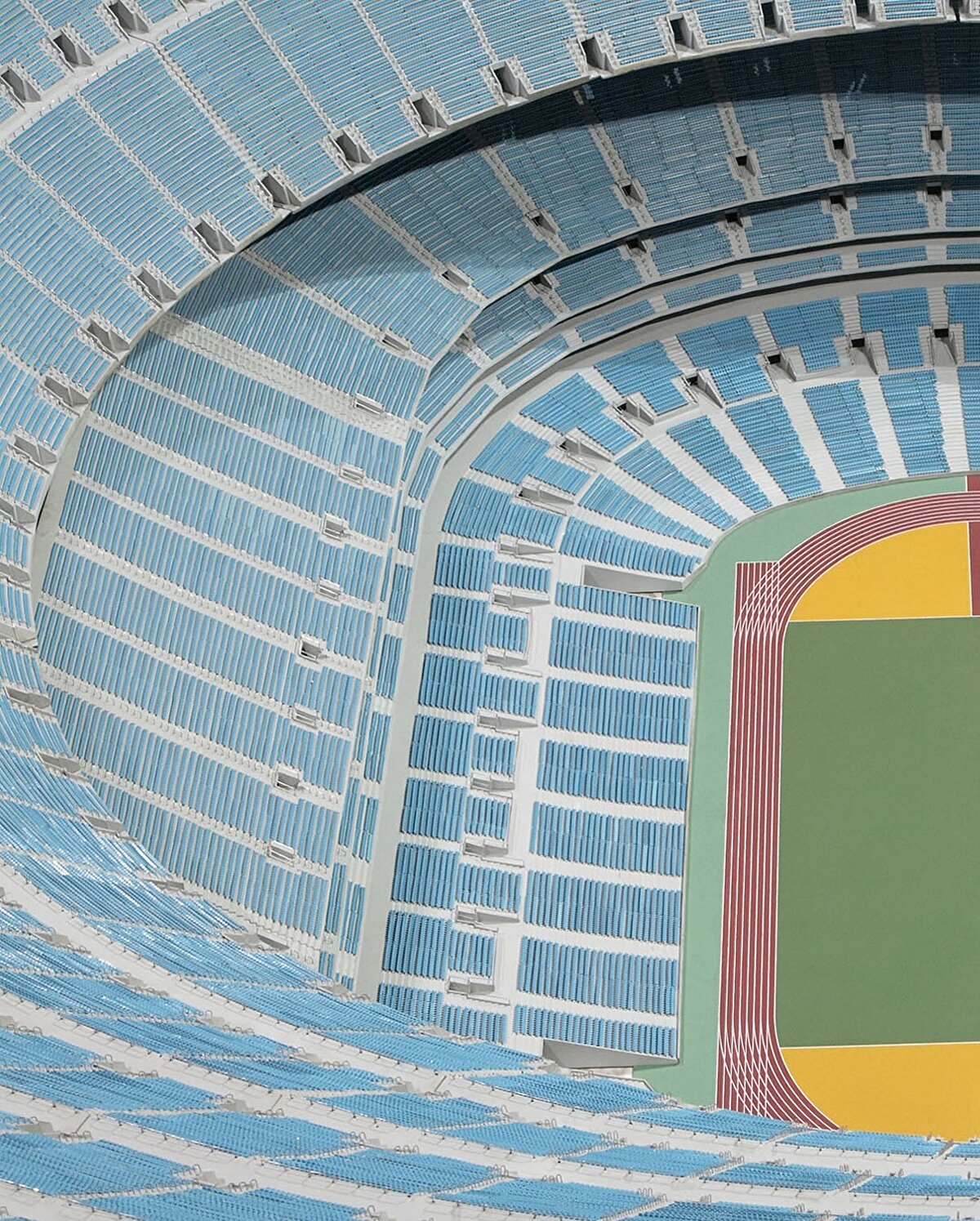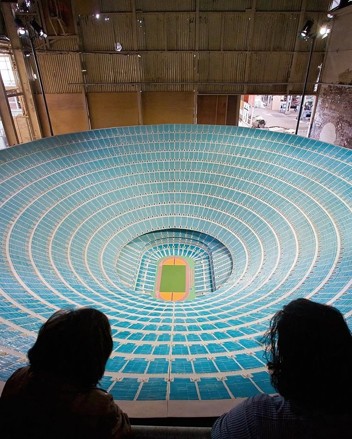 American artist Paul Pfeiffer created a miniature stadium called “Vitruvian Figure." The model, designed with a capacity of 1,000,000 spectators, was first presented in 2008 at the 16th Biennale of Sydney. Pfeiffer took inspiration from the Sydney Olympic Stadium and worked closely with its original architects, Bligh Voller Nield Architecture. Measuring eight meters in diameter, the model reimagines the existing 80,000-seat design as a structure that, if built at full scale, could hold one million people. Pfeiffer's vision raises questions of engineering and feasibility, while also referencing the Roman architect Vitruvius from the 1st century BC.