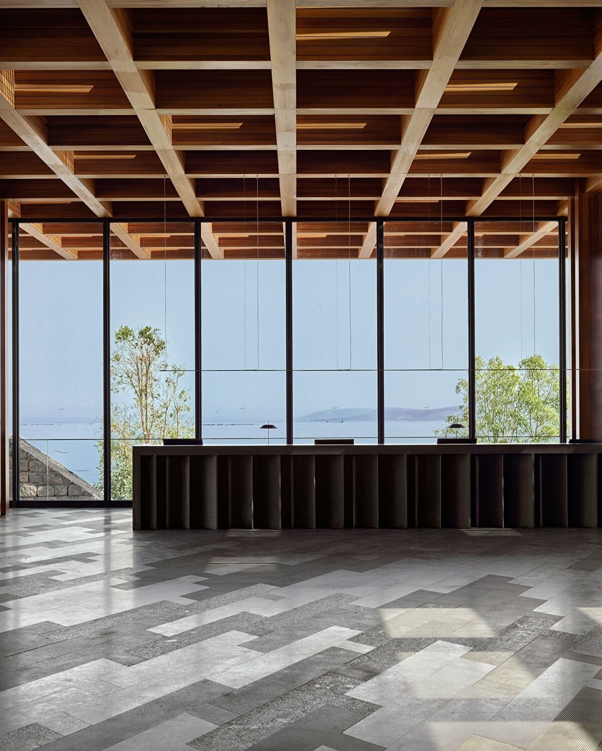 Minimalist bir tasarımla konukları karşılayan resepsiyon, ziyaretçileri konaklama ve diğer kamusal birimlere yönlendiriyor.