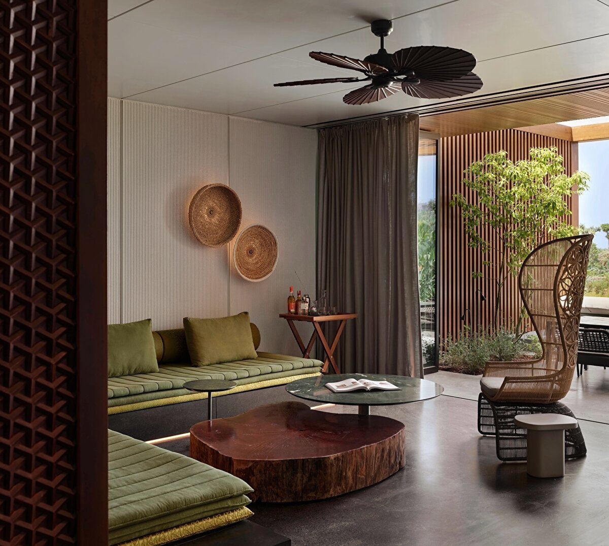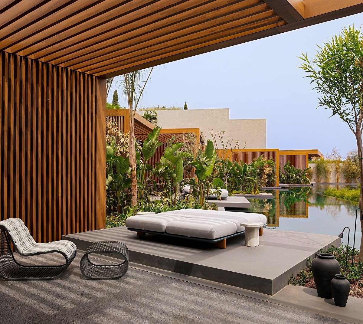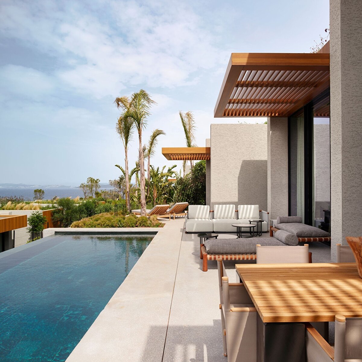 Bodrum'un eşsiz manzarasına açıklıklar ve teraslar ile erişim sağlanan tasarımda, iç ve dış mekan arasındaki sınırlar geçirgen hale getiriliyor. Bu tasarım yaklaşımı, konukların kompleksi doğal güzellikleri ve bağlamıyla birlikte deneyimleyebilmesine olanak tanıyor.