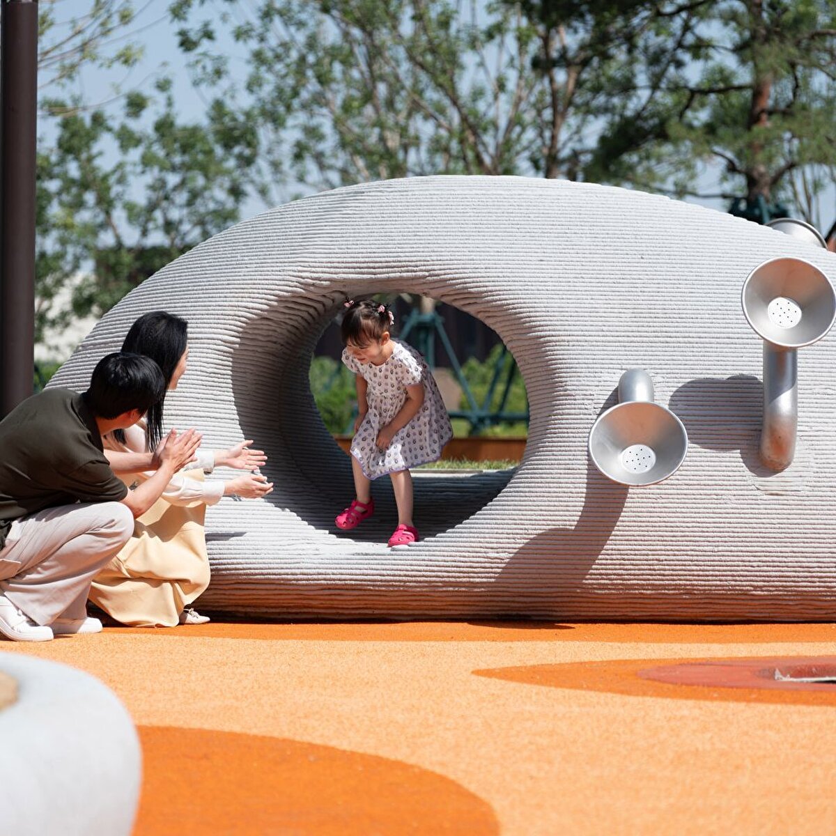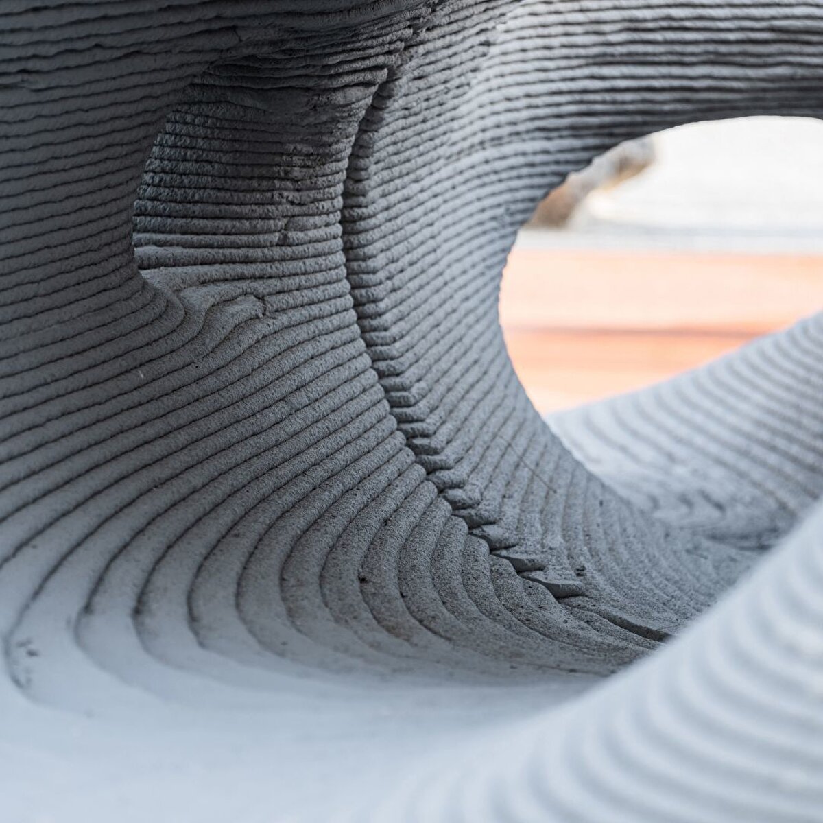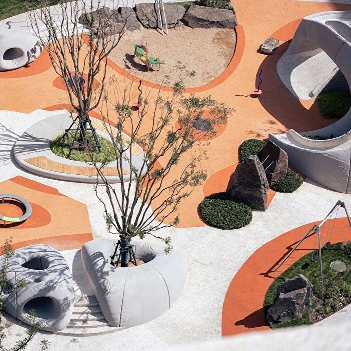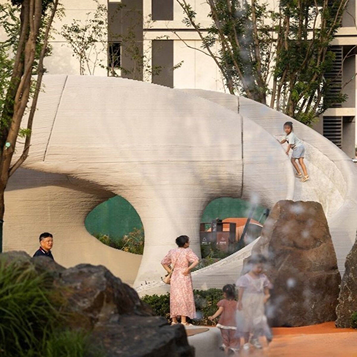 Boulder Park, katmanlı formlar ve serbest akışlı geometrilerle tasarlanan, 3D beton baskı tekniği kullanılarak inşa edilen bir oyun alanı.