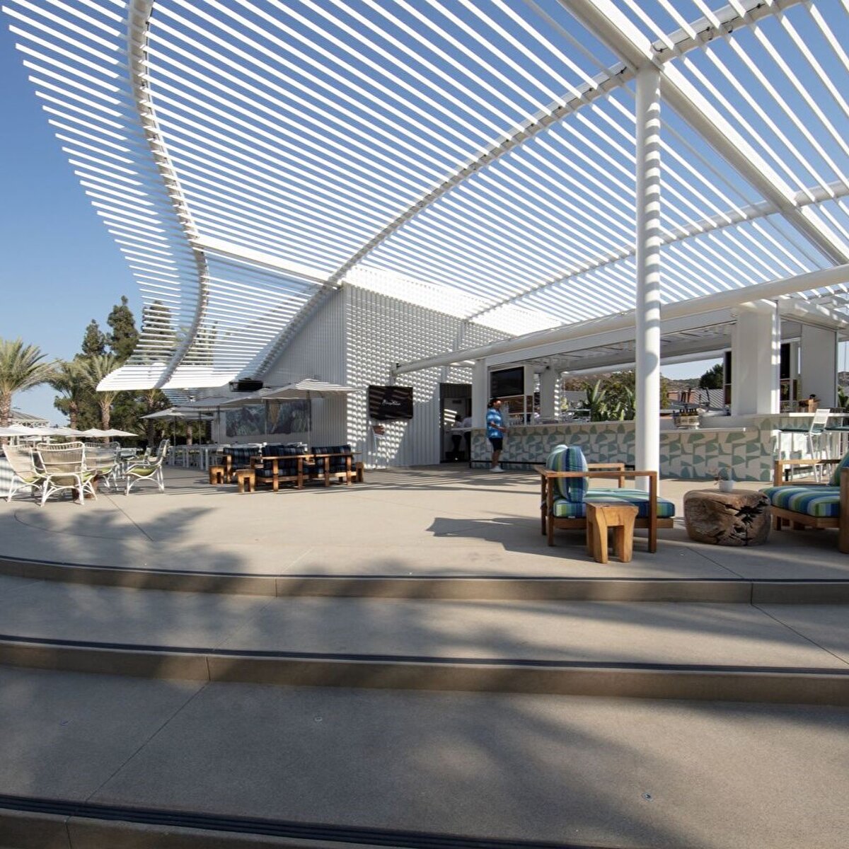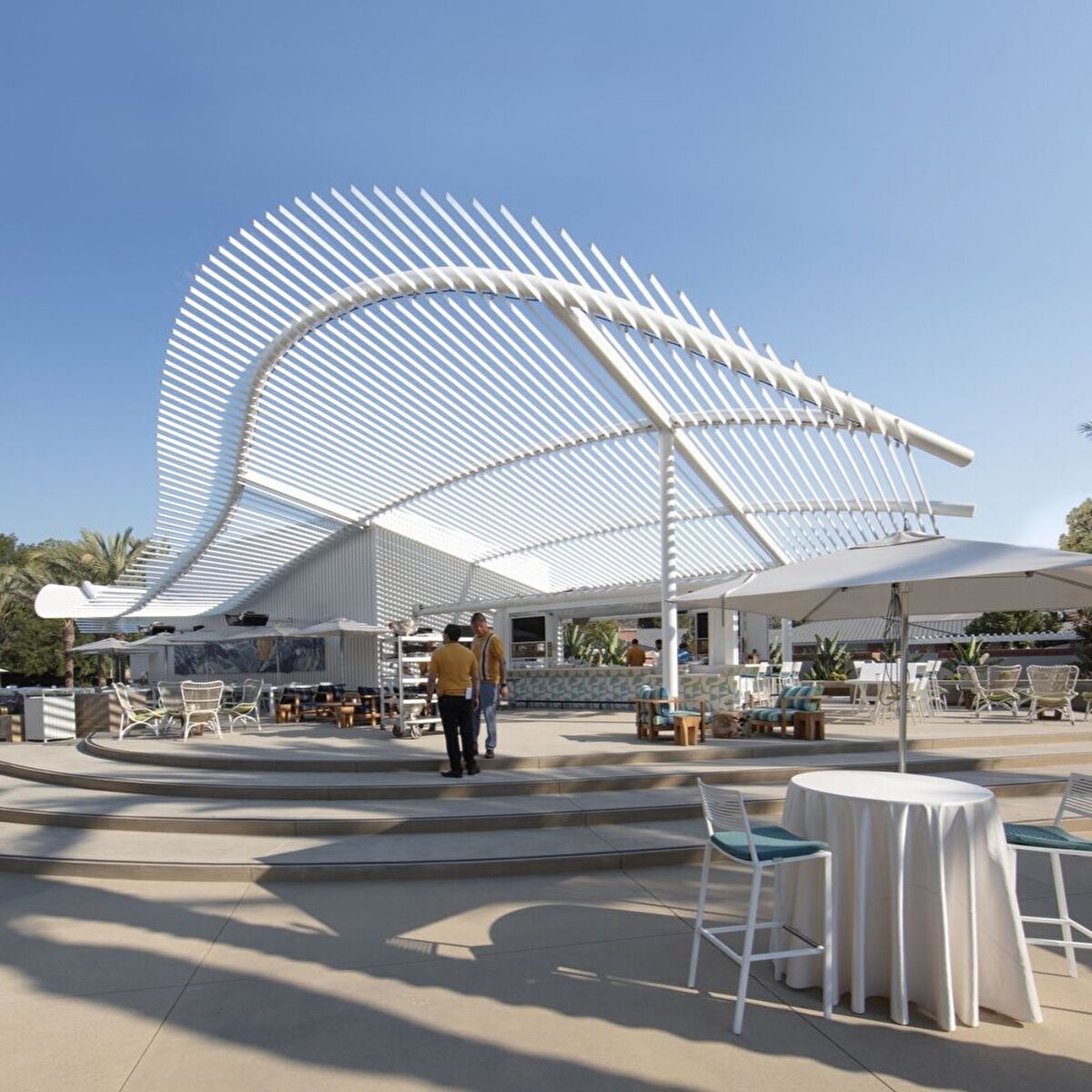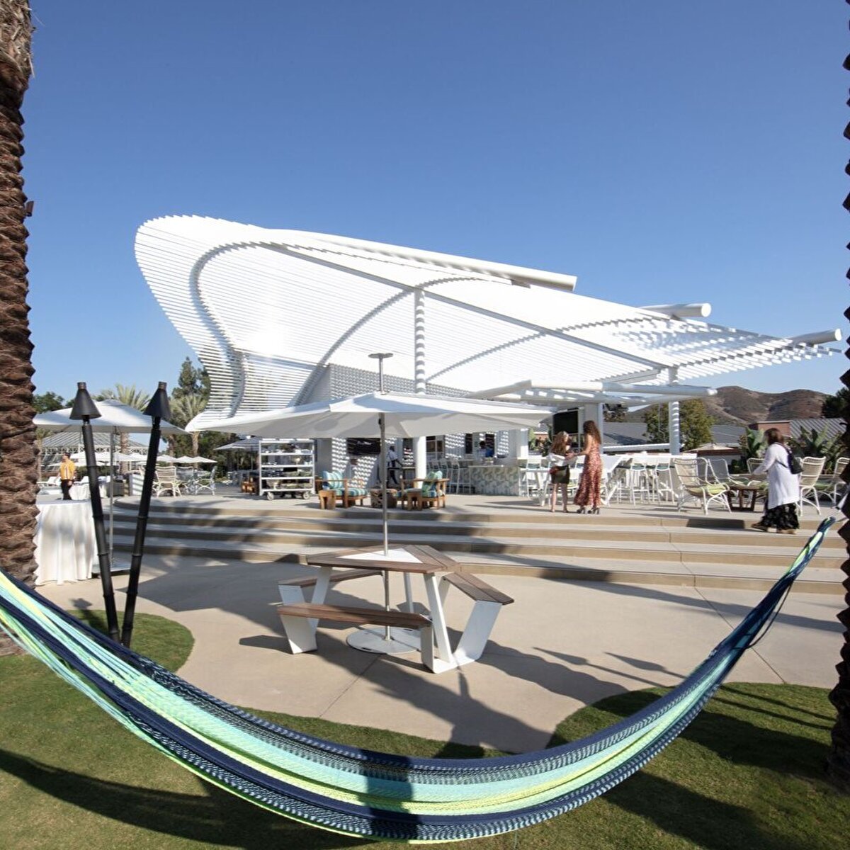 One of California's largest luxury pool concepts, The Cove, designed by Brooks + Scarpa Architecture, features a fully equipped commercial kitchen, IT area, private showers and bathrooms, three whirlpool spas, an expansive pool, terraced lounging areas, luxurious lounge chairs, palm-lined hammocks, an elevated bocce ball court, a greenhouse for private wellness experiences, an outdoor restaurant and a steel-clad outdoor bar. The existing greenhouse is also being redesigned to offer an organic dining experience. The approximately $20 million project is nestled among the Santa Monica Mountains.