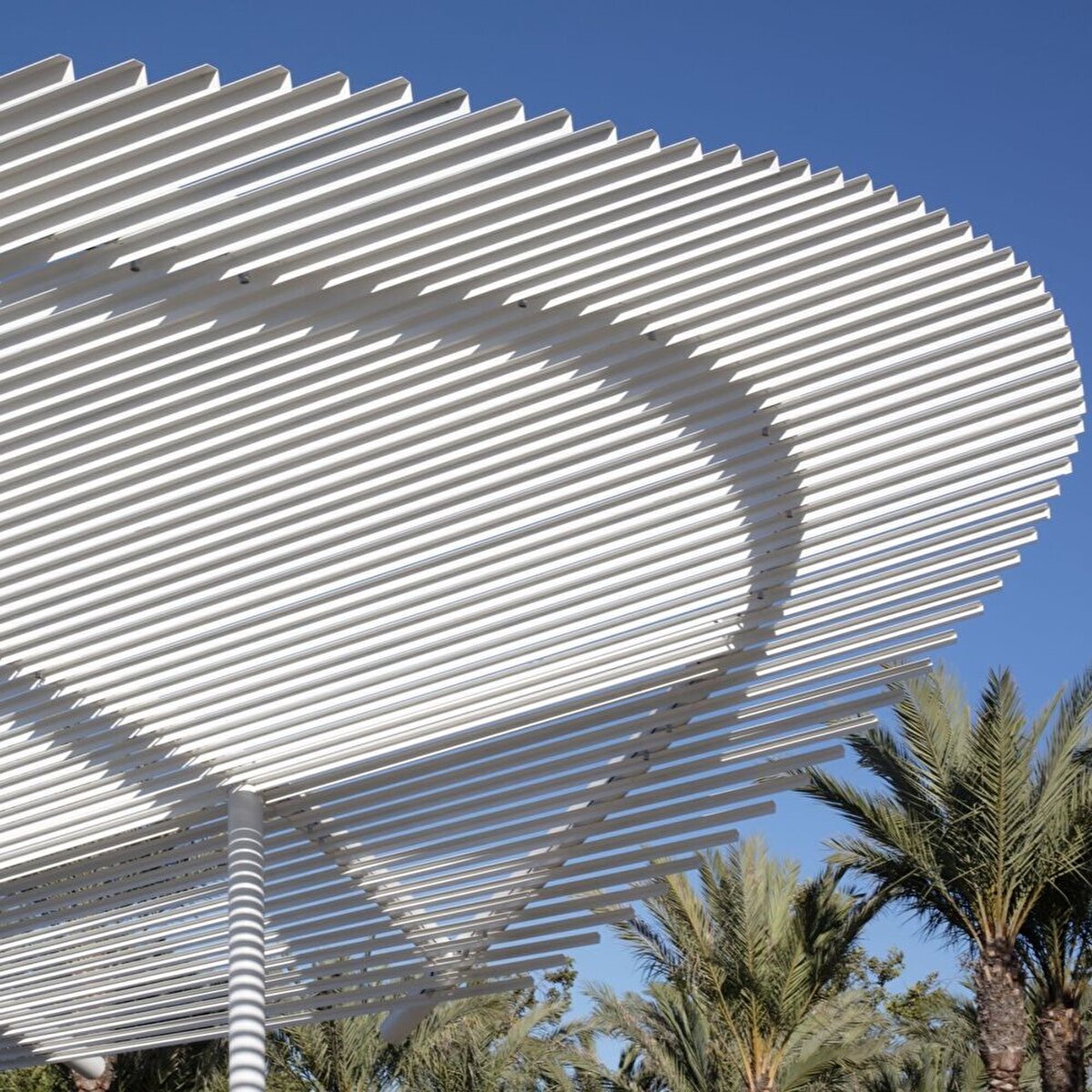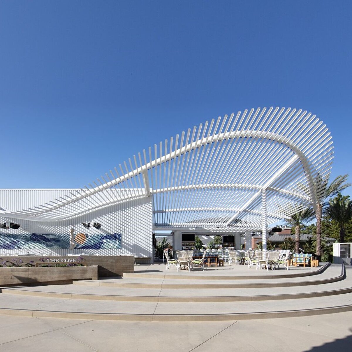 The Cove is designed in vibrant coastal colors; teak trees, white metal and aluminum and steel canopy reflect the curvature of the ocean waves. As the sun sets, tiki torches and a 40-foot fire wall illuminate the space with a warm glow.
