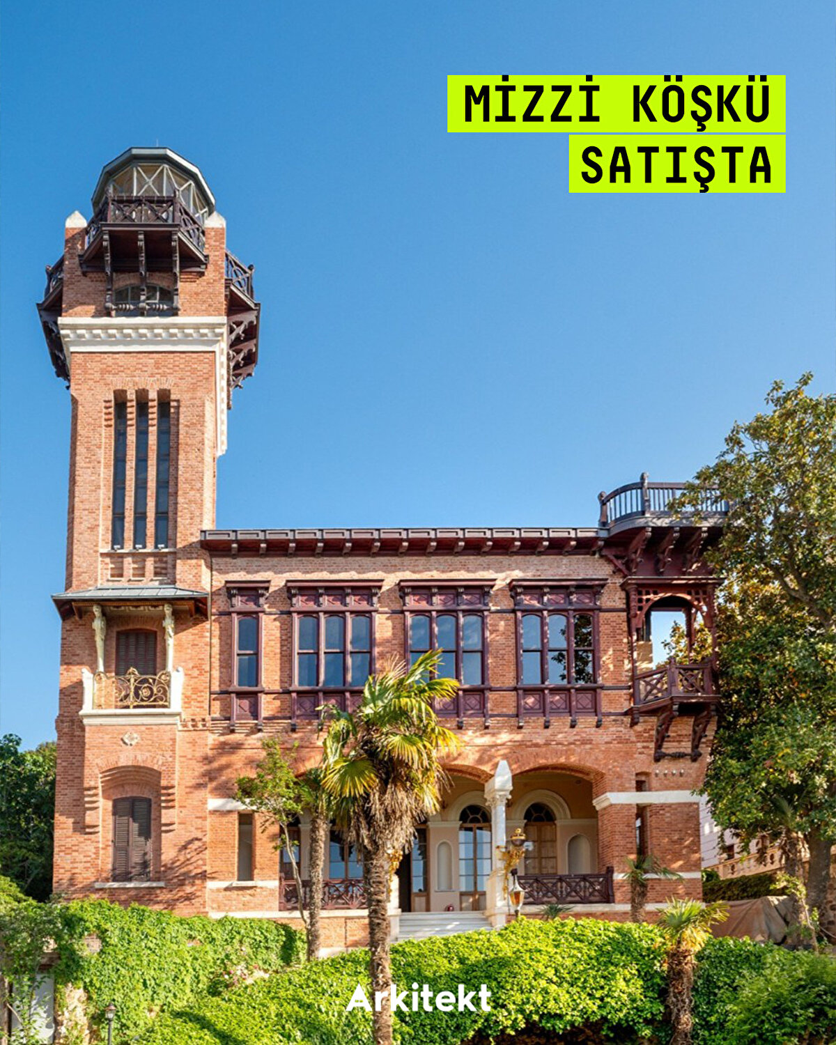 Büyükada'daki Mizzi Köşkü, İtalyan mimar Raimondo D'Aronco tarafından 1894'te tasarlanan kırmızı tuğlalı kulesiyle dikkat çekiyor. Ortaçağ şatolarını andıran yapısı ve İngiltere'nin Geç Viktorya Dönemi'nden izler taşıyan detaylarıyla, dönemin mimari anlayışını yerel malzemelerle buluşturuyor. “Al Palas” olarak da bilinen yapının tepesindeki camekânlı rasathane, bir zamanlar yıldız gözlemleri için kullanılan özel bir alan olarak öne çıkıyor. Bir dönem San Remo Oteli olarak hizmet veren köşk, daha sonra yazlık apart otel olarak kullanılmaya başlanıyor. Günümüzde @spaceistanbul tarafından 300 milyona satışa sunuluyor. - The Mizzi Mansion located on Büyükada stands out with its red-brick tower, designed by Italian architect Raimondo D'Aronco in 1894. Its structure, reminiscent of medieval castles, and details bearing traces of England's Late Victorian period, combine the architectural sensibilities of the era with local materials. Known as “Al Palas,” the glass-enclosed observatory at the top of the building once served as a special area for stargazing. The mansion, which once operated as the San Remo Hotel, later began to be used as a summer apartment hotel. Today, it is offered for sal efor 300 million by @spaceistanbul.