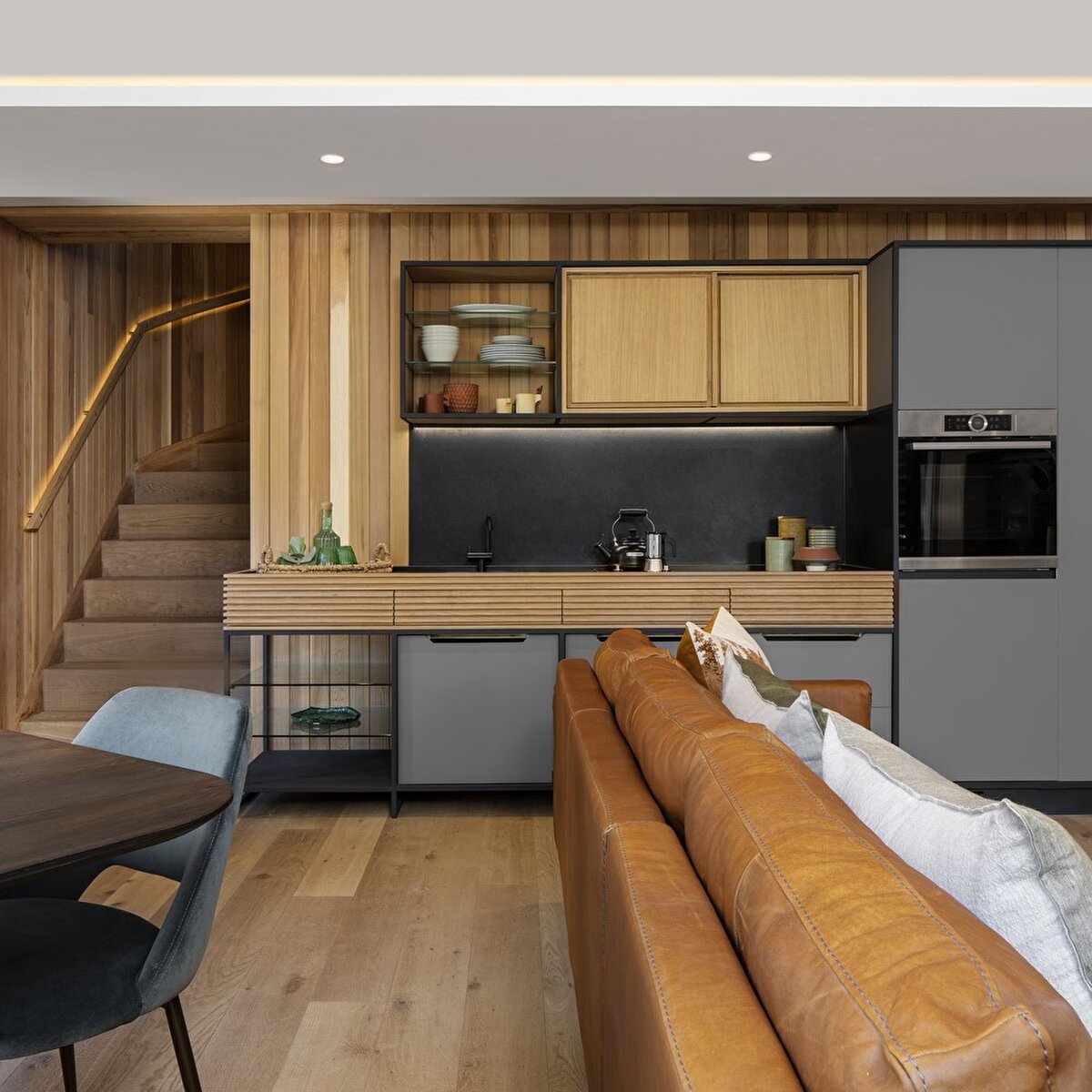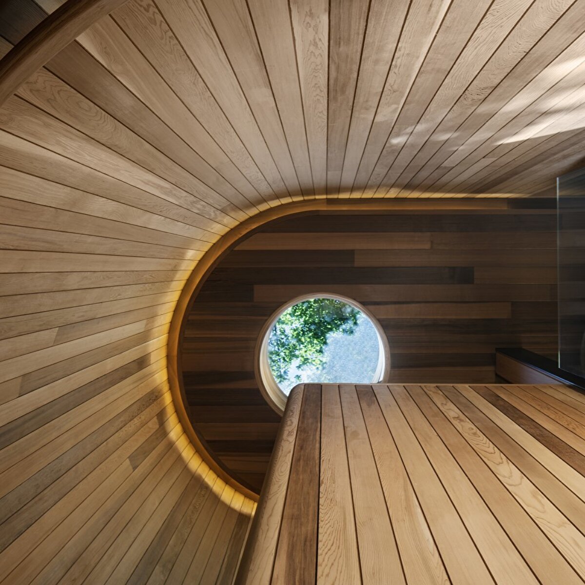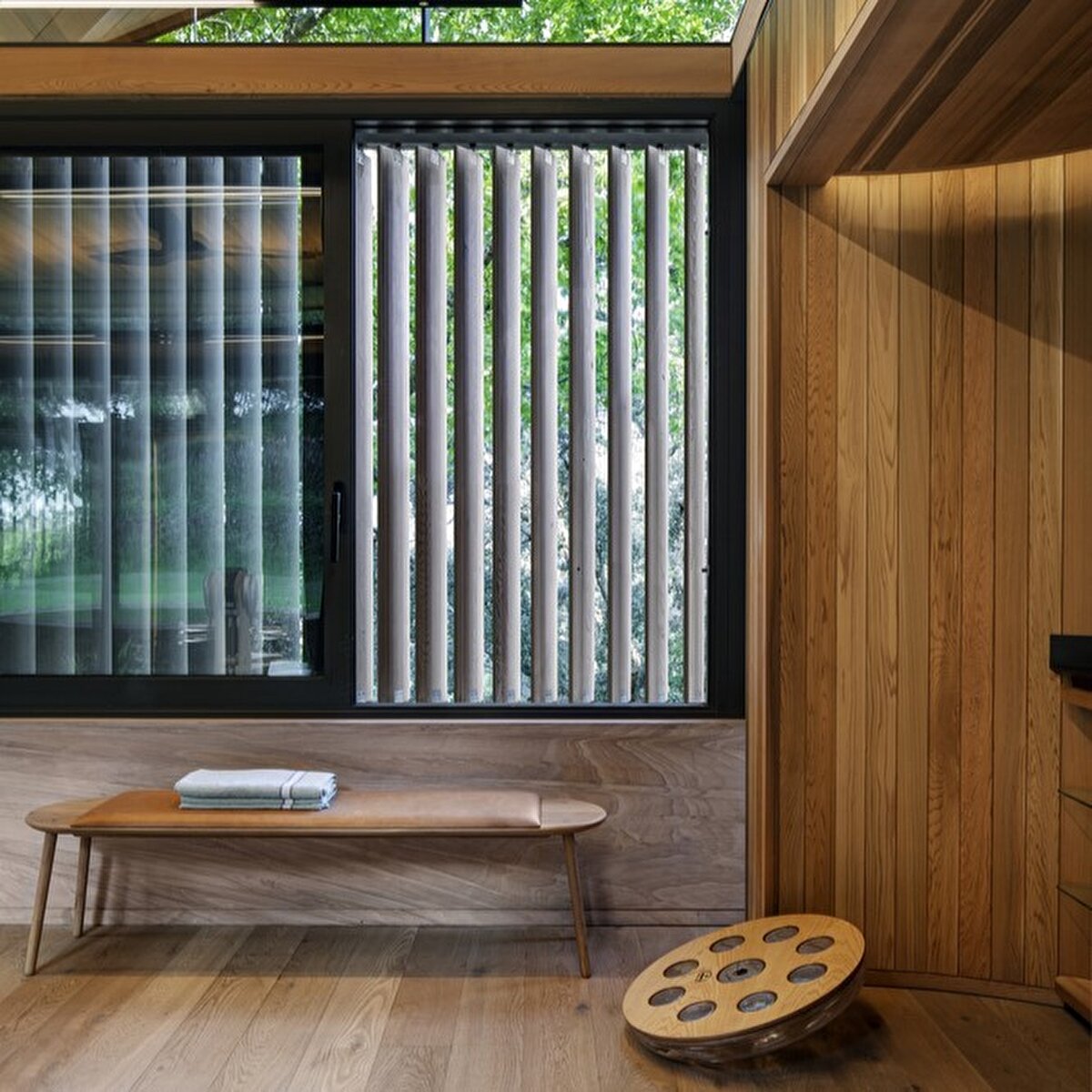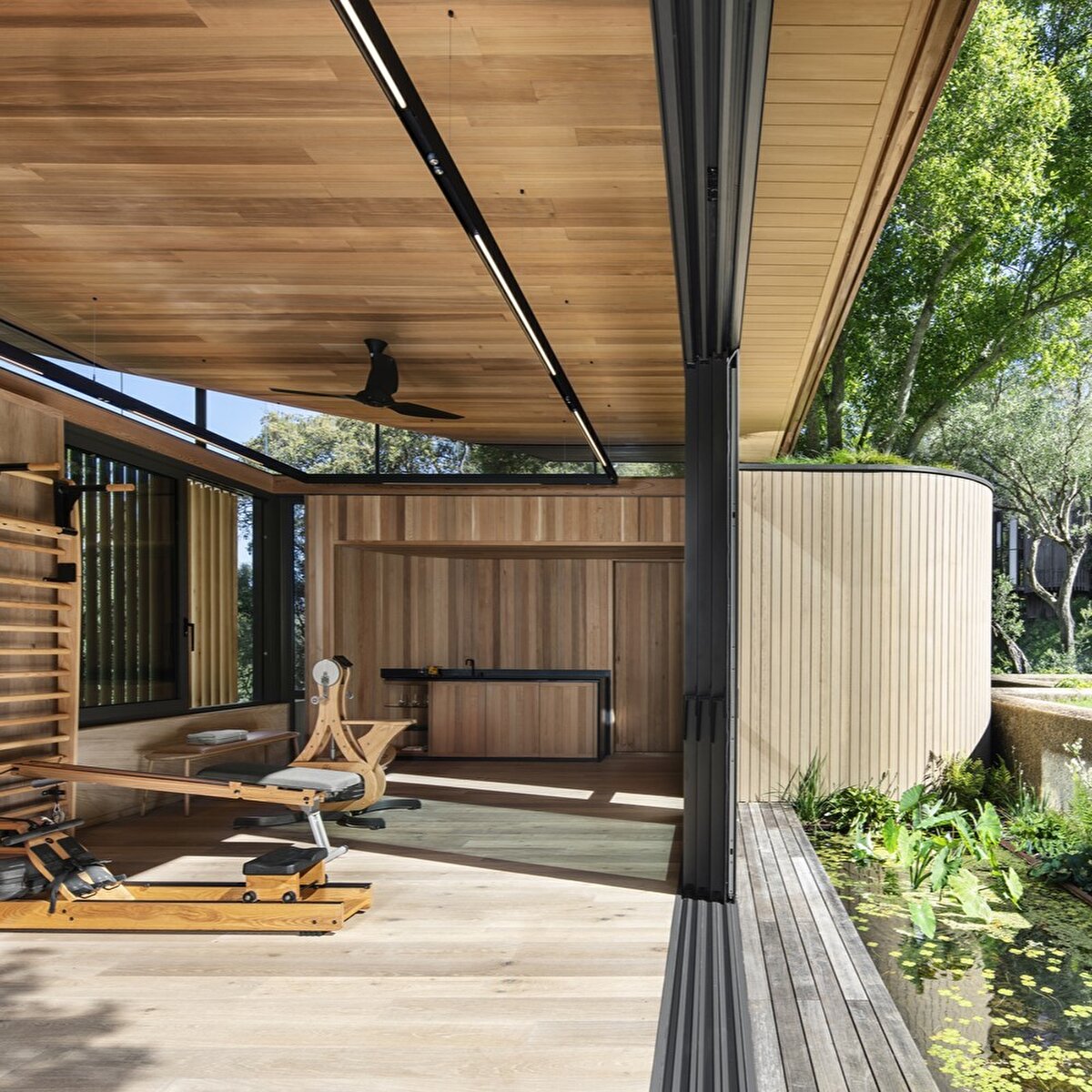 Spor salonu, bahçenin ana üst çimenliği ve altındaki park alanıyla etkileşime geçecek ve iç merdiven aracılığıyla altındaki misafir odasına bağlanabilece şekilde tasarlanıyor. Bu oda, yeni açık plan düzeni, kaplamaları ve mobilyalarıyla güncelleniyor.