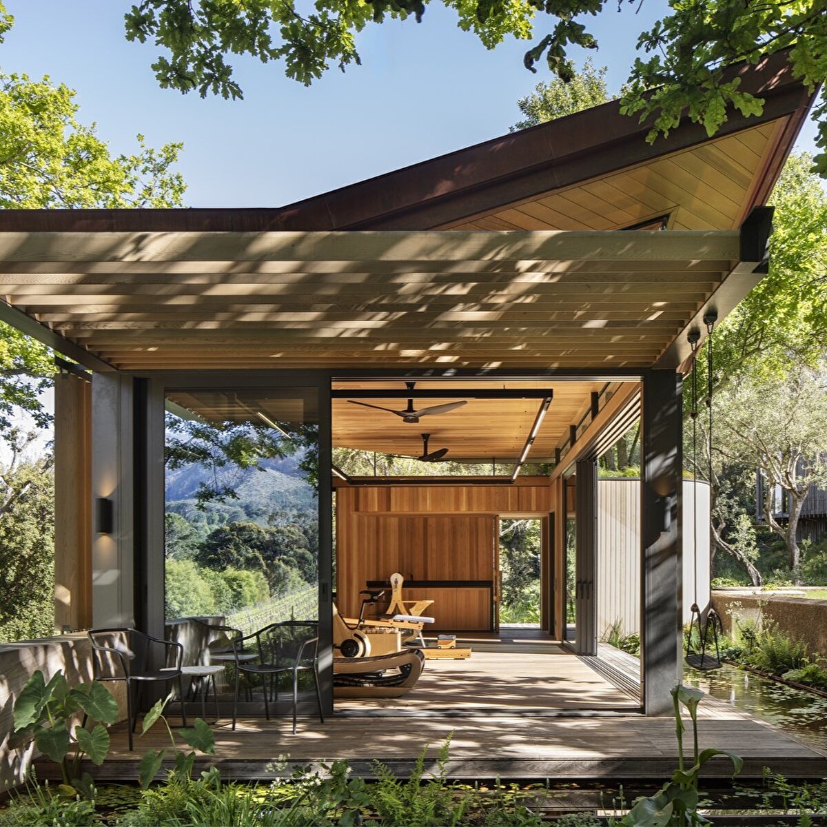 Spor salonunun iç malzemeleri, sedir tavanlar, kaba kereste zeminler ve pirinç dokunuşlarla binanın estetiğini devam ettiriyor. Aynı malzemeler, misafir evinin yenilenmesinde de kullanılıyor.