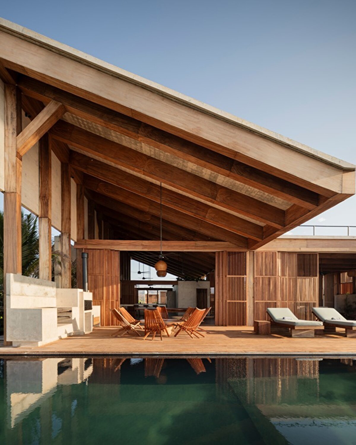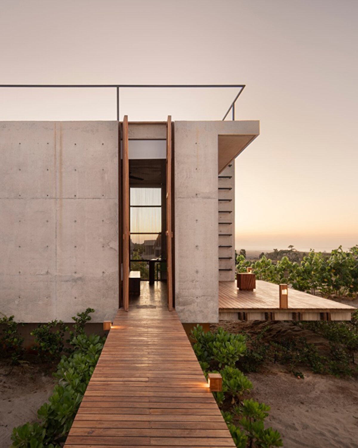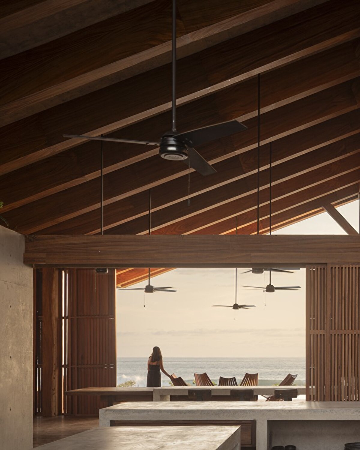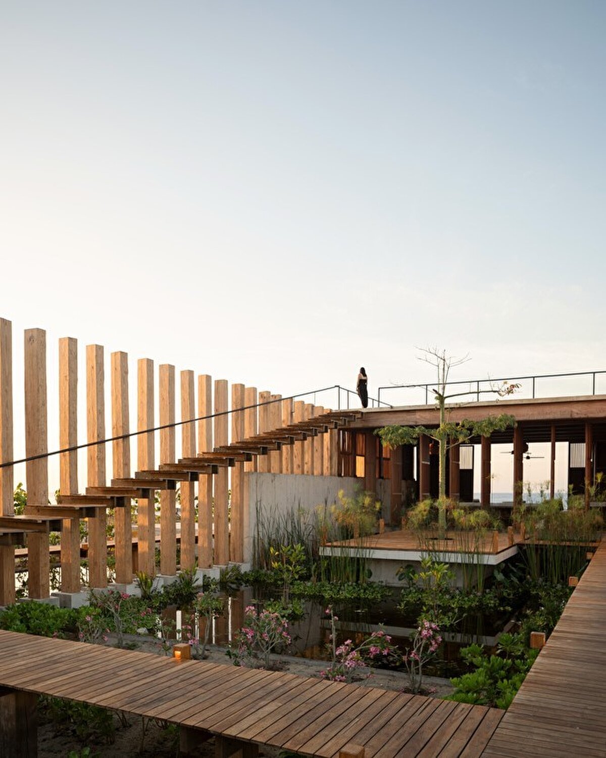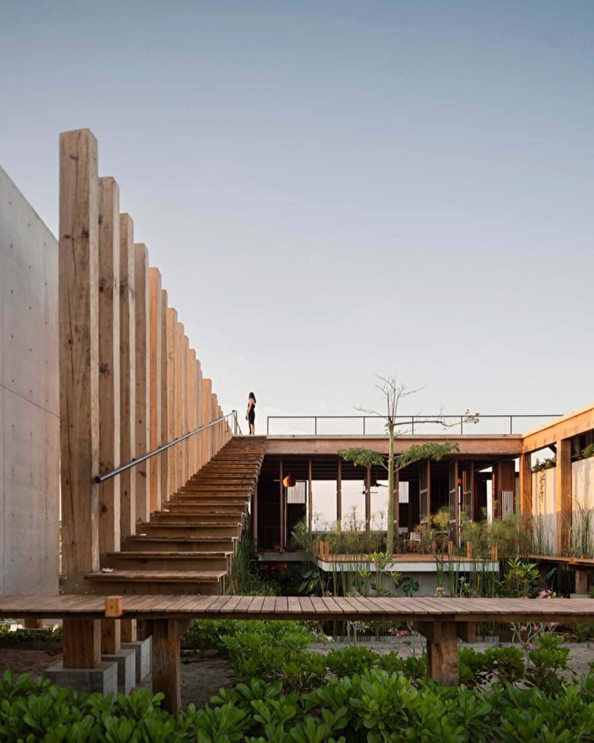Malzeme seçimi olarak yerel bağlama uygunluk ön planda tutuluyor; beton ve ahşap birlikte kullanılıyor. Doğal havalandırma, açıklıklar ve geçiş alanlarıyla destekleniyor, yapı kütleleri arasındaki geçişler köprü benzeri bağlantılarla sağlanıyor. Bu geçiş unsurları, modüller arasındaki mekânsal sürekliliği sağlarken yapıların çevreyle olan ilişkisini de açık hale getiriyor.