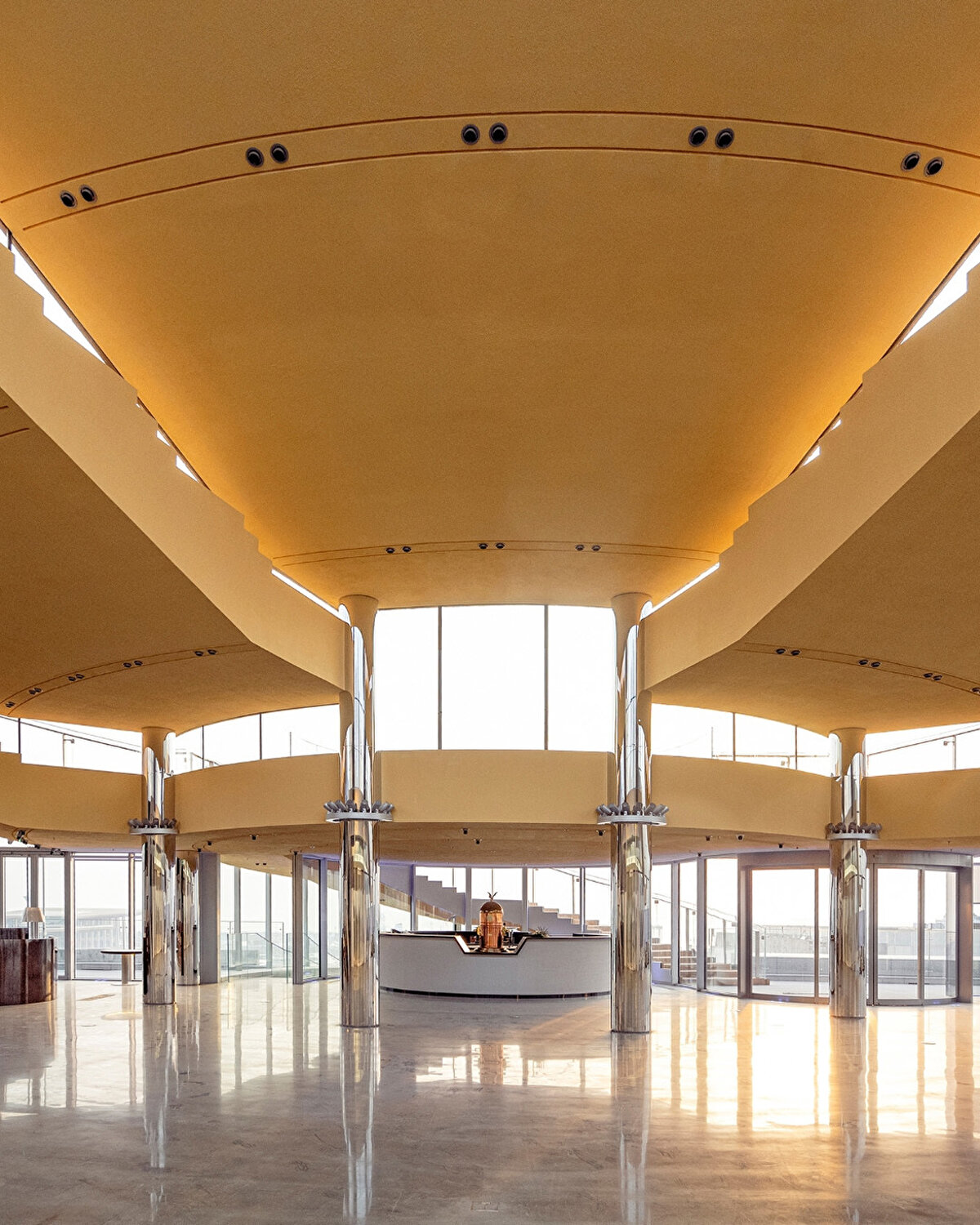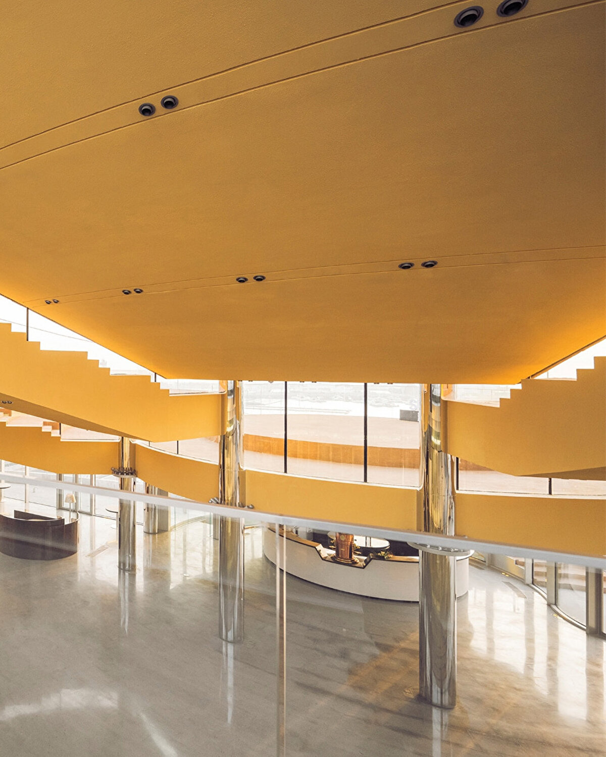Tasarım, hafif ve şeffaf yapısıyla mevcut mimariye minimal müdahale ederek hem bağımsız bir hacim hem de manzarayla bütünleşen bir arayüz olarak işlev görüyor. Mekansal çelik yapı sistemi ve hiperbolik paraboloid kabuk kullanımıyla yapısal verimlilik artırılıyor, Z şeklindeki kirişler ise ikincil destek ihtiyacını azaltıyor. Doğal ışığı karanlık salona taşıyan bu tasarım, sürdürülebilirlik odaklı; geri dönüştürülmüş EPDM parçacıklarının çatı kaplamasında kullanılması ve korten kaplı kapı çerçeveleriyle yerel taş cephelerin tercih edilmesi, hem estetik hem de iklim dayanıklılığı sağlıyor. SKYBOWL, halka açık bir buluşma noktası, kültürel etkinlik sahnesi ve ücretsiz performans alanı olarak hizmet veriyor, engelsiz körfez manzaraları sunarak kapsayıcı bir atmosfer oluşturuyor.