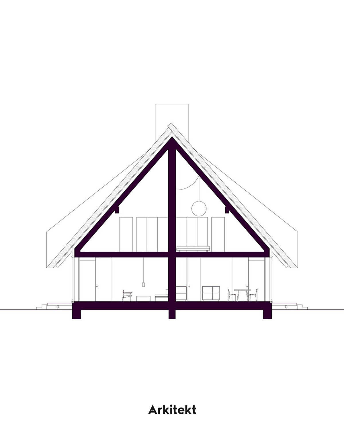 Zemin katta geniş bir oturma odası, yemek odası ve mutfak bulunuyor. Tavandan tabana sürgülü pencereler bahçeye açılıyor ve sazdan çatının manzarasını öne çıkarıyor. Üst katta banyo ve üçgen çatı uçlarında pencereli iki yatak odası bulunuyor. Yatak odaları arasında, giriş kapısının üzerindeki yuvarlak çatı katında küçük bir çalışma alanı yer alıyor. İkinci katta yer alan dar galeri odası ise yalnızca tavan penceresine sahip.