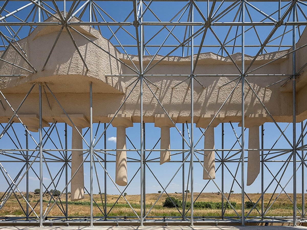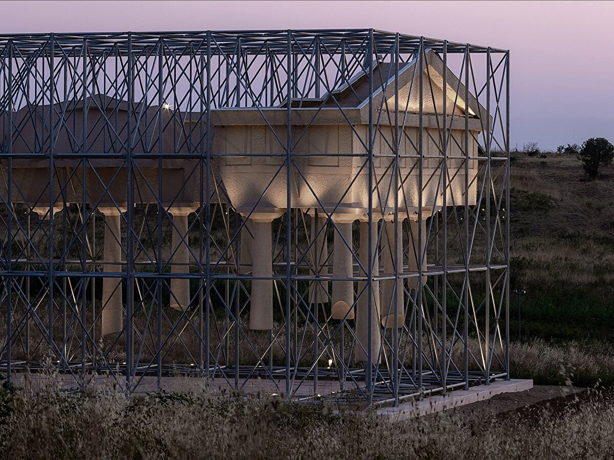 Located on the acropolis of the ancient city of Herakleia in southern Italy, the Dionysus Temple is being reimagined with a contemporary interpretation by Gijs Van Vaerenbergh Architects. This permanent installation in Policoro transforms the temple, which only has its foundations and altar remains, into a sculptural volume suspended within a steel grid structure. While traditionally the process of destruction is considered to occur from top to bottom, in this project the process is reversed, with the roof, upper wall sections, and column sections being the first layers to be reconstructed.
