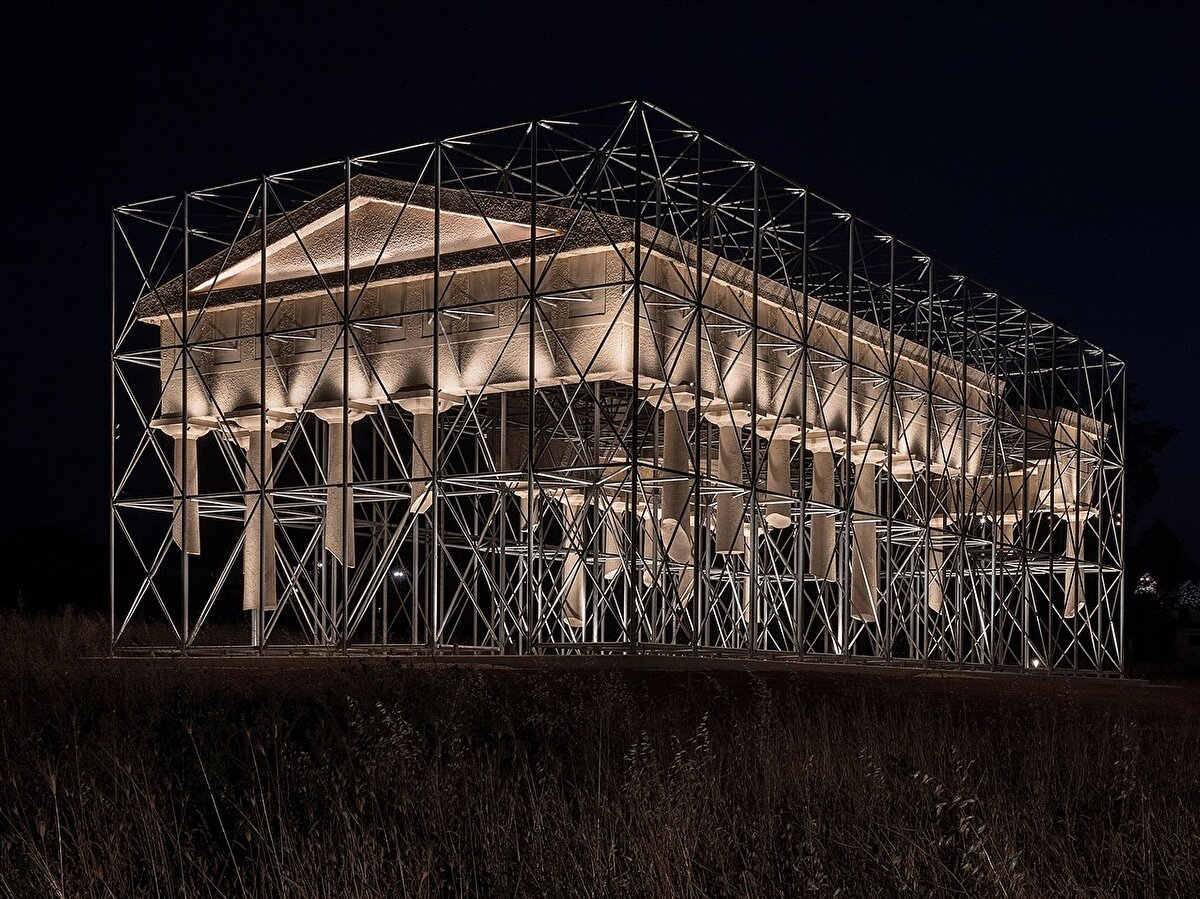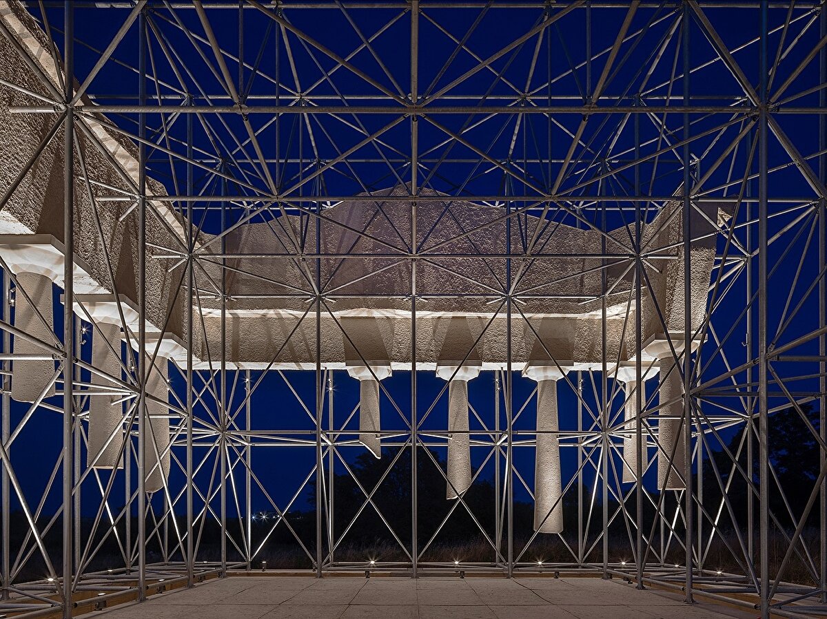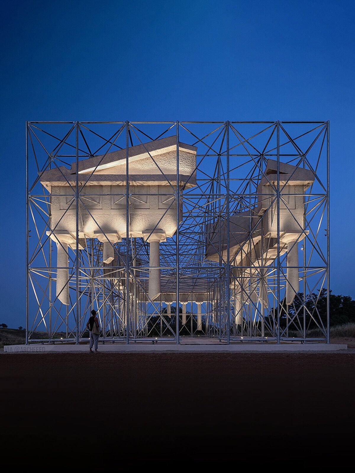 The Dionysus Temple, reimagined within a steel grid, offers a new perspective on archaeology