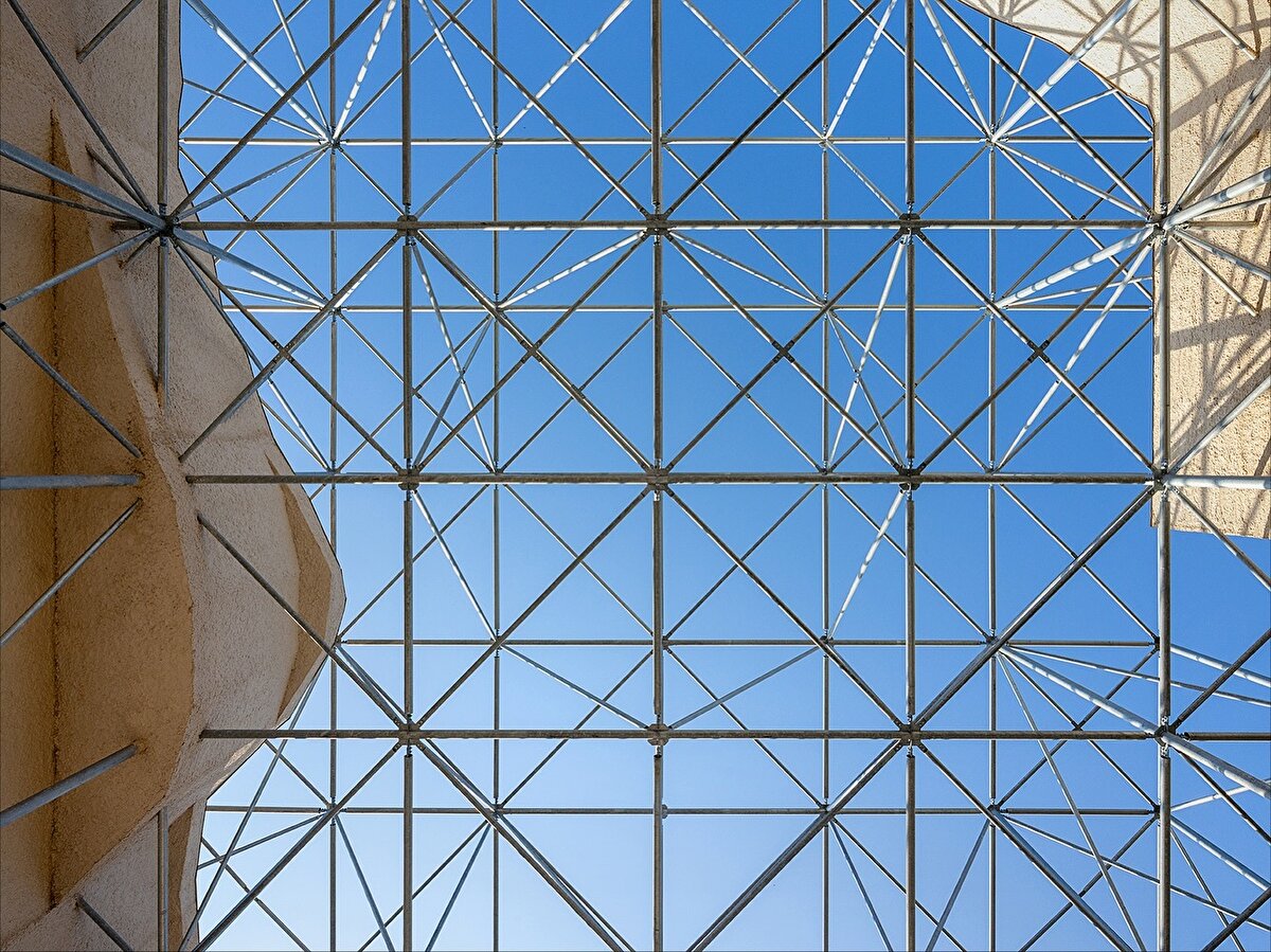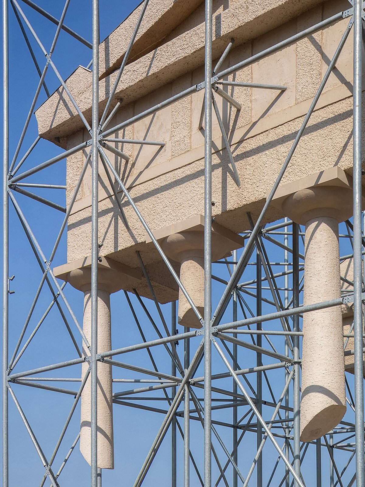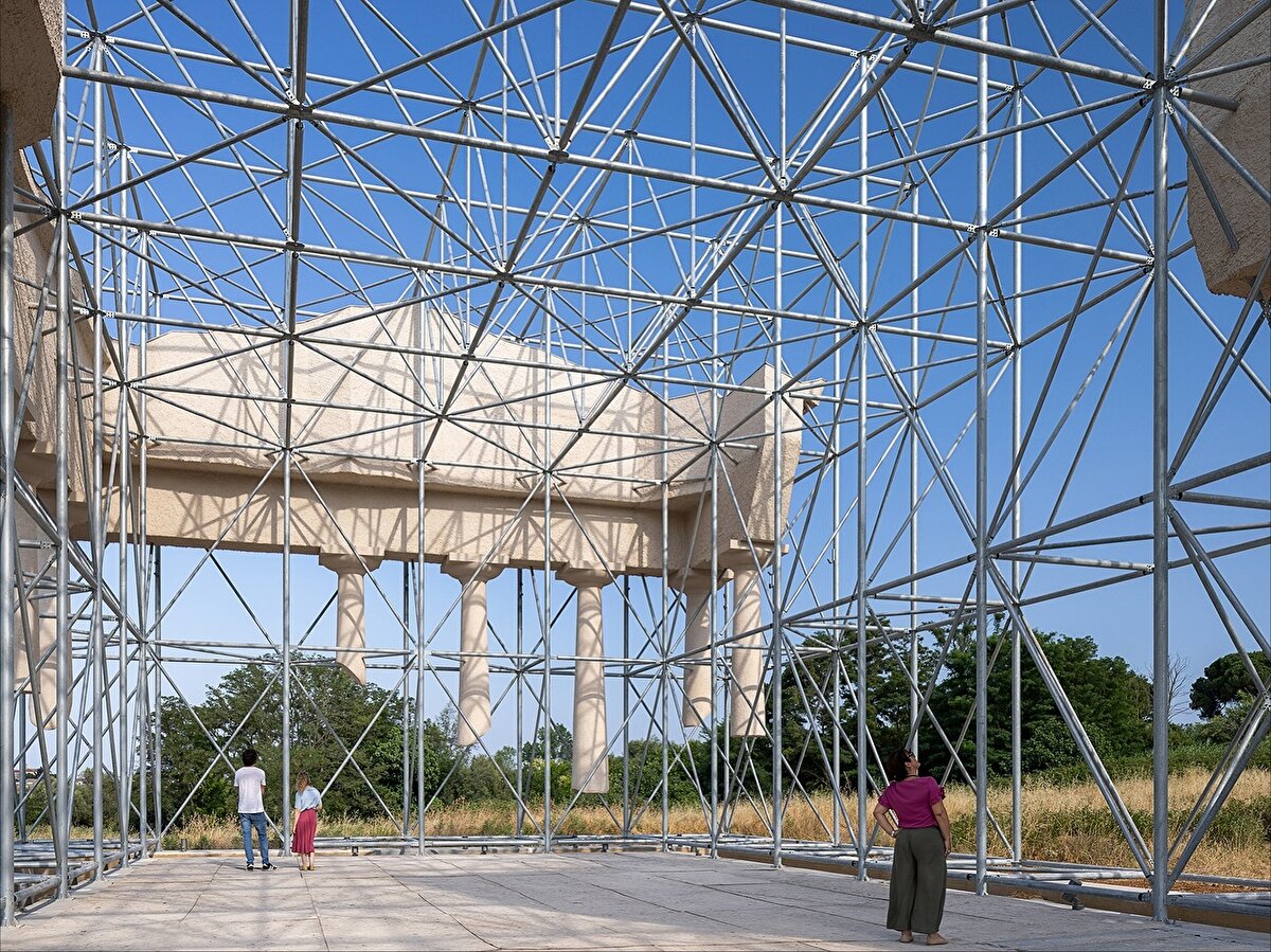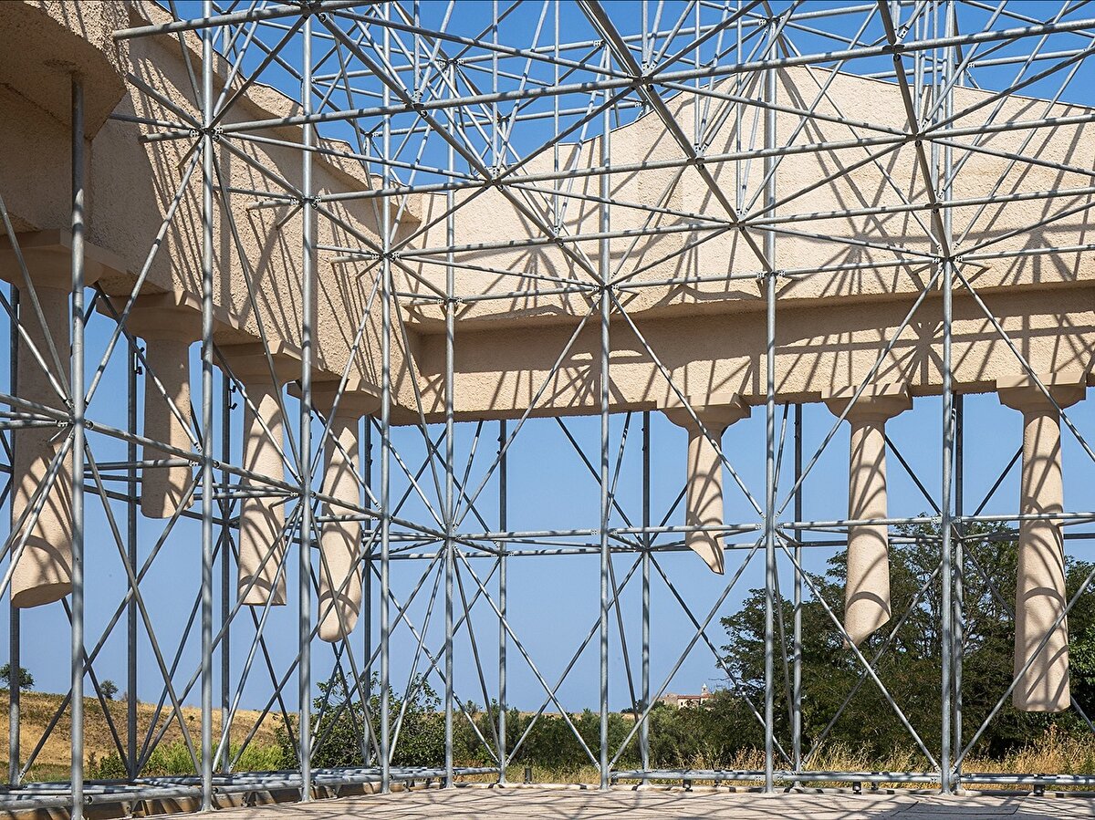 The Dionysus Temple, reimagined within a steel grid, offers a new perspective on archaeology