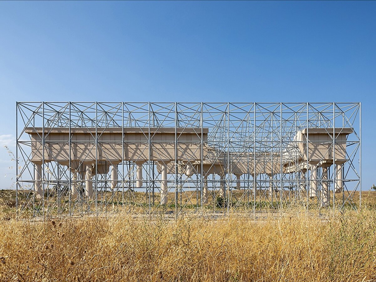 İtalya'nın güneyinde, Herakleia Antik Kenti'nin akropolünde yer alan Dionysos Tapınağı, Gijs Van Vaerenbergh Architects tarafından çağdaş bir yorumla yeniden sahneleniyor. Policoro'da konumlanan bu kalıcı enstalasyon, yalnızca temelleri ve sunak kalıntıları bulunan tapınağı, çelik bir ızgara yapı içerisinde asılı duran heykelsi bir hacme dönüştürüyor. Geleneksel olarak yıkım sürecinin yukarıdan aşağıya gerçekleştiği kabul edilirken, bu projede süreç tersine çevrilerek çatı, üst duvar parçaları ve sütun bölümleri yeniden inşa edilen ilk katmanlar olarak kurgulanıyor. @gijsvanvaerenbergh