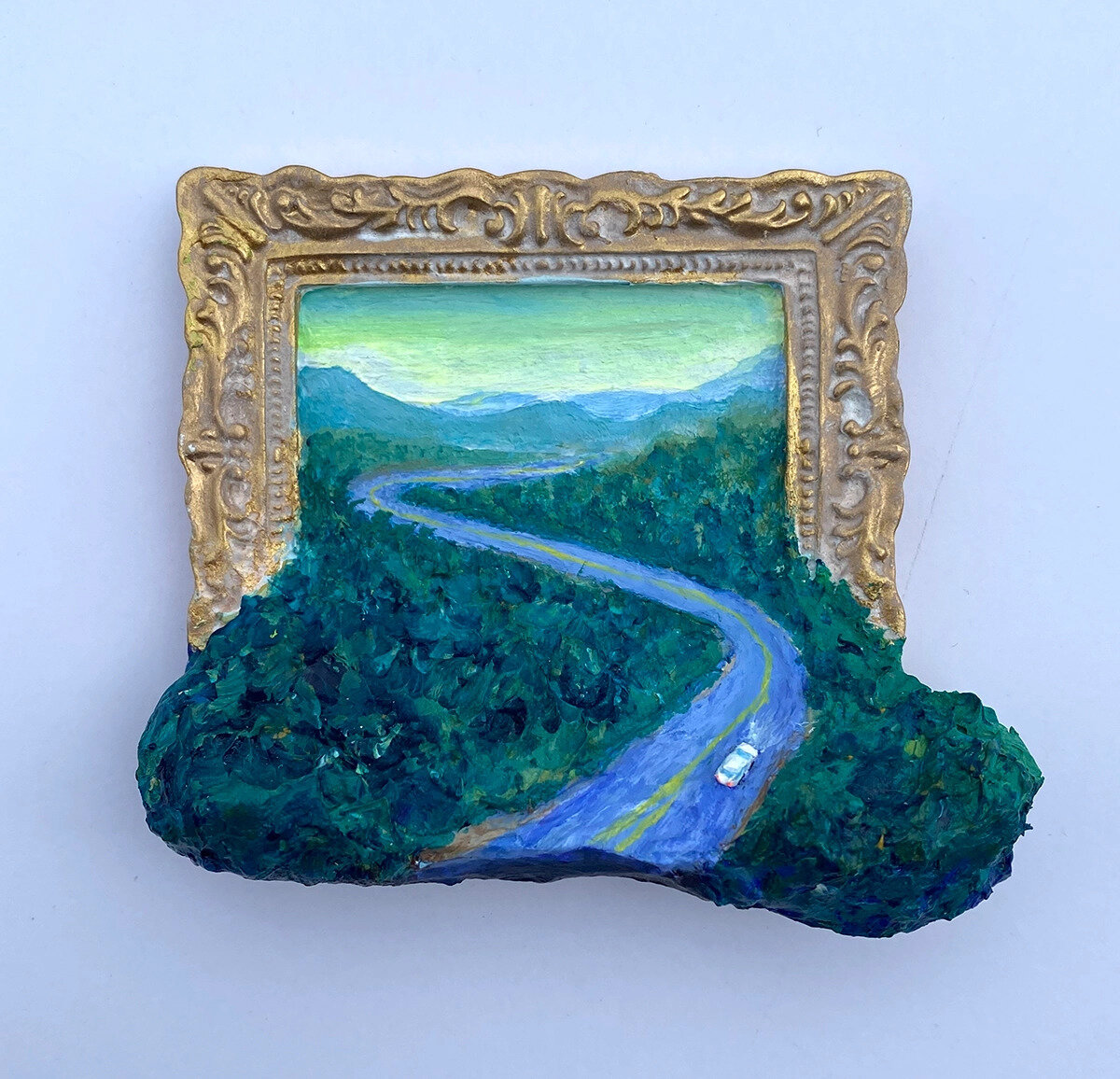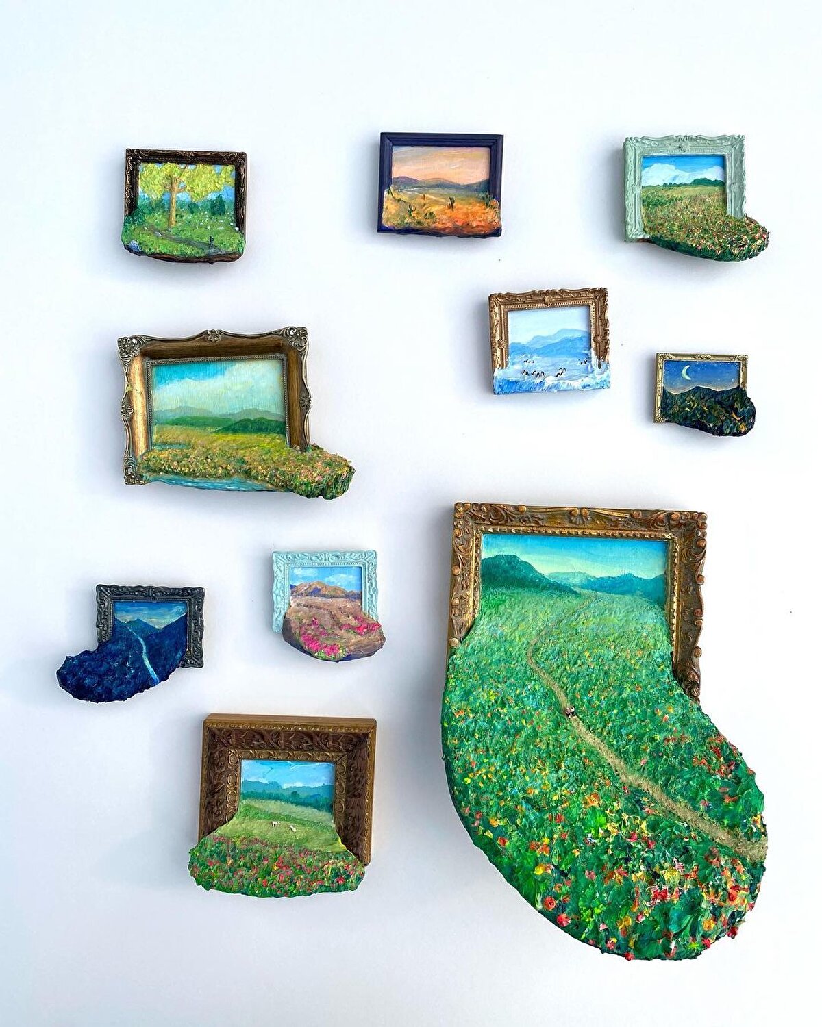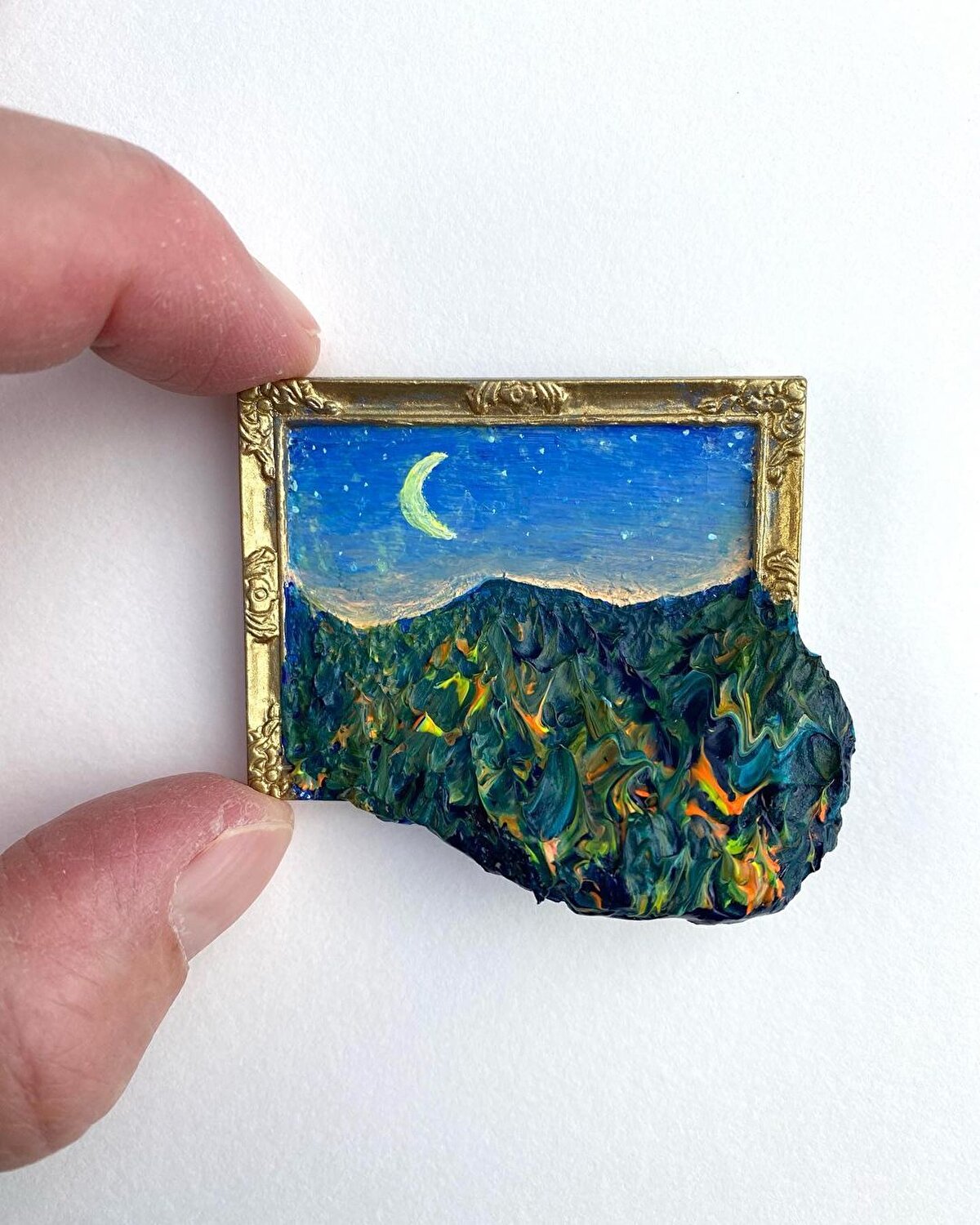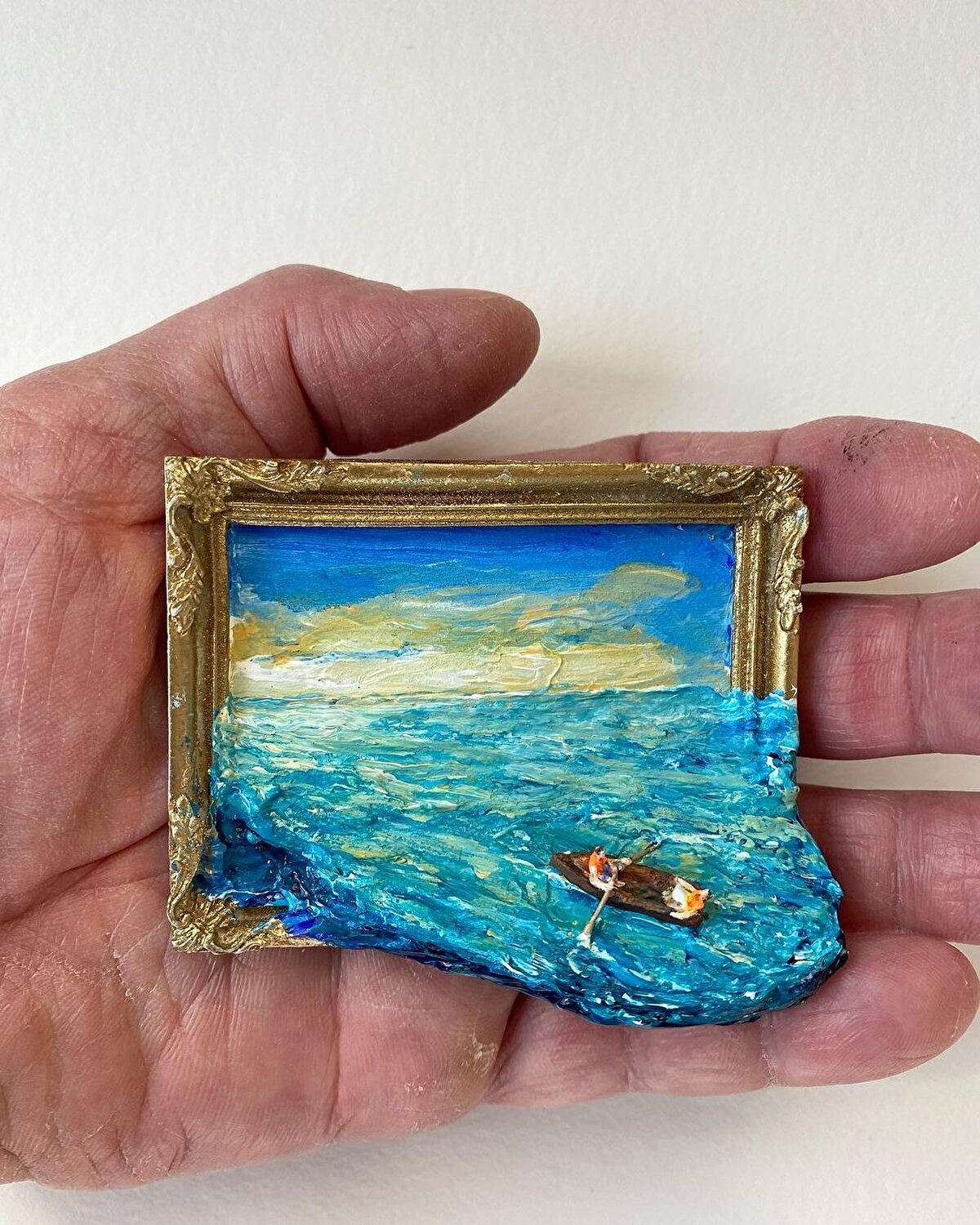 Barry Hazard insan elinin içine sığabilecek ölçekte geniş manzaraları tasvir eden minyatür resimler oluşturuyor. Hazard, kalın akrilik boya ile heykelsi manzaralar oluştururken yabani çiçekler, kumsallar ve karla kaplı zirveler gibi tablonun dışına çıkan ayrıntılar ekliyor.