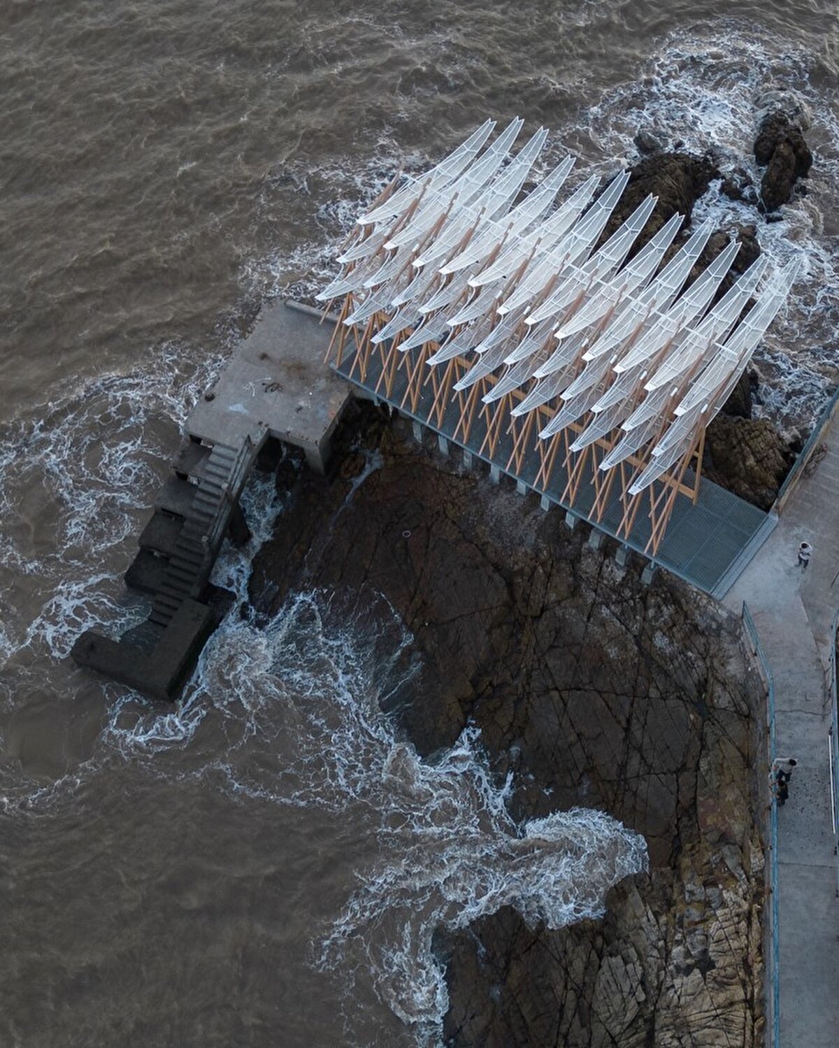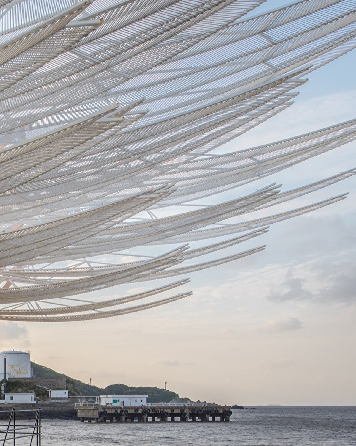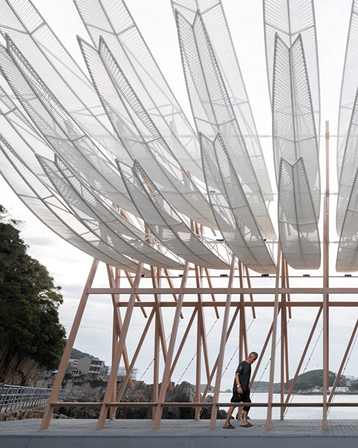 2023 yılında GN Architects @gnarchitects_official tarafından tasarlanan pavyon, Çin'in Chaishan Adası'nda, eski bir kargo iskelesi üzerinde konumlanıyor. Rüzgar gücüyle hareket eden 36 kanadıyla, denizle uyum içinde salınarak mekâna dinamik bir ritim kazandırıyor. Prefabrik olarak üretilip adaya taşınan yapı, korozyona dayanıklı çelik ve balıkçılık halatları kullanılarak uzun ömürlü olacak şekilde tasarlanıyor.