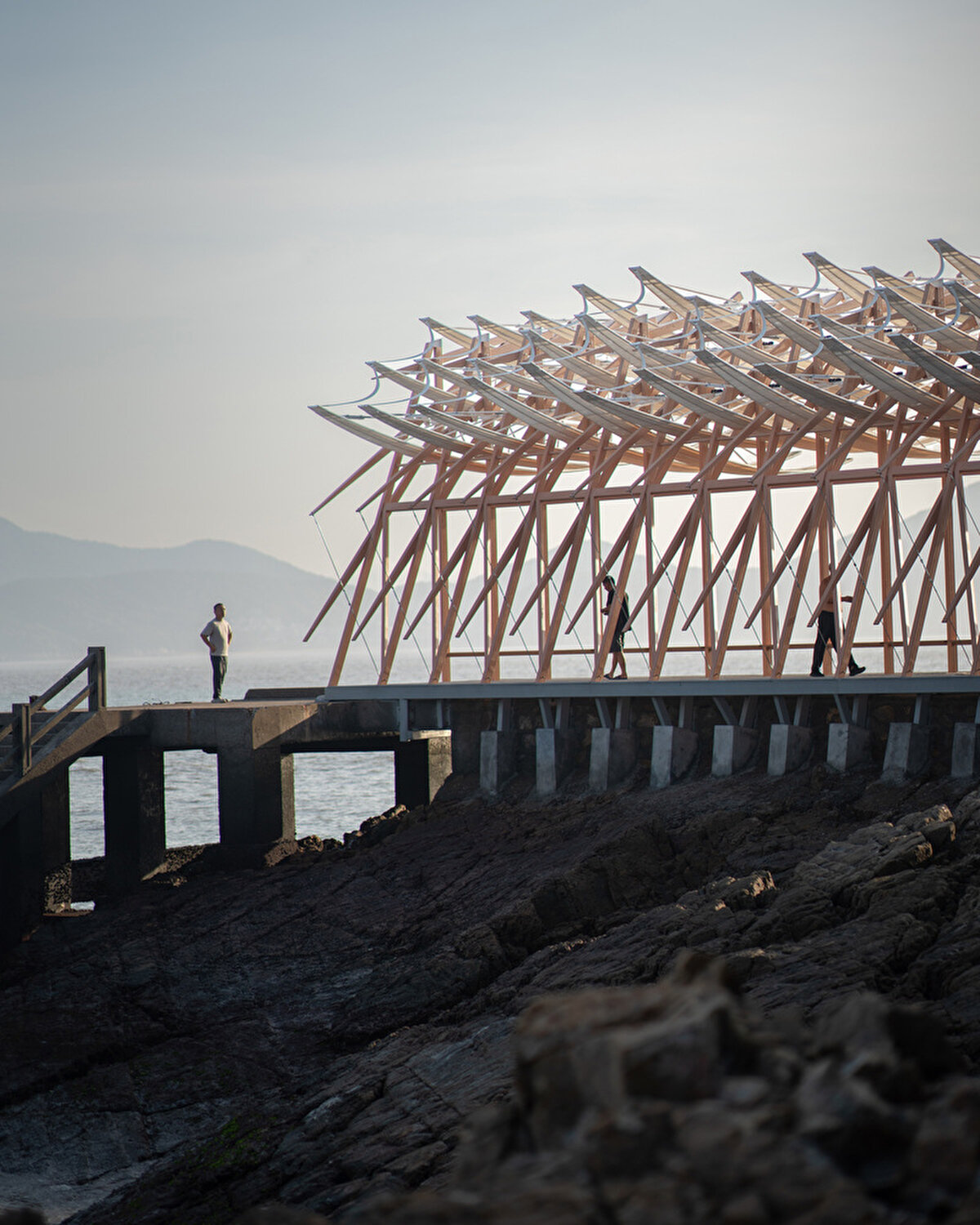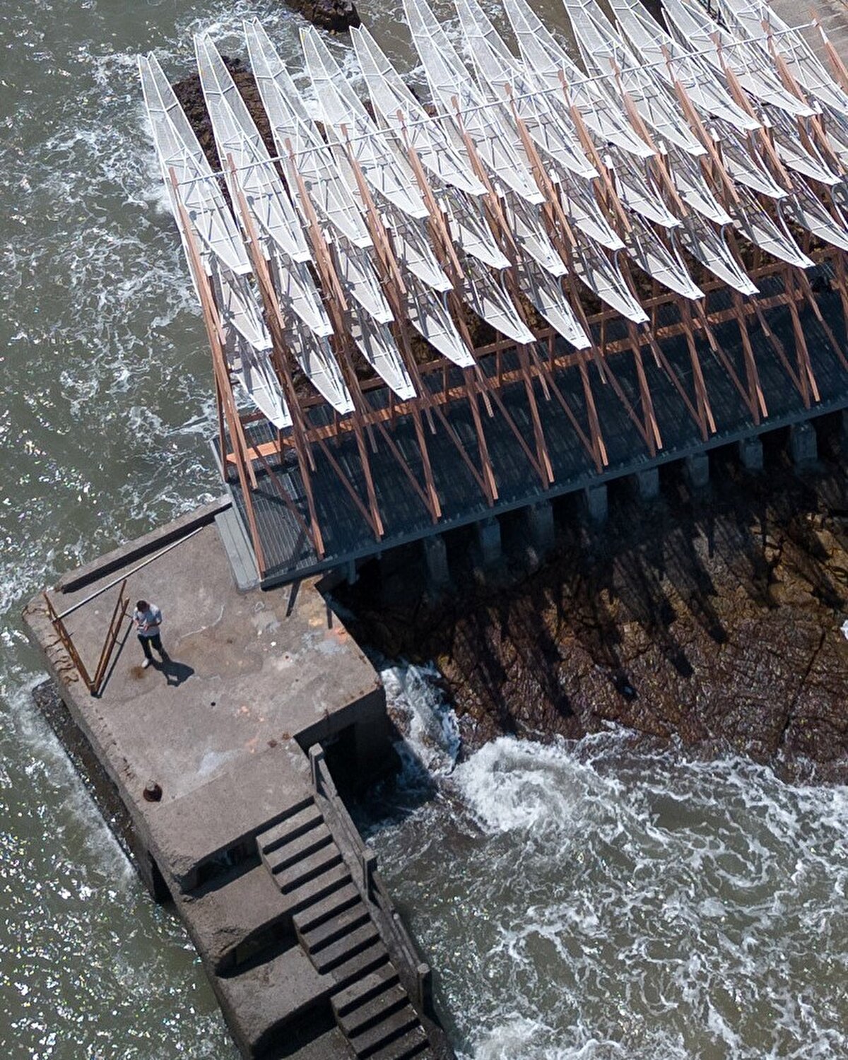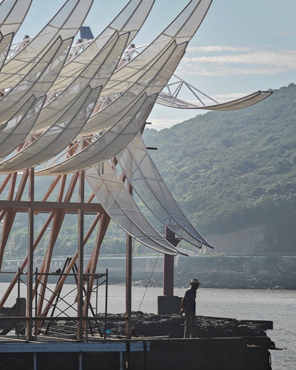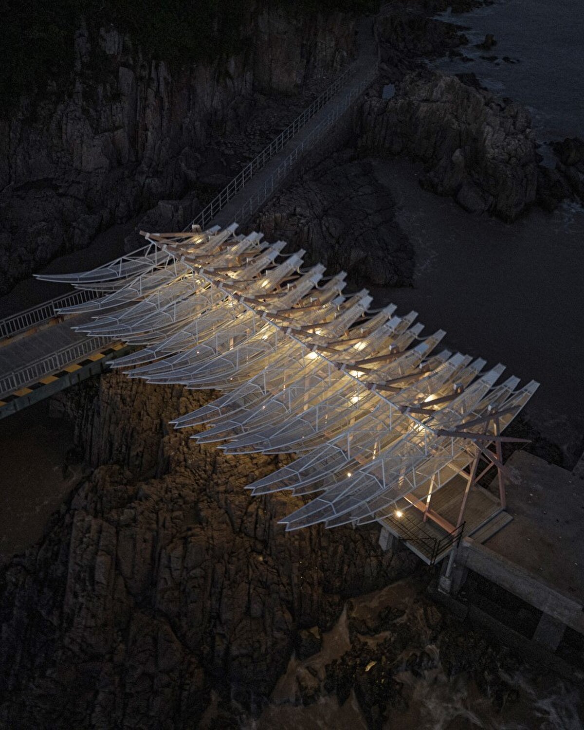 2023 yılında GN Architects @gnarchitects_official tarafından tasarlanan pavyon, Çin'in Chaishan Adası'nda, eski bir kargo iskelesi üzerinde konumlanıyor. Rüzgar gücüyle hareket eden 36 kanadıyla, denizle uyum içinde salınarak mekâna dinamik bir ritim kazandırıyor. Prefabrik olarak üretilip adaya taşınan yapı, korozyona dayanıklı çelik ve balıkçılık halatları kullanılarak uzun ömürlü olacak şekilde tasarlanıyor.
