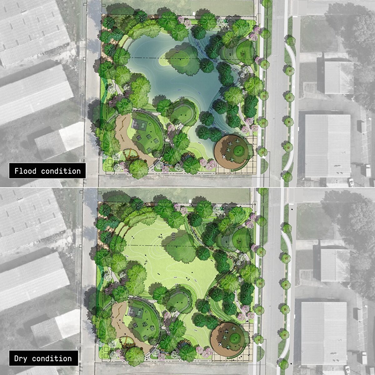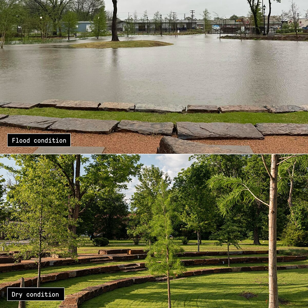 Sadece 1.7 dönüm büyüklüğündeki bu alan, ani yağışlarda 1.5 milyon galon suyu geçici olarak depolayabiliyor. Özellikle son yıllarda Tucker Creek ve Arkansas Nehri çevresinde artan sel riskleri düşünüldüğünde, bu işlev kritik bir rol üstleniyor.