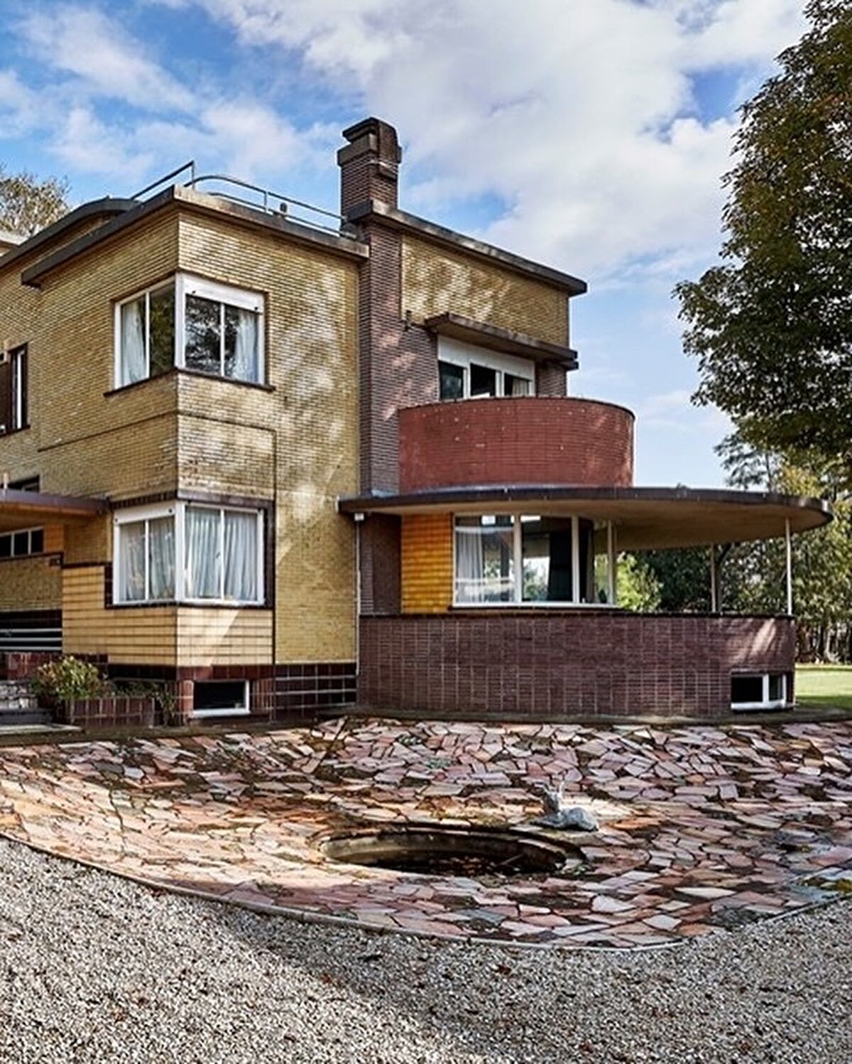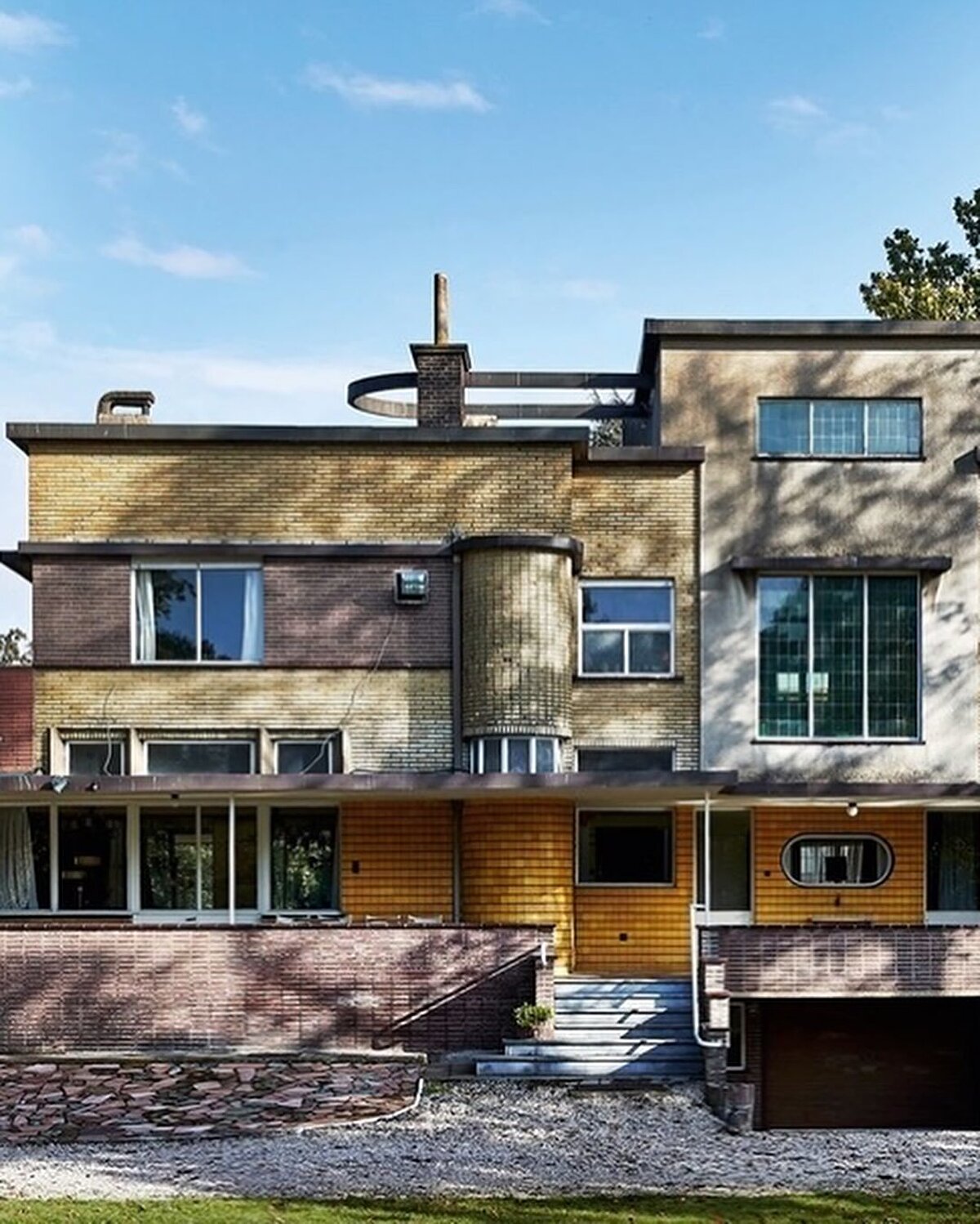 Reflecting the modernist trends of the 1930s, Villa Gaverzicht was designed by Gentiel Van Eeckhoutte and completed in 1939. The structure, which sits on a rough stone base, evokes the 'pakketbootvilla' typology with its rounded projections and strip windows. The ochre and earth-toned bricks, together with the metal railings, create a balanced composition on the façade.
