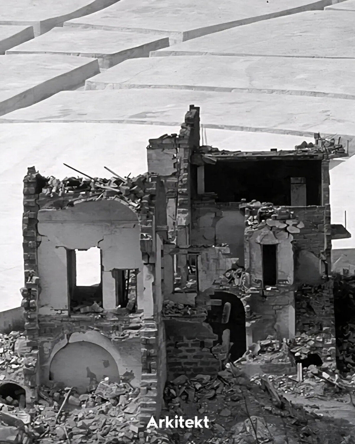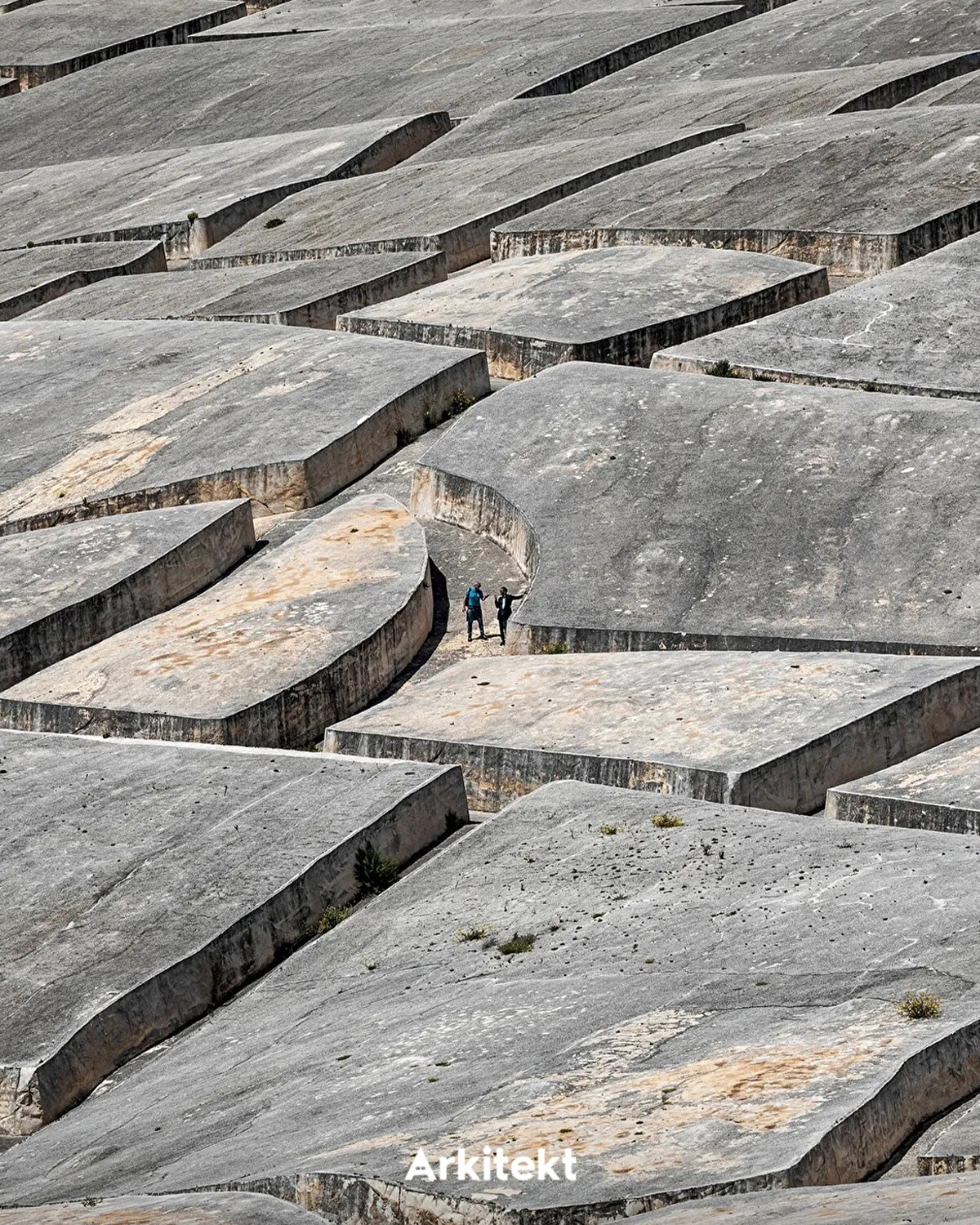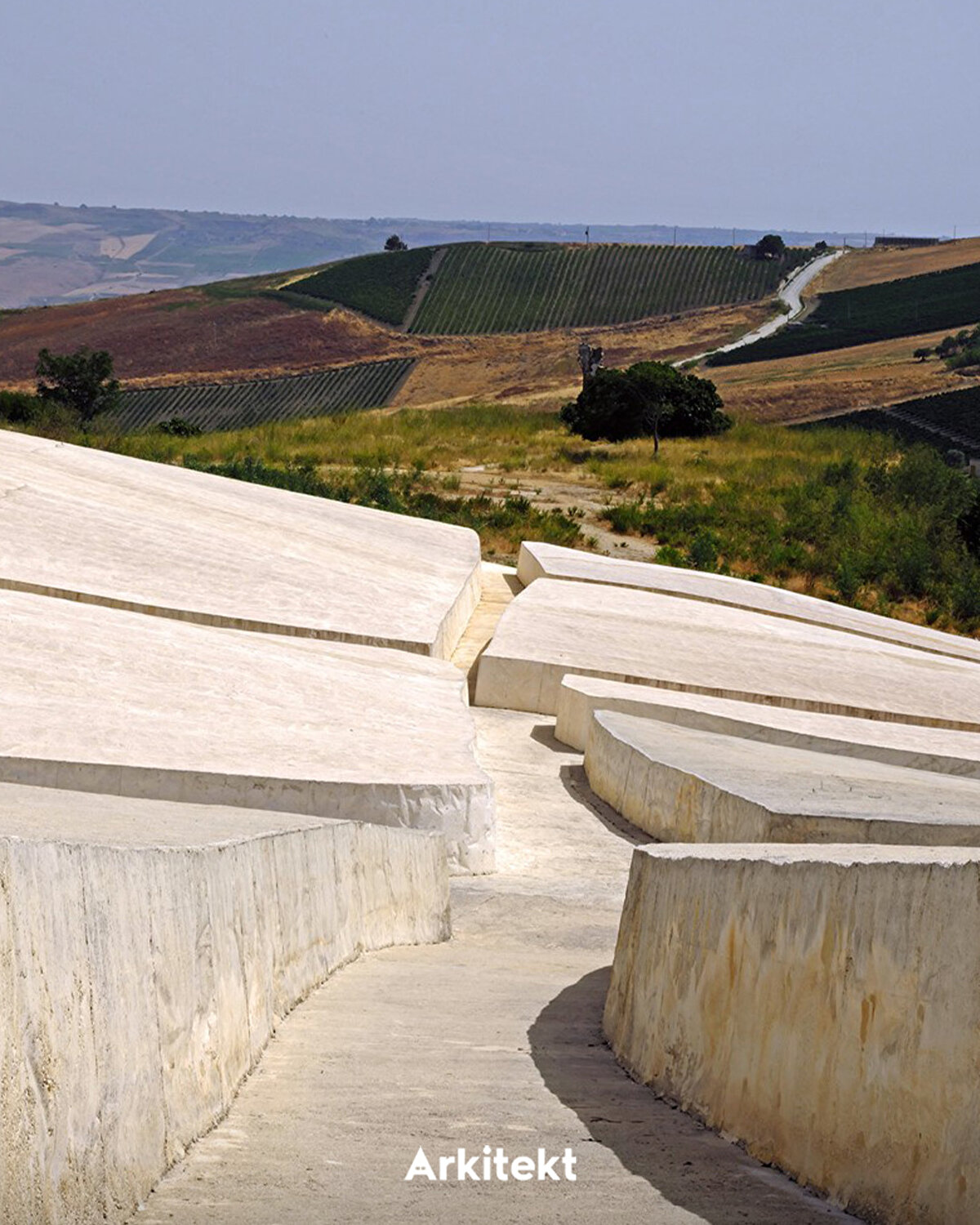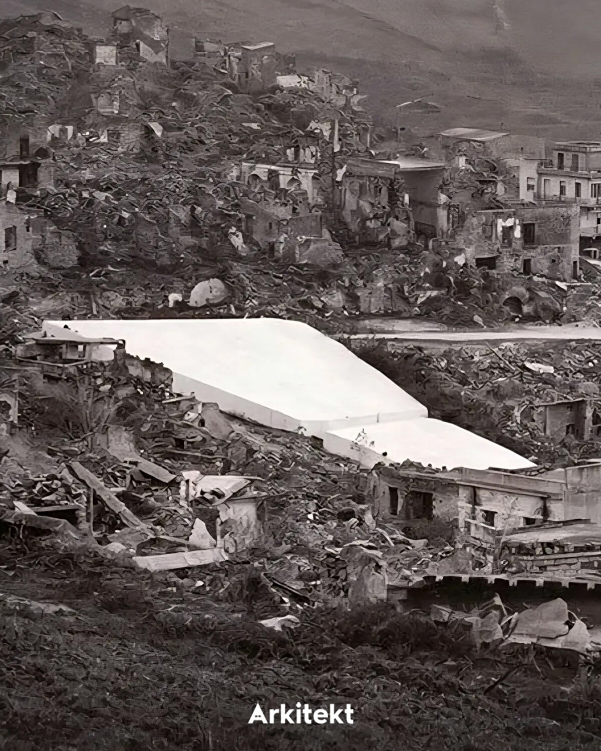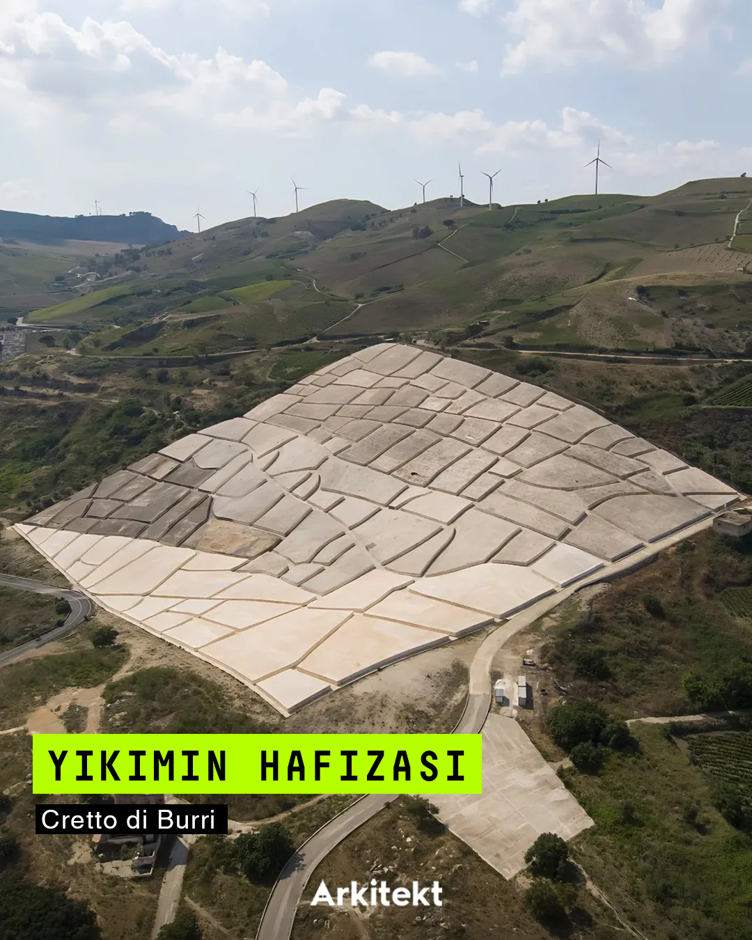 1968'de İtalya Belice Vadisi'nde meydana gelen deprem, Gibellina kentini tamamen yıkıyor ve kent başka bir yerde yeniden kuruluyor. Eski kentin kalıntıları üzerinde ise Alberto Burri, 1984'te Cretto di Burri adlı anıt çalışmasını başlatıyor. Sanatçı, kentin sokak dokusunu koruyarak kalıntıları 1,6 metre yüksekliğinde beyaz beton bloklarla kaplıyor. Ortaya çıkan çatlaklı yüzey, hem kentin eski planını takip ediyor hem de 85.000 m²'lik ölçekte bir arazi sanatına dönüşüyor. Beton bloklar arasındaki 2–3 metre genişliğindeki koridorlar, eski sokakları belirginleştiriyor. Çalışma, hem kentin özgün morfolojisini görünür kılıyor hem de afet sonrası mekânsal hafızayı somutlaştırıyor. - In 1968, an earthquake in Italy's Belice Valley completely destroyed the town of Gibellina, which was subsequently rebuilt elsewhere. On the ruins of the old town, Alberto Burri began his monumental work Cretto di Burri in 1984. The artist preserved the town's street layout by covering the ruins with white concrete blocks 1.6 meters high. The resulting cracked surface both follows the old city plan and transforms into a 85,000 m² land art installation. The 2–3-meter-wide corridors between the concrete blocks highlight the old streets. The work both makes the city's original morphology visible and solidifies the spatial memory after the disaster.