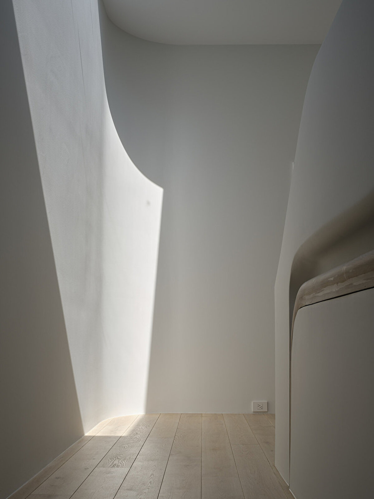 İç mekanda ışık ve gölgenin dansı, derinlik hissi oluşturuyor. Dış cephenin organik yapısı, iç mekanda da devam ederek tavanlar ve mimari detaylarla uyum sağlıyor. Örneğin, kapı kolları ve korkuluklar, duvarın içine oyularak ışığın akışını vurguluyor ve iç mekanda boyutsal bir derinlik hissi oluşturuyor. Sonuç olarak, sakin ve ferah bir iç mekanda, çağdaş sanat koleksiyonu için mükemmel bir ortam oluşuyor.