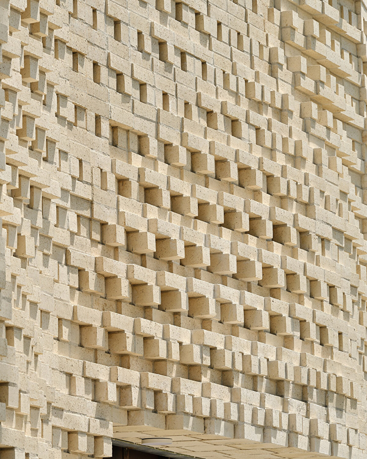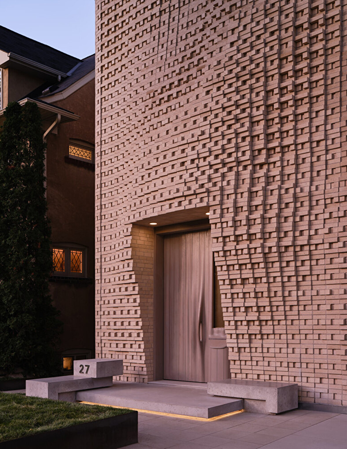 Larry Poons'un eserlerinden ilham alan cephenin deseni, tekrarlanan beş tuğladan oluşan bir modülasyona dayanıyor. Optik etki, tek renkli tuğlaların farklı şekillerde kullanılmasıyla sağlanıyor; bu da tasarımın geleneksel formlara meydan okuyarak Gürcü evinin zarafetini modern bir şekilde yansıtmasına olanak tanıyor.