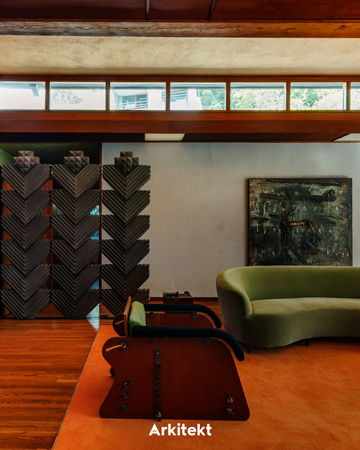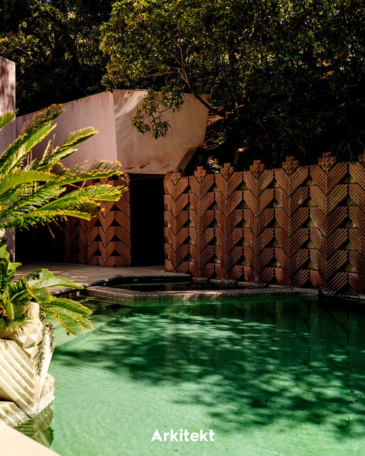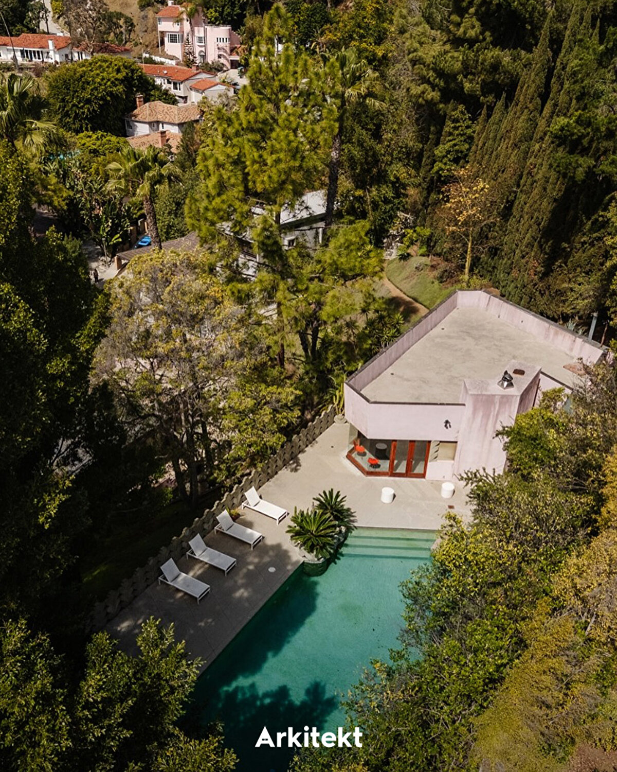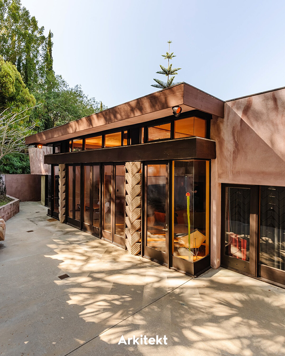 The Hollywood Hills estate where David Lynch lived for over 35 years consists of five adjoining parcels and includes three residences along with various auxiliary structures added over time. At the heart of the property is the Beverly Johnson House, a 1963 residence designed by Lloyd Wright, the son of Frank Lloyd Wright. Recognized as an example of mid-century modern architecture, the house is distinguished by its glass walls, open-plan layout, and seamless flow between indoor and outdoor spaces. Chevron-patterned concrete blocks frame the pool, fireplace, and hillside walls, creating dynamic light-and-shadow effects. With the later acquisition of neighboring properties, the estate gradually took its current form.