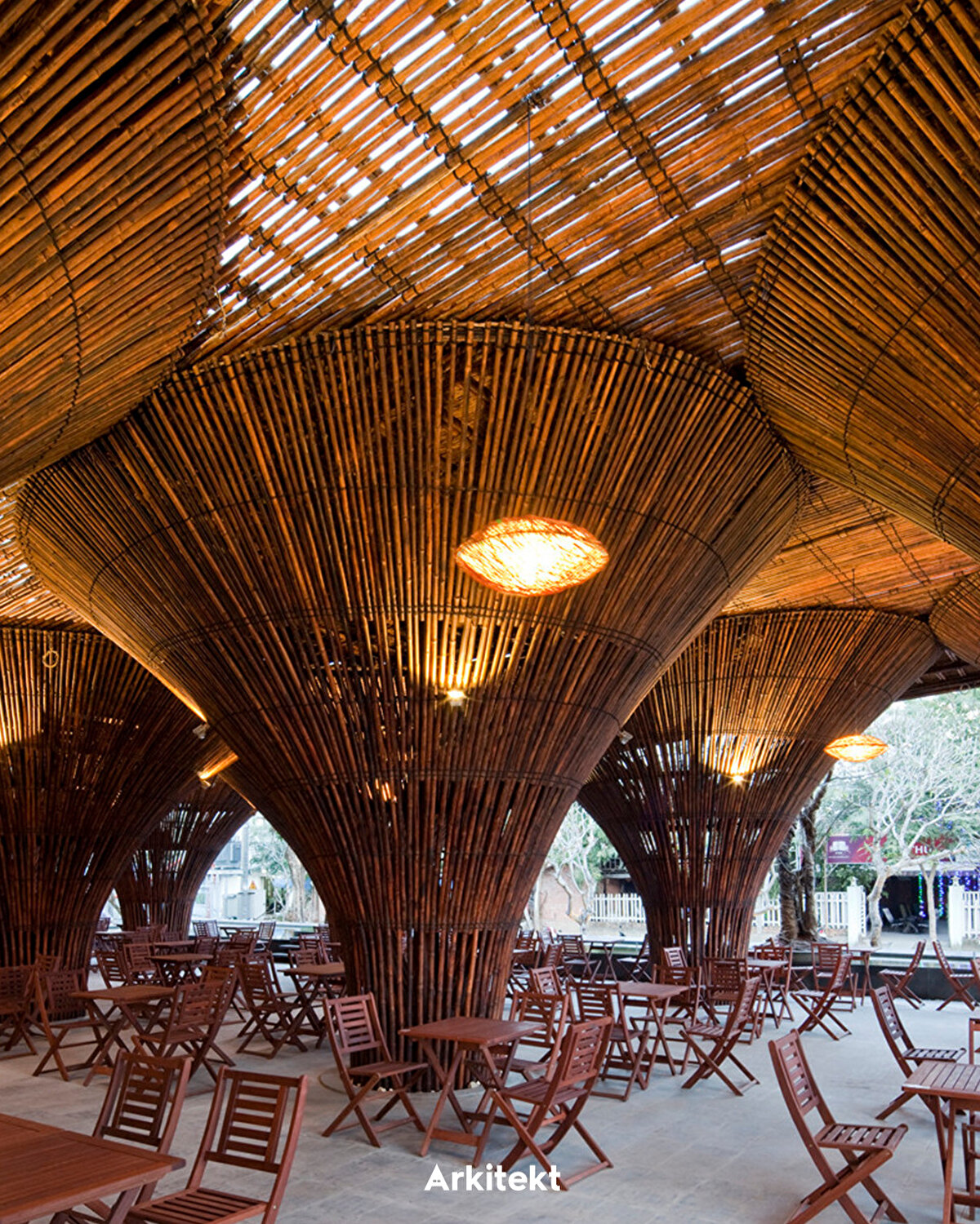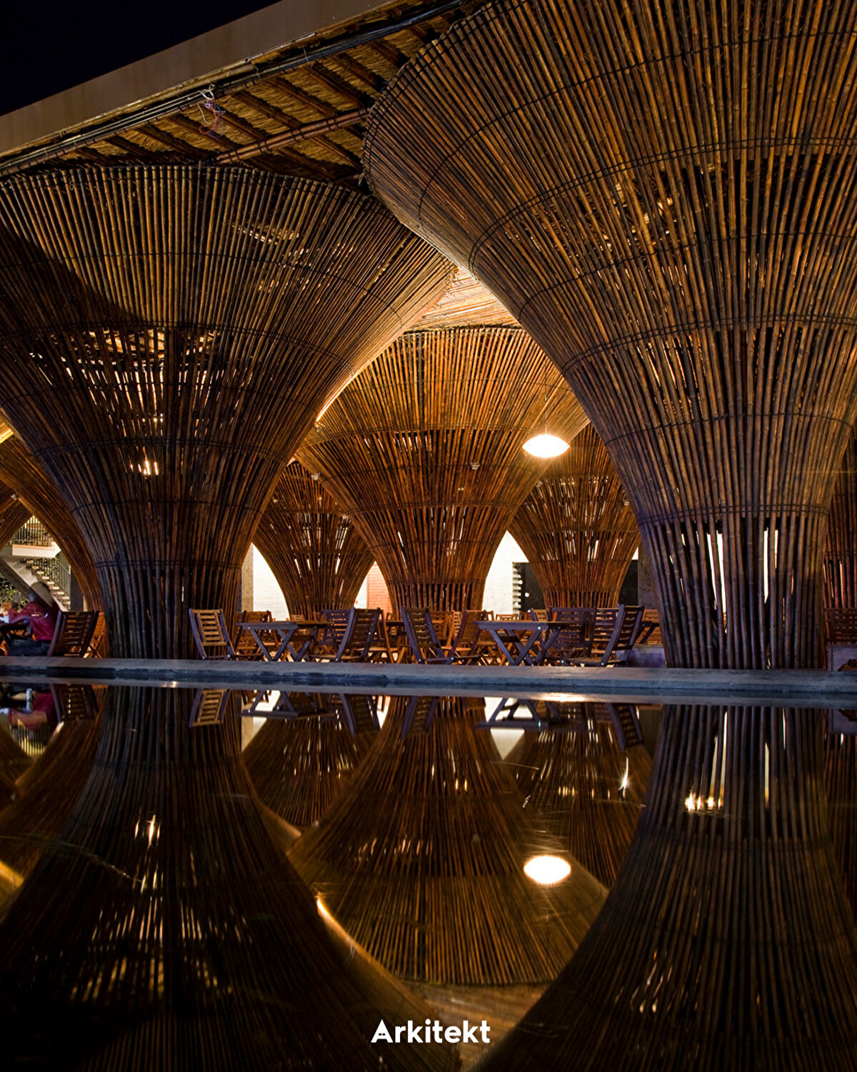 Bir otel kompleksinin parçası olarak tasarlanan proje, 15 ters koni şeklinde bambu yapıdan oluşuyor.