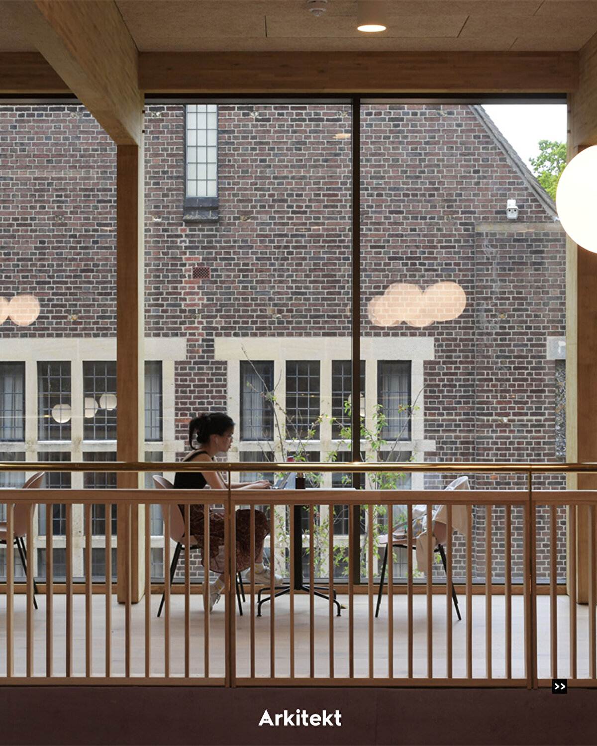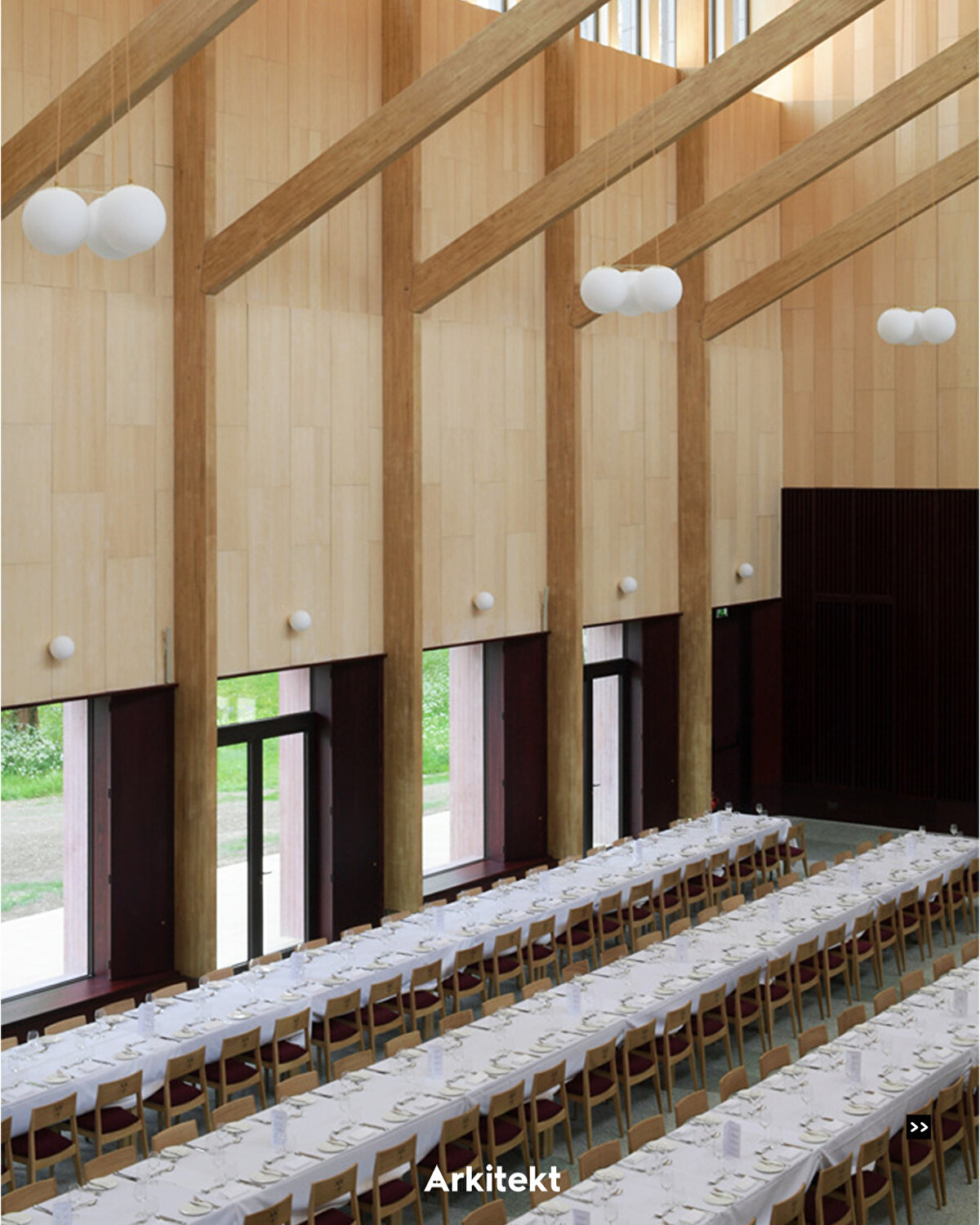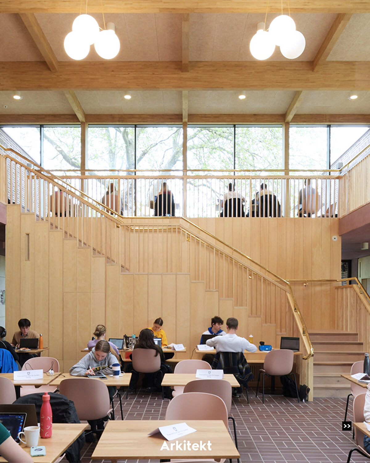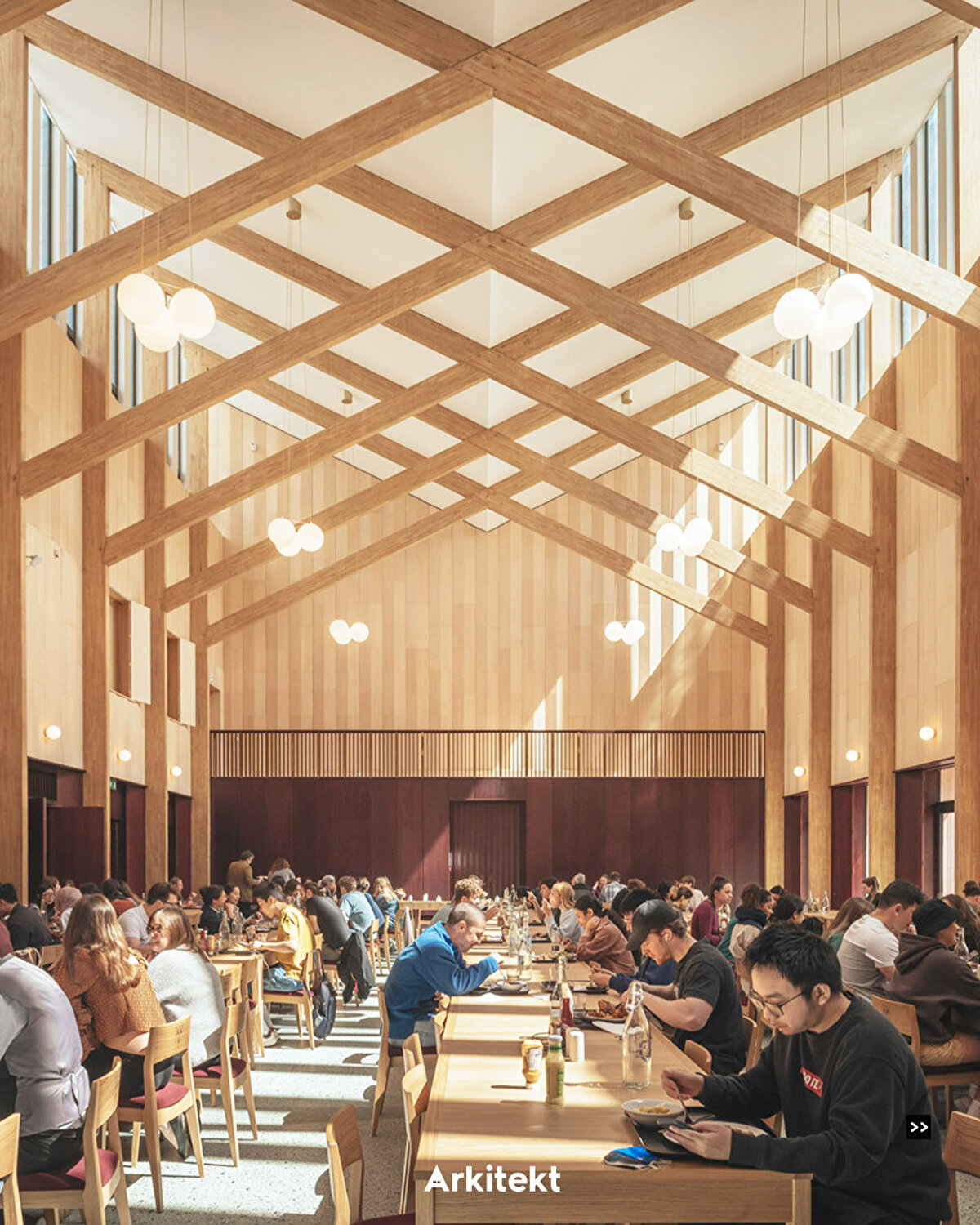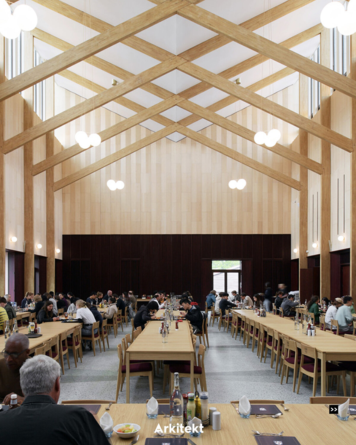 İç mekanda, tatlı bir kestane glulam ahşap çerçeve ve kelebek kafes, daha tipik eğimli formu vadi şeklindeki bir çatıya çevirmekle birlikte, geleneksel kolej salonlarını yansıtır.