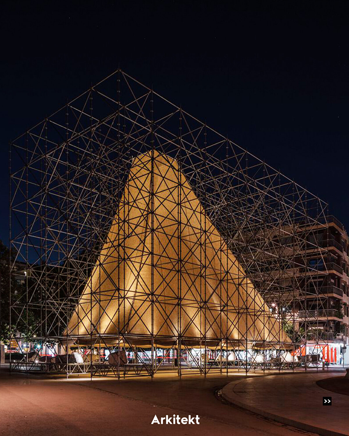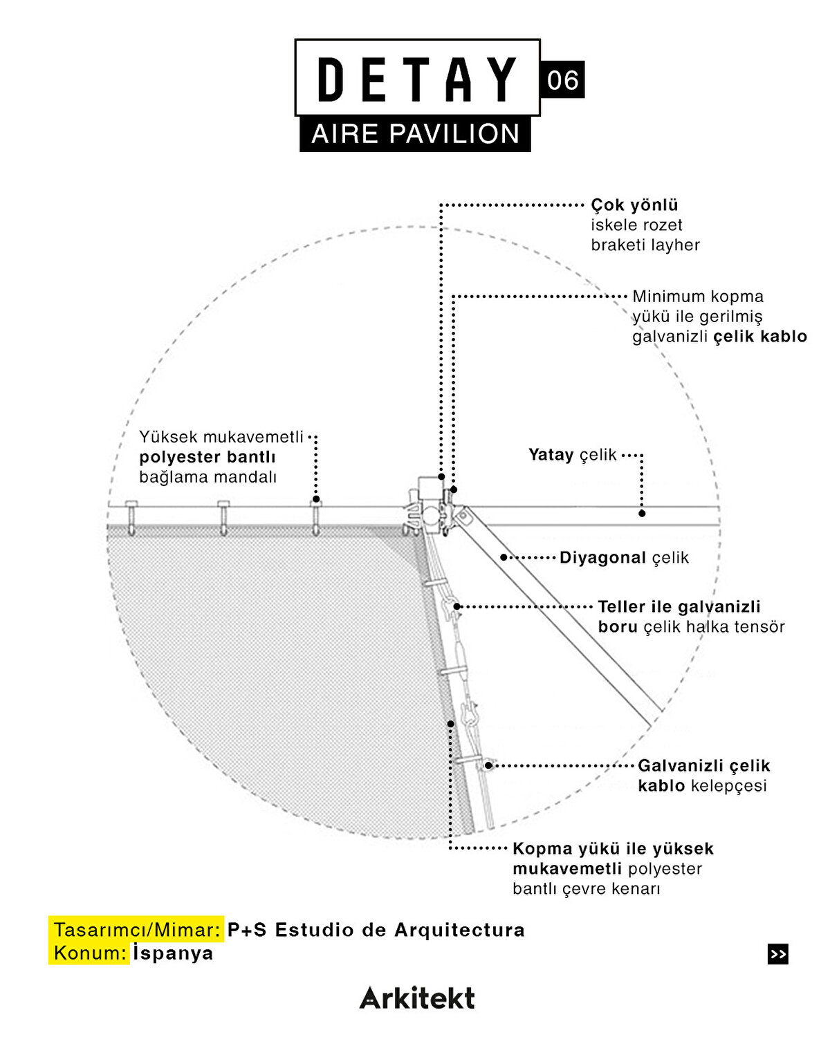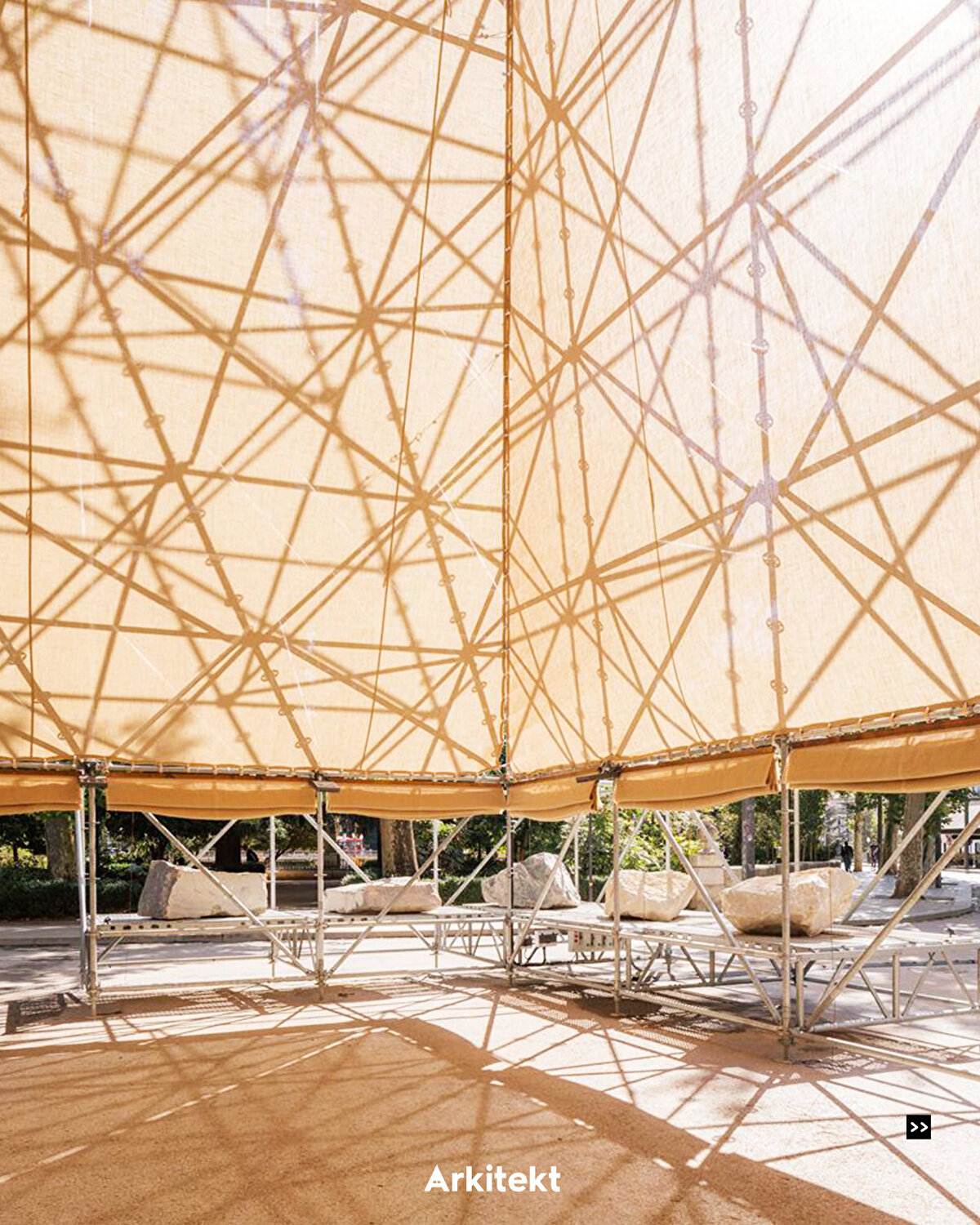 @paradasalvador_estudioarq tarafından tasarlanan pavyonda, dayanıklı bir kumaş olan kendir kullanılıyor. Bu kullanımla yerelliğin, el sanatının ve geleneğin; bölgenin kendine has dokusunu temsil ettiği belirtiliyor.