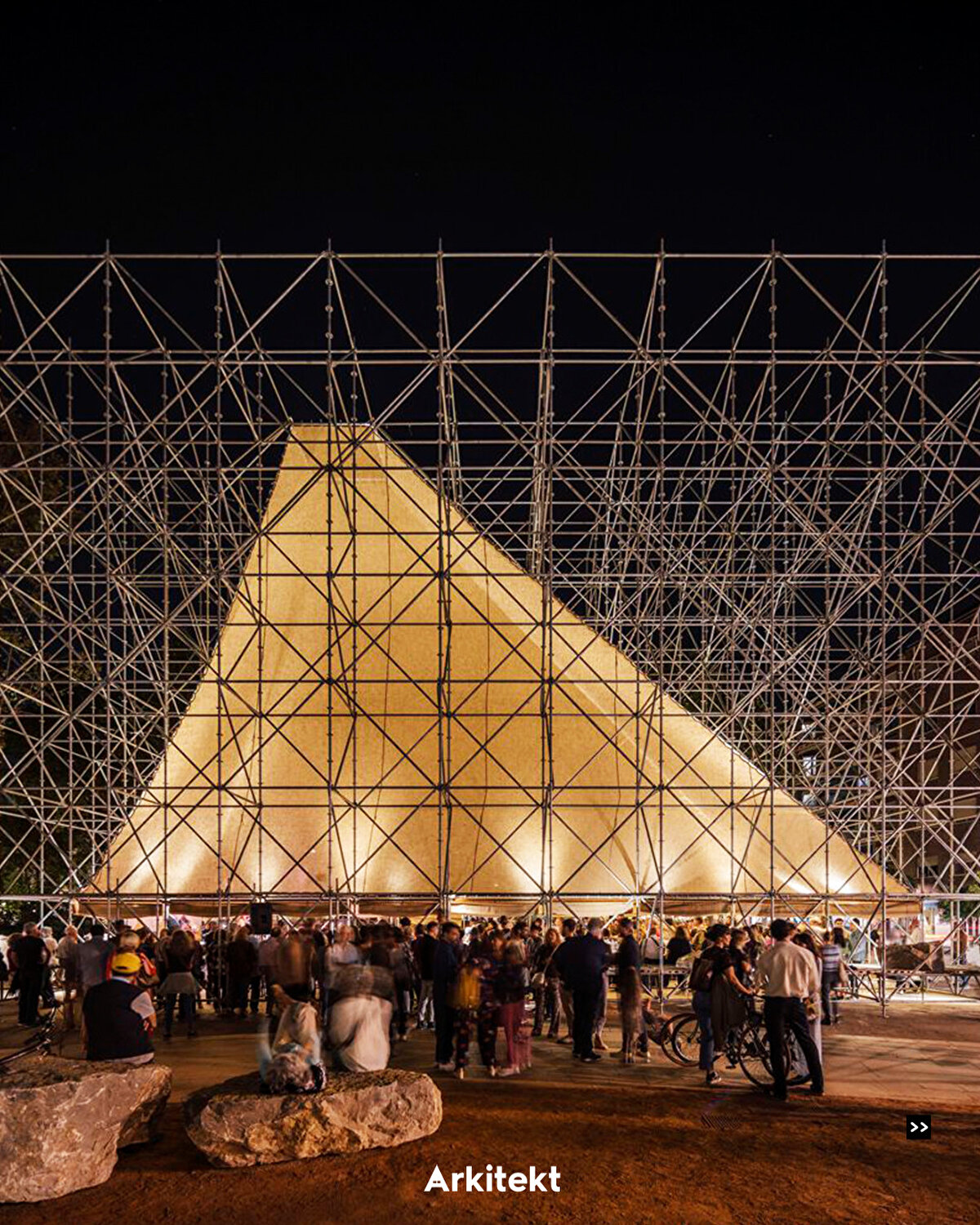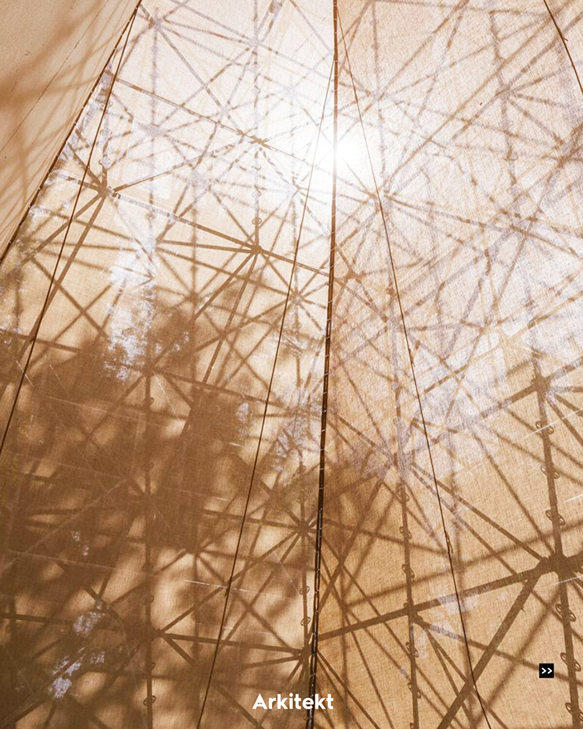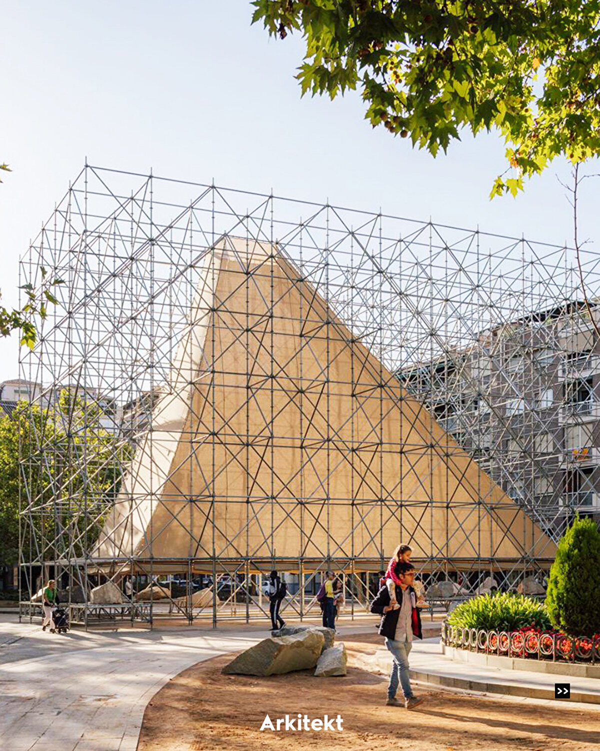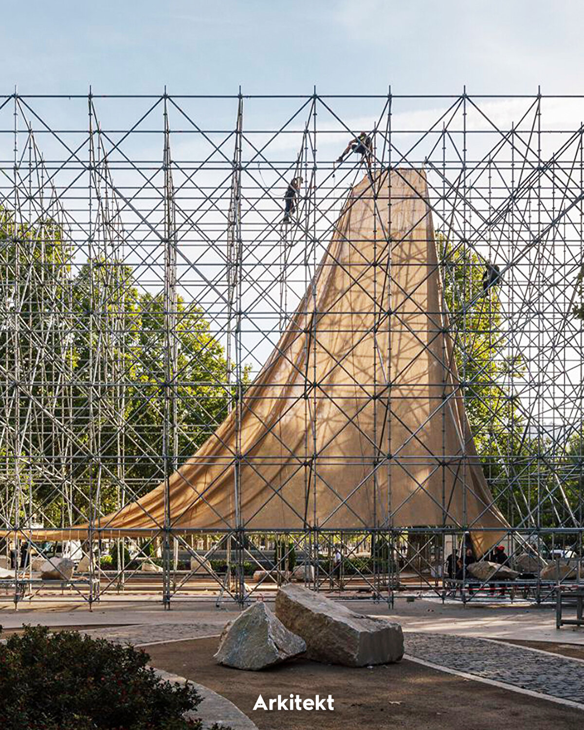 @paradasalvador_estudioarq tarafından tasarlanan pavyonda, dayanıklı bir kumaş olan kendir kullanılıyor. Bu kullanımla yerelliğin, el sanatının ve geleneğin; bölgenin kendine has dokusunu temsil ettiği belirtiliyor.