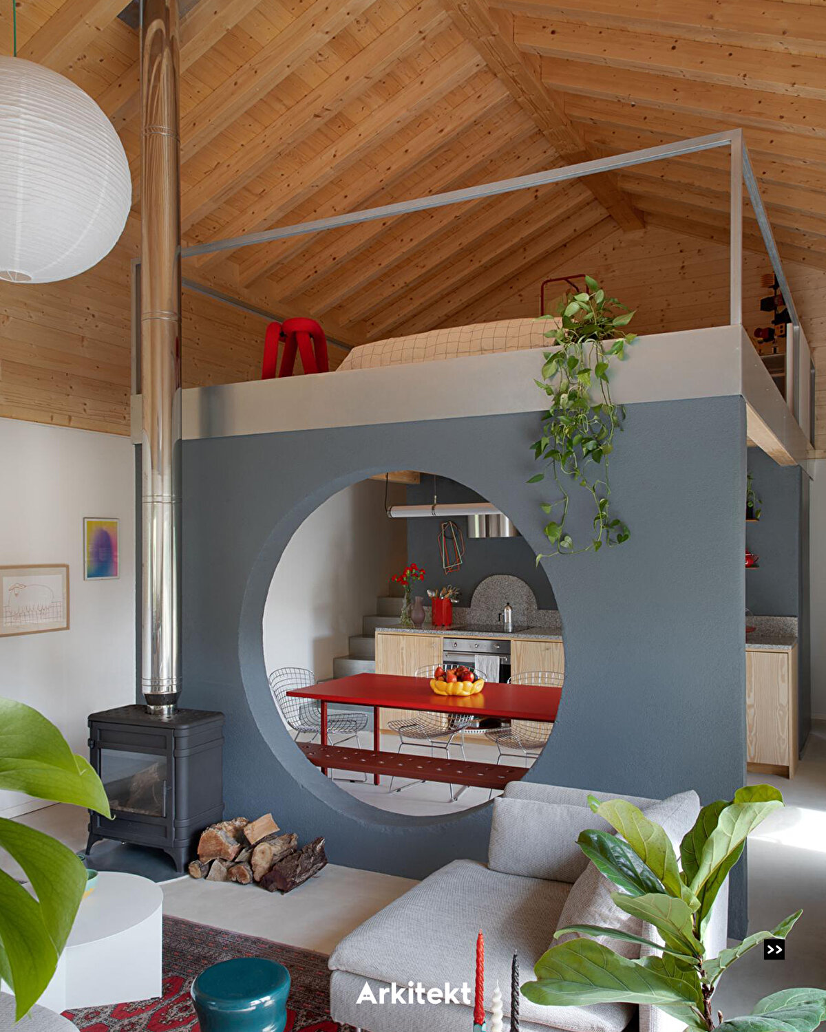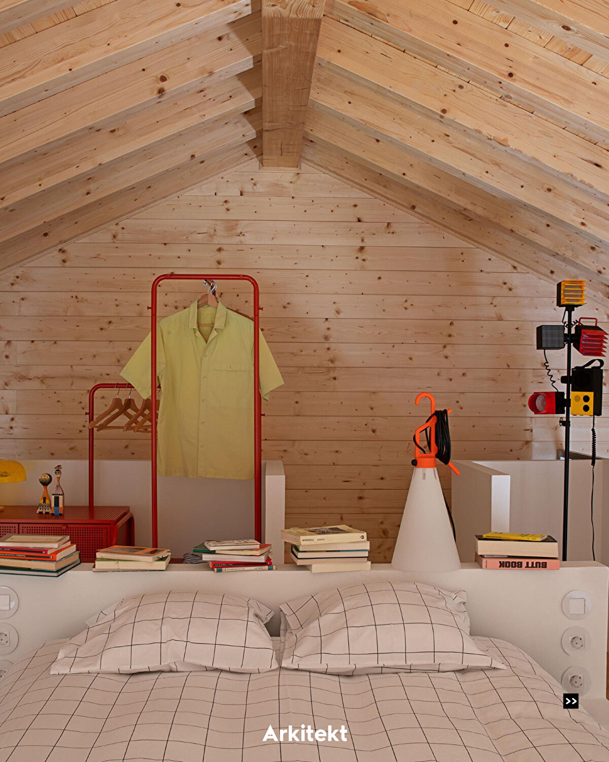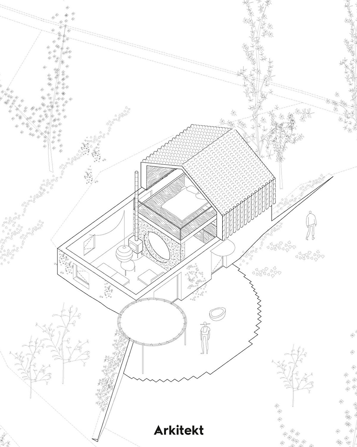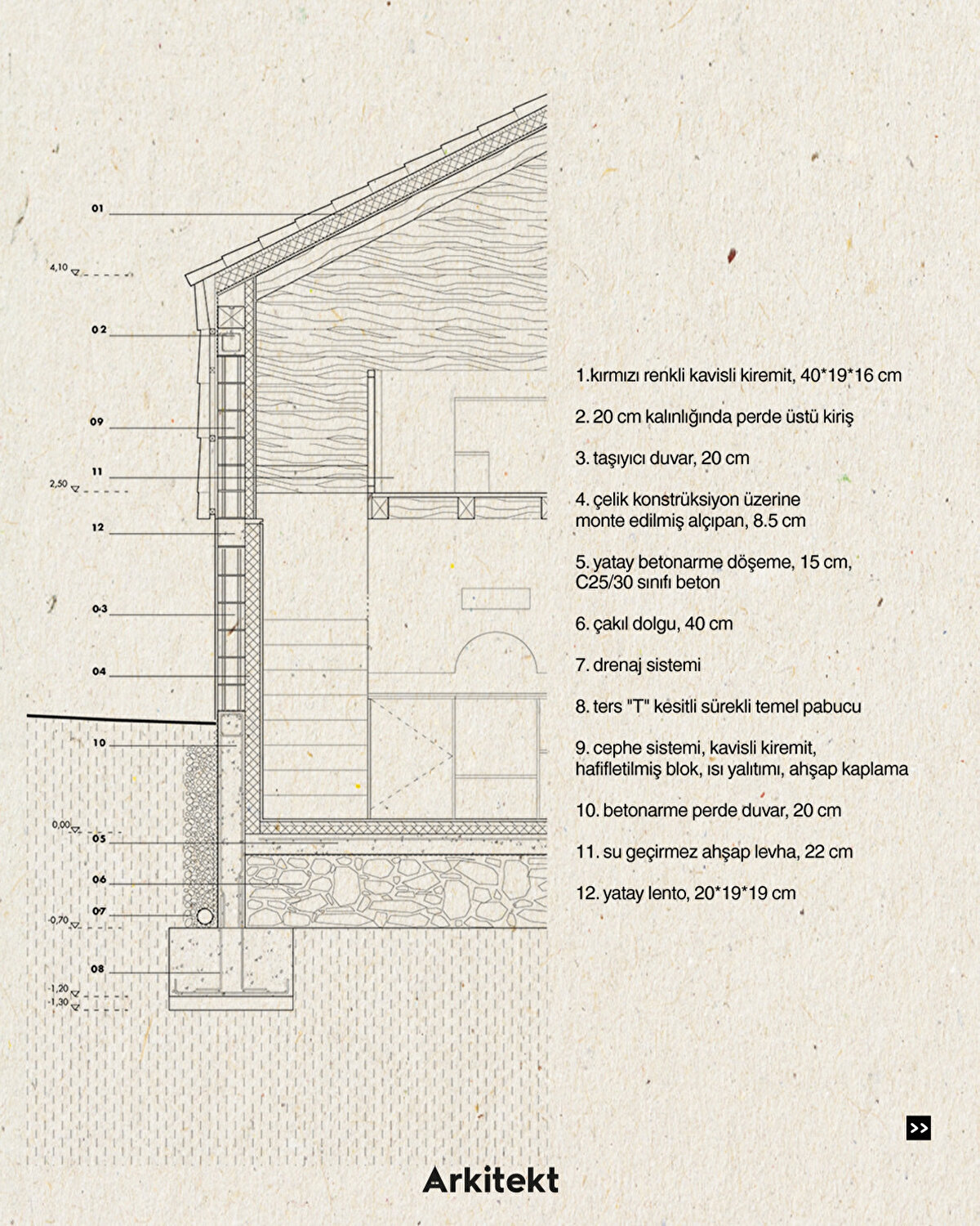Asma katta yatak odası yer alırken, alt katta yaşam alanı, mutfak ve ıslak hacimler konumlanıyor. Kiremit kullanımının ön plana çıktığı yapı, hem estetik hem de fonksiyonel olarak bölgedeki iklim koşullarına uygun olarak tasarlanıyor. Ayak izinin minimumda tutulması, yalıtım malzemeleri ve yapım teknikleriyle termal performans artırılarak çevreyle uyumlu bir yapı hayata geçiriliyor.