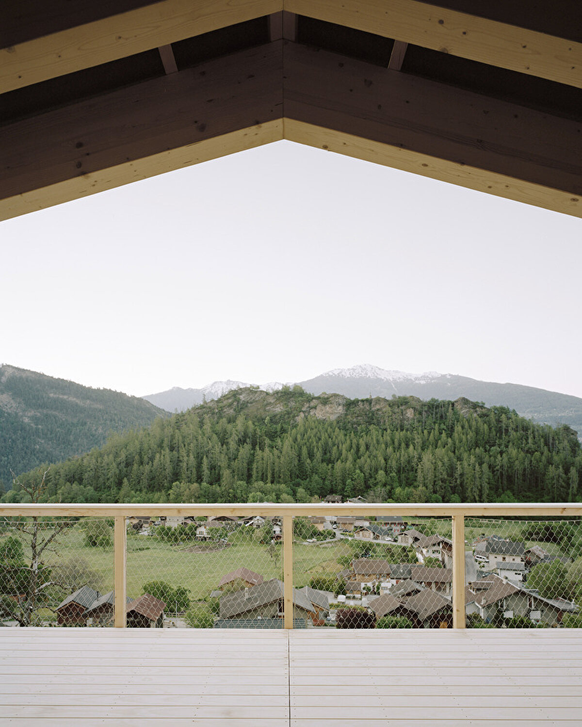 Designed by Deschenaux Follonier in 2019, this 190 m² residence is located in the village of Ayent, Switzerland. The structure references its rural setting through a material language that echoes the traditional barns in the surrounding area. The combination of concrete and wood structures separates the base, main body, and roof, emphasising the building's layered structure.