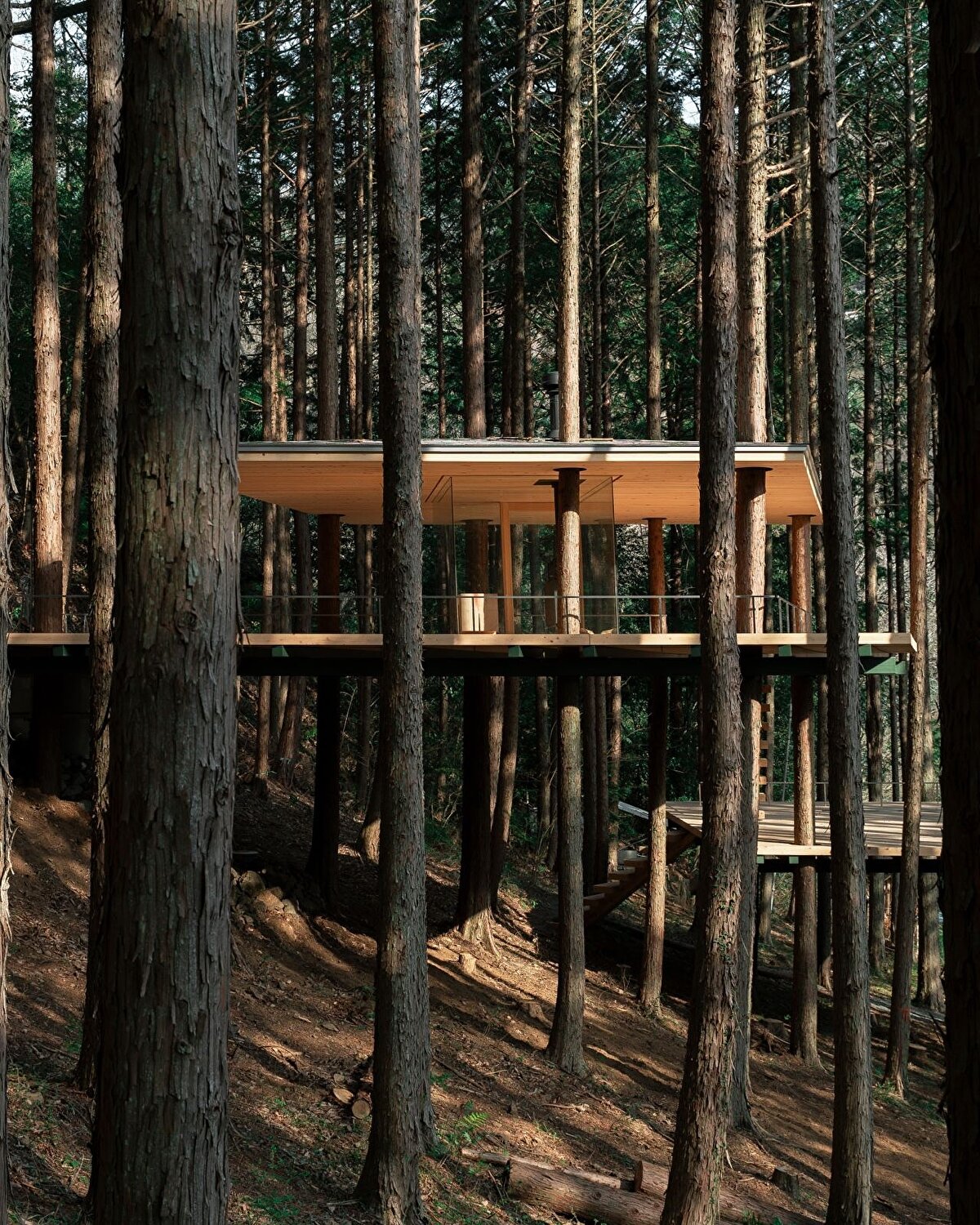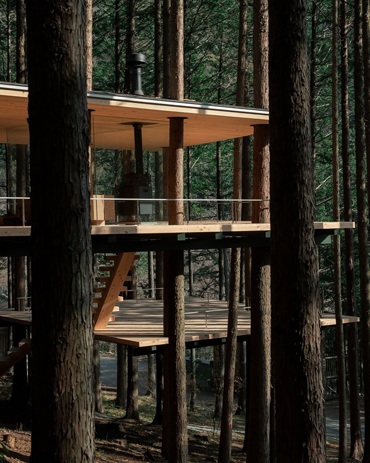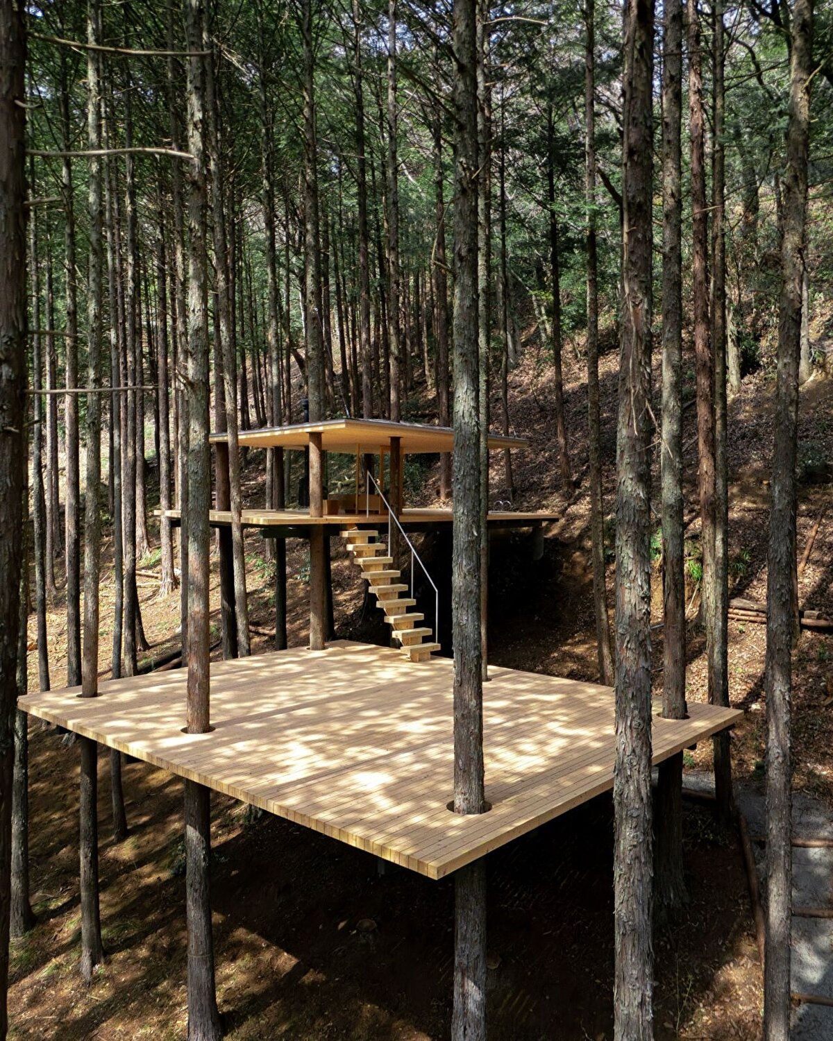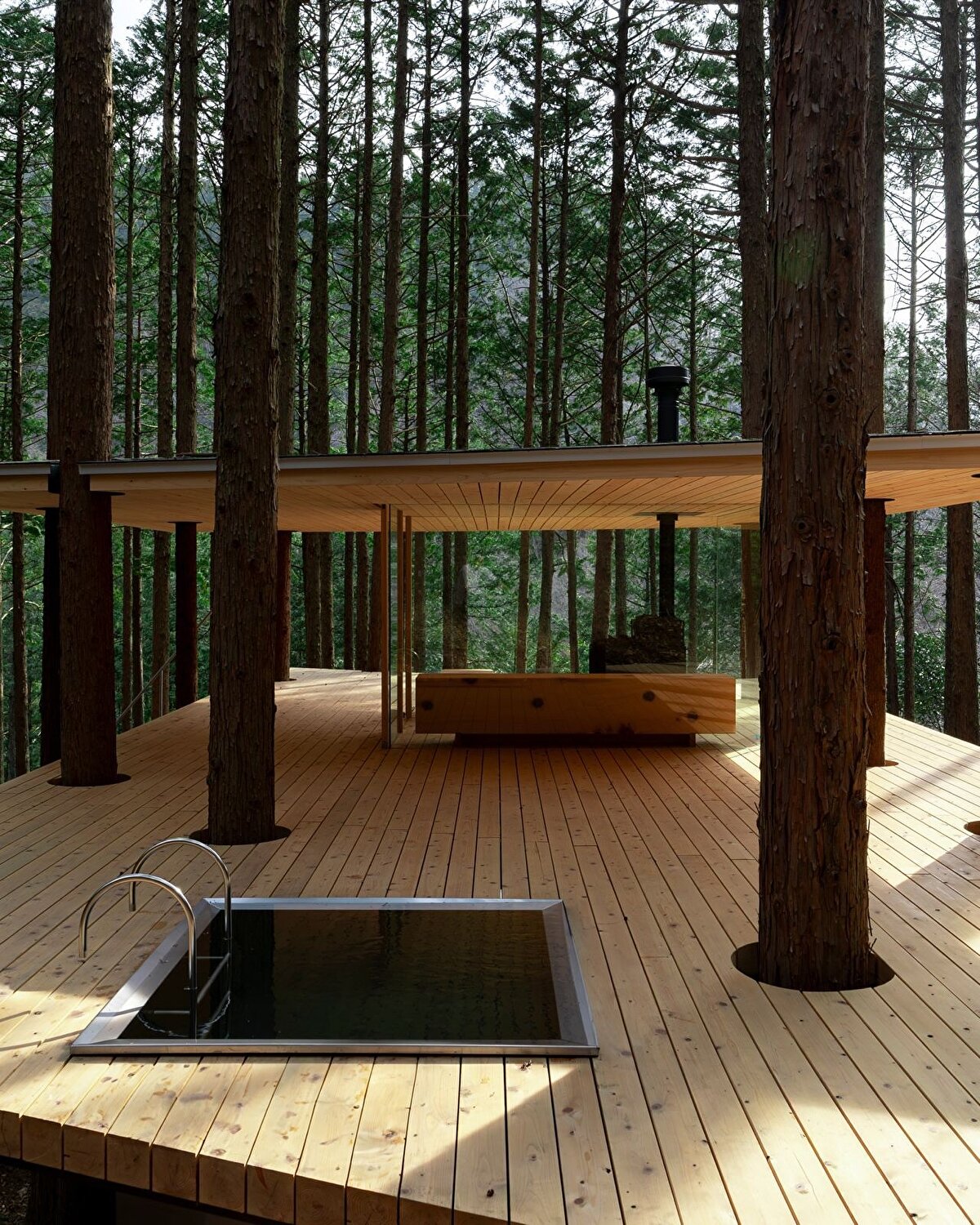 Bu yaklaşımın somut örneklerinden biri, Kanagawa ormanında konumlanan “Tree Sauna" adlı yapı oluyor. Bu proje, sauna ve konaklama işlevlerini bir araya getirirken, aynı zamanda çevredeki doğal dokuyla mümkün olan en az müdahale ile ilişki kurmaya çalışıyor. Yapı, ağaçlara dokunmadan konumlandırılıyor, eğimlere ve mevcut bitki örtüsüne göre şekil değiştiriyor. Tasarım, çevreye göre eğilen, bükülen ve yer yer kırılan formlarıyla doğaya uyum sağlamaya çalışırken, bu durumu bir estetik tercih değil, mimarinin çevreye yanıt verme biçimi olarak tanımlıyor. Bu yönüyle proje, doğaya müdahale etmektense, onunla birlikte var olma fikrini merkeze alıyor.