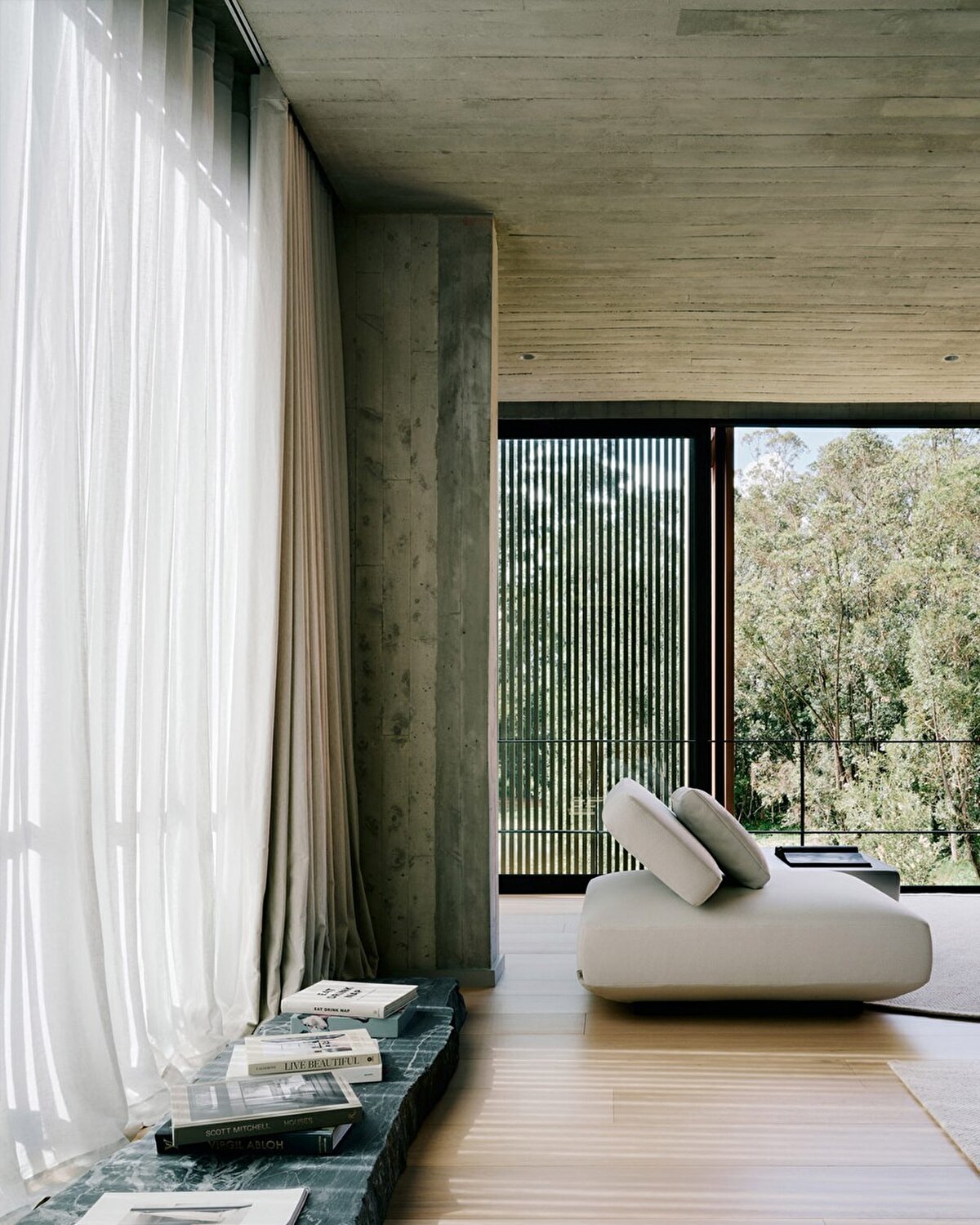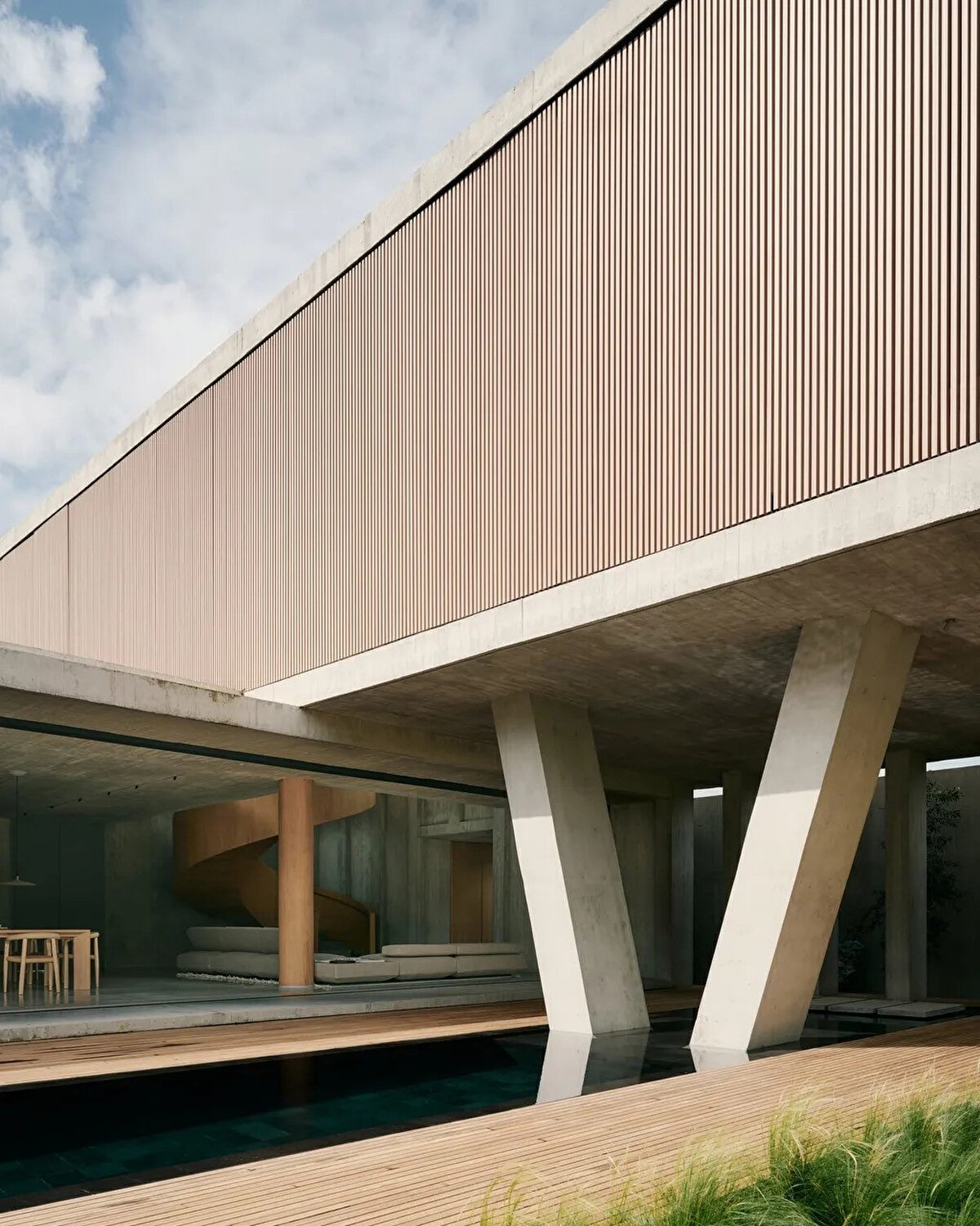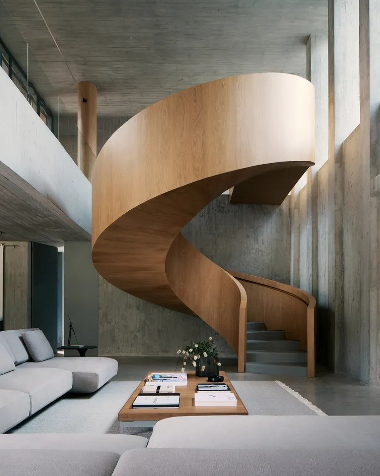 Evin merkezinde, meşe kaplamalı spiral bir merdiven yer alıyor ve bu merdiven, yapının iki dikdörtgen hacmini birbirine bağlıyor. Üst katta yer alan hacim, V şeklindeki beton bir kolonla destekleniyor ve bu sayede alt kattaki yaşam alanı, çevredeki doğayla bütünleşiyor. Ayrıca, siyah Bali taşıyla kaplanmış bir yüzme havuzu da evin dikkat çeken unsurlarından biri oluyor.
