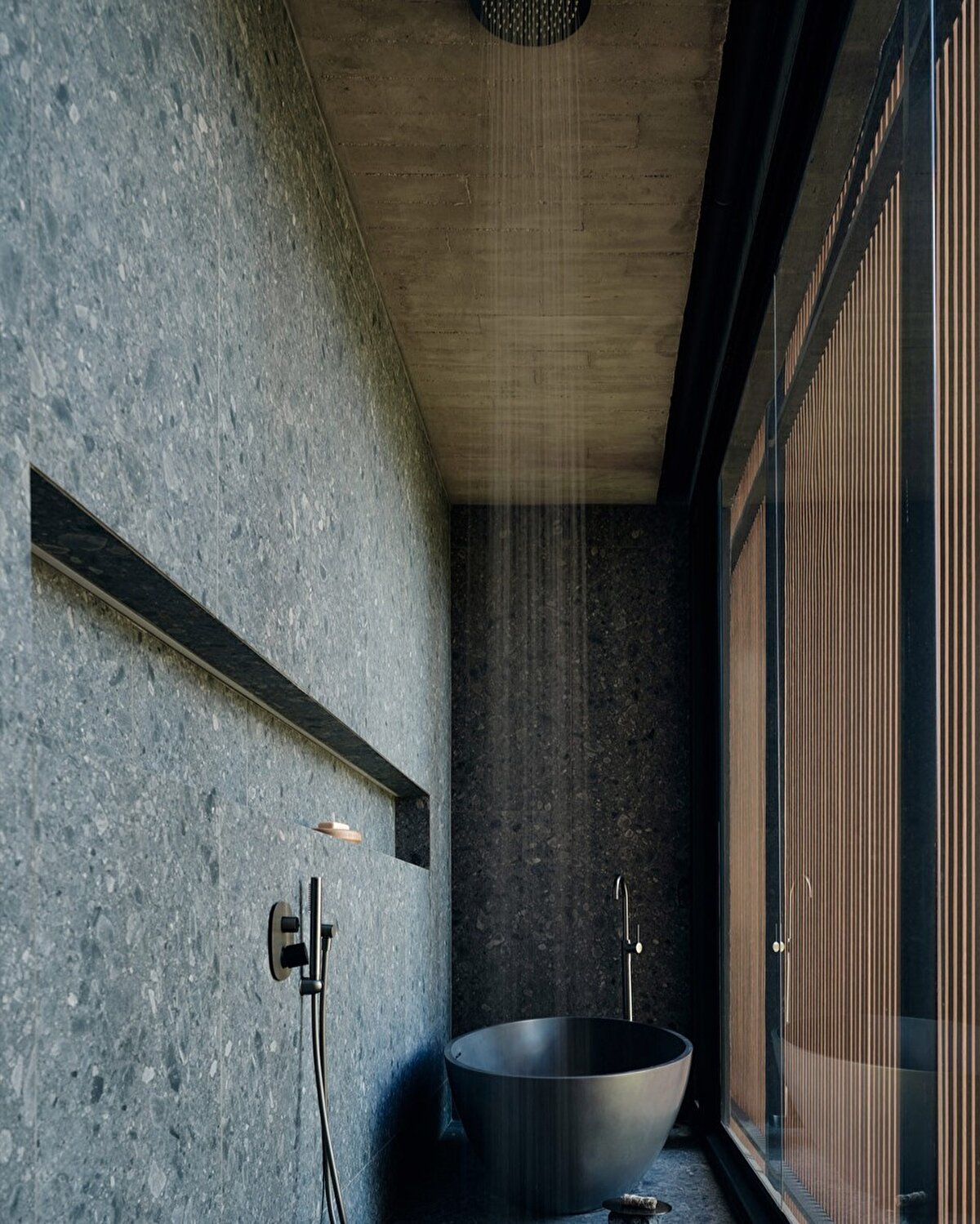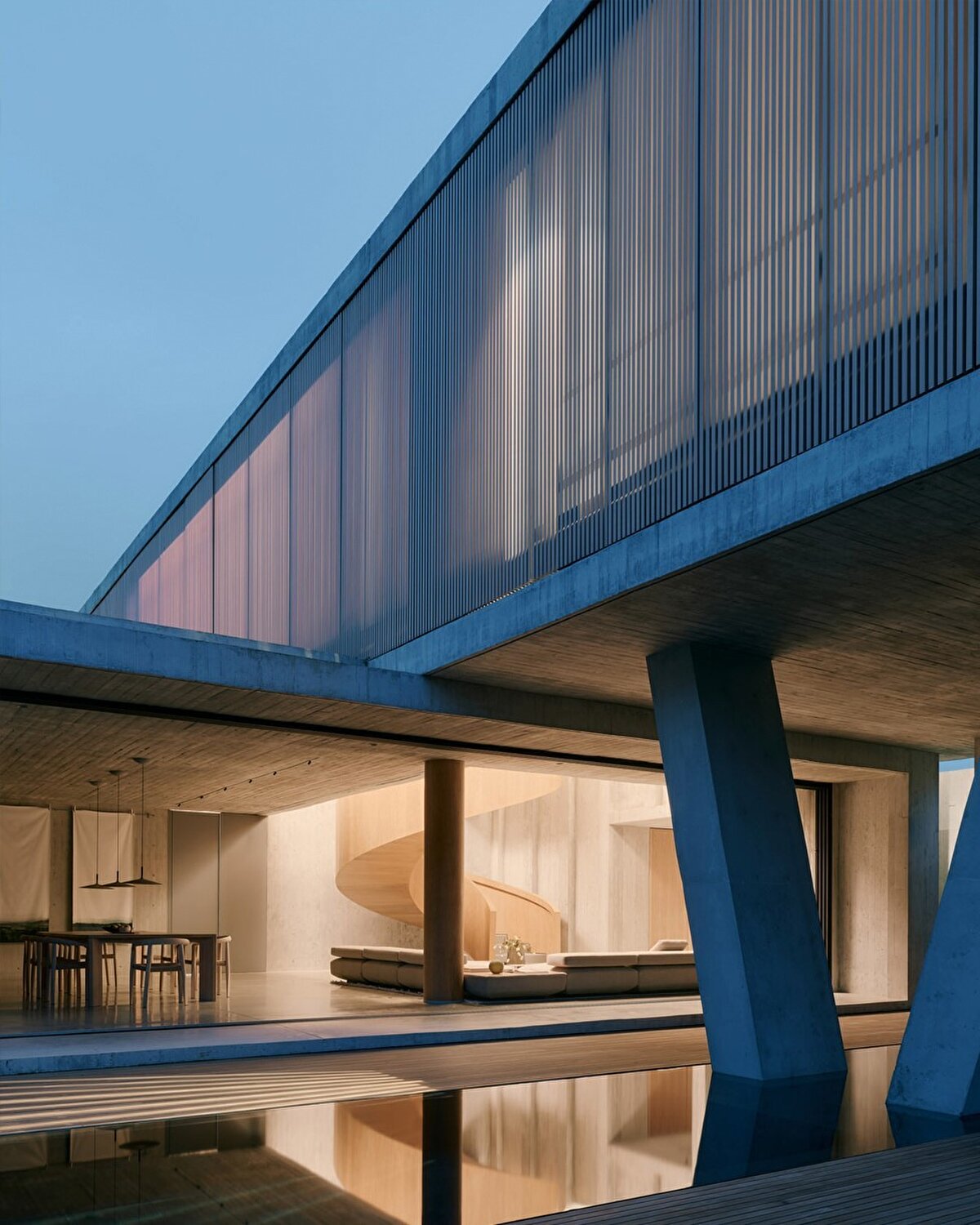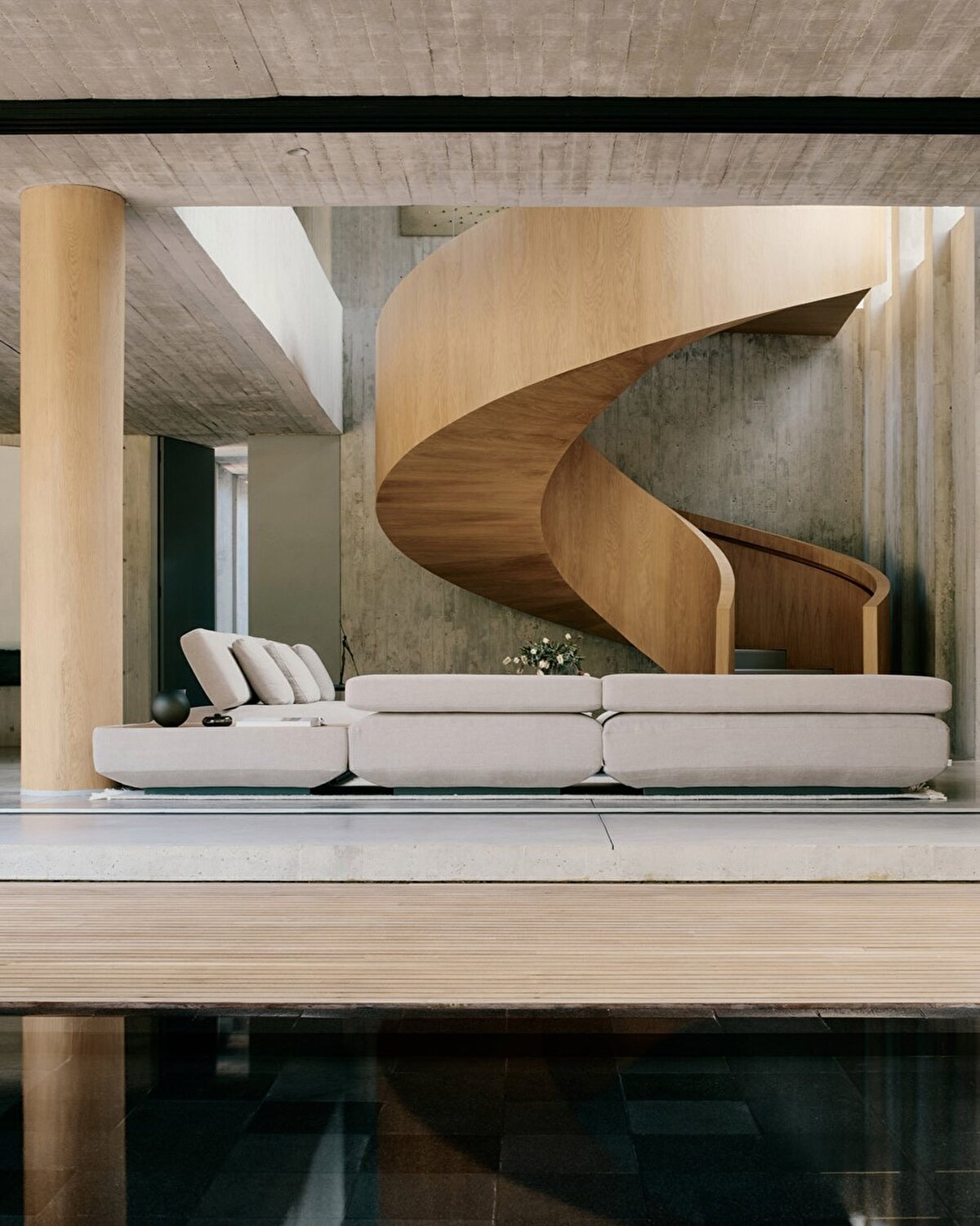 In the center of the house is a spiral staircase with oak veneer that connects the two rectangular volumes of the building. The upstairs volume is supported by a V-shaped concrete column, so that the downstairs living space is integrated with the surrounding nature. A swimming pool clad in black Balinese stone is also one of the most striking elements of the house.
