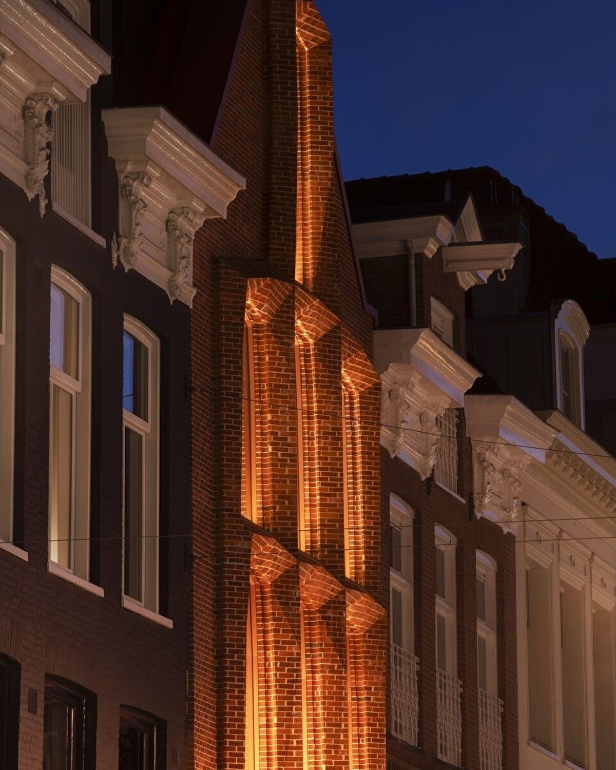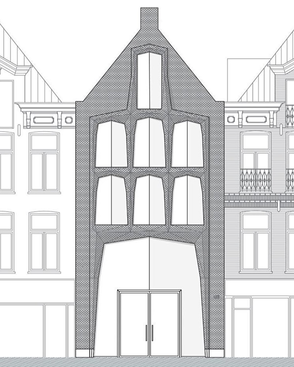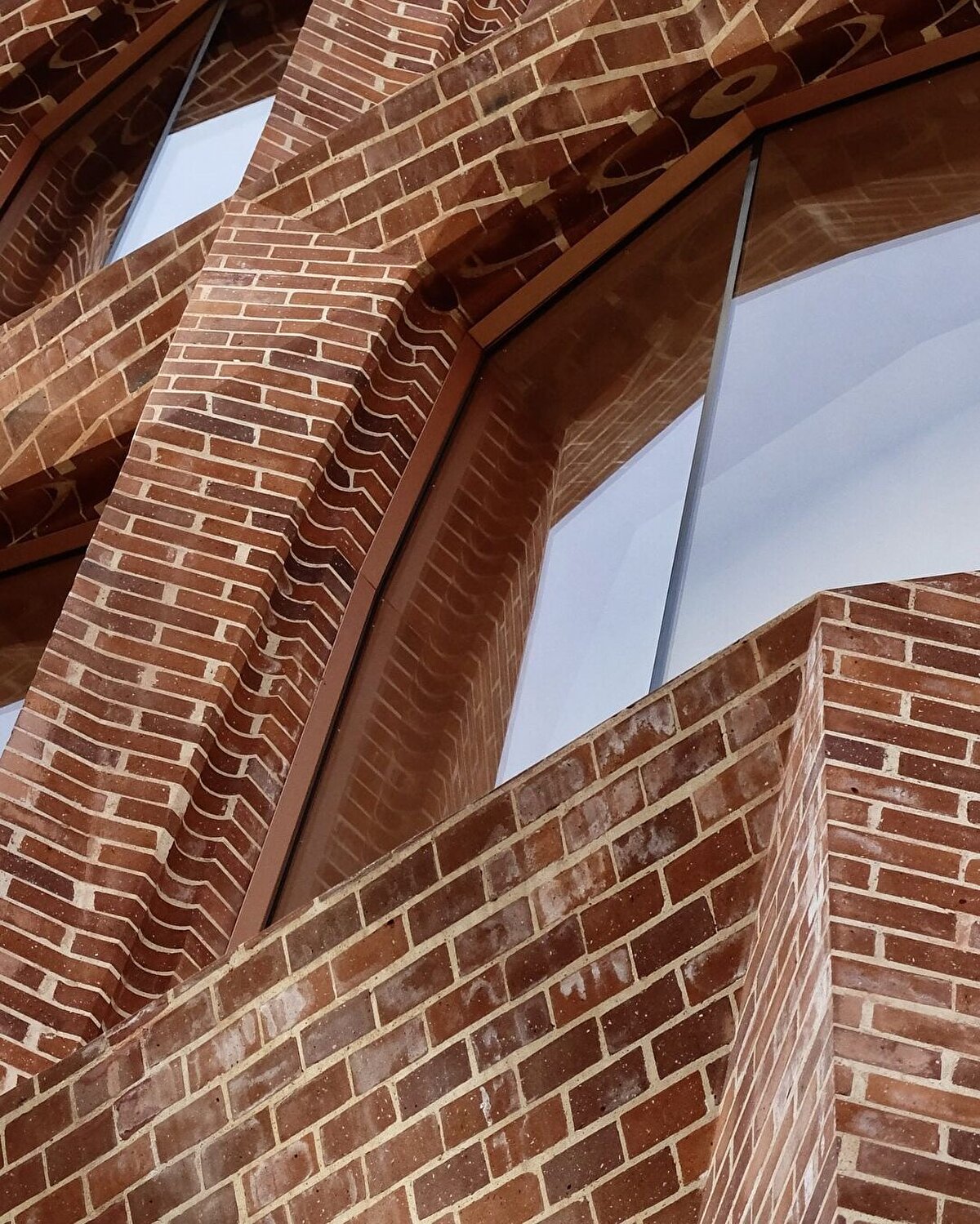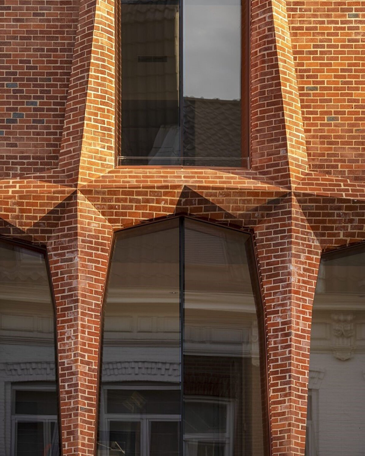 Cephe, tuğla işçiliği ile geniş cam yüzeyleri bir araya getiriyor. Camlar, hafif açılarla yerleştiriliyor ve böylece eğimli cephe yüzeyleriyle uyum içinde hareket eden bir öğe haline geliyor. Dok Architecten, bu tasarımın camda çevrenin benzersiz bir yansımasını oluşturduğunu belirtiyor.