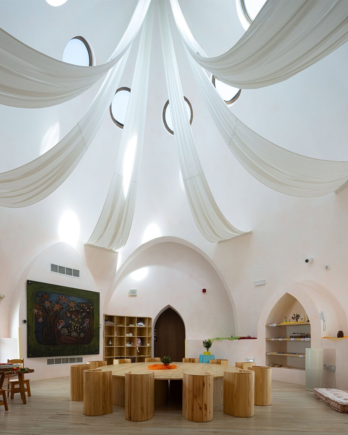 Yüksek tavanlı sınıflardaki dairesel çatı pencereleri, gün boyunca değişen doğal ışık desenleriyle mekânı dinamik bir öğrenme ortamına dönüştürüyor. Organik formlar ve birbirine bağlı mekânlar, öğrencilerin keşif, işbirliği ve yaratıcılık süreçlerini destekliyor. Peyzaj düzenlemesi, sebze bahçeleri ve eğitim çiftliğiyle bütünleşen proje, mimariyi eğitimin ayrılmaz bir parçası haline getiriyor.