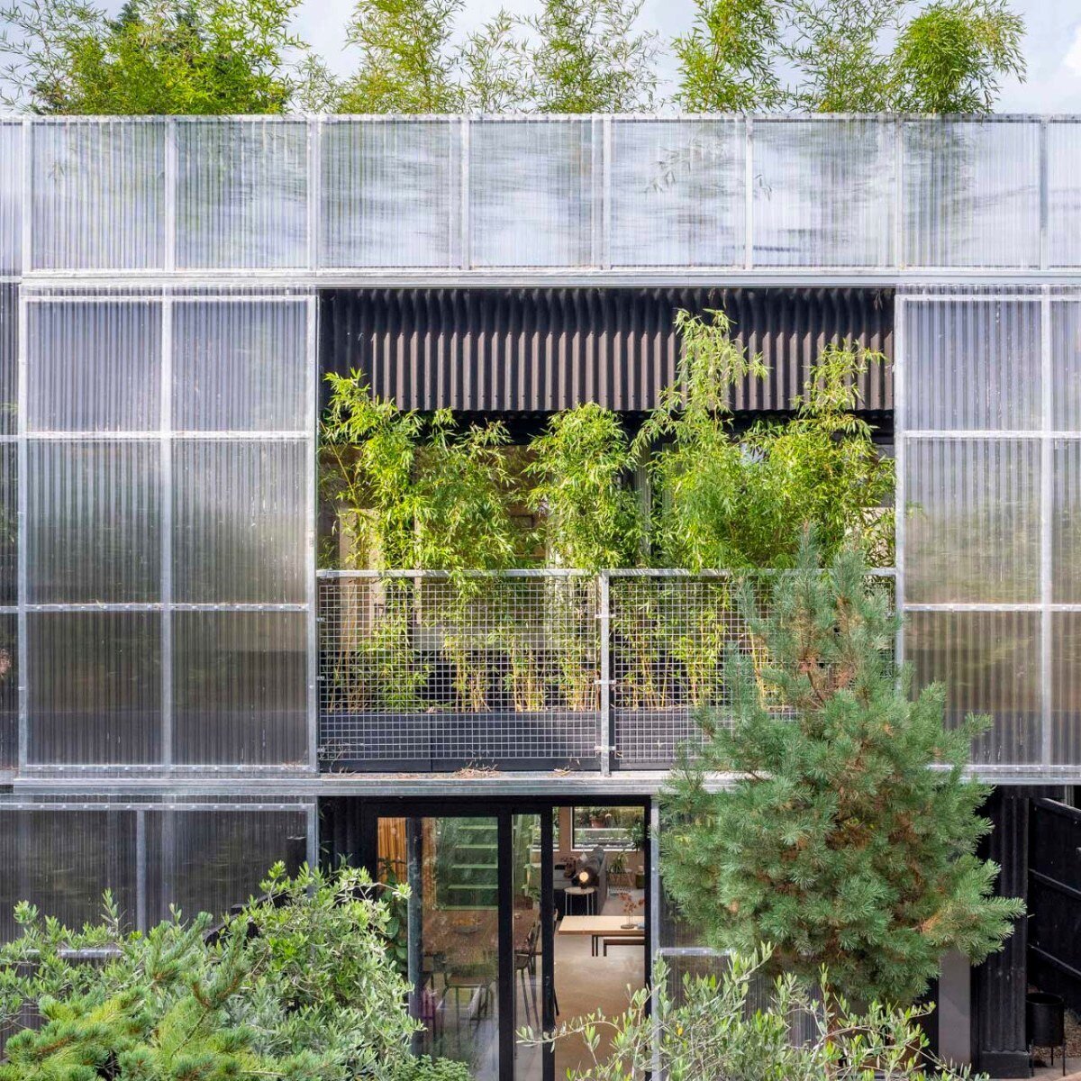 Güneye bakan ön cephe, seralara atıfta bulunan polikarbonat perdeler ve bambu ile kaplanıyor. Bu tasarım, mahremiyeti korurken gün ışığını filtreliyor ve yazın gölge sağlıyor.
