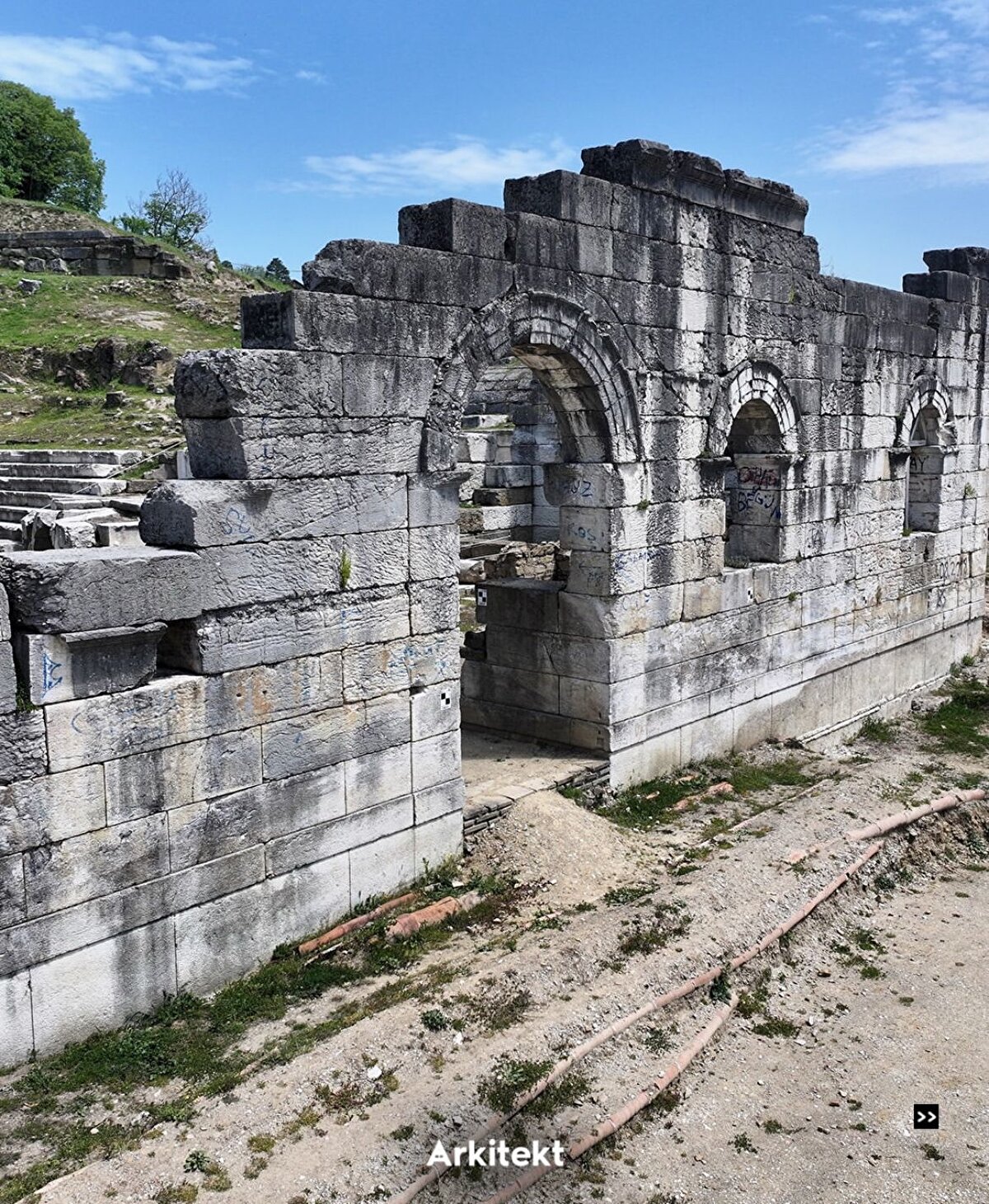 The most prominent structure of the ancient city, the 10,000-seat theatre, was built during the Hellenistic period and expanded during the Roman period to reach its current form.