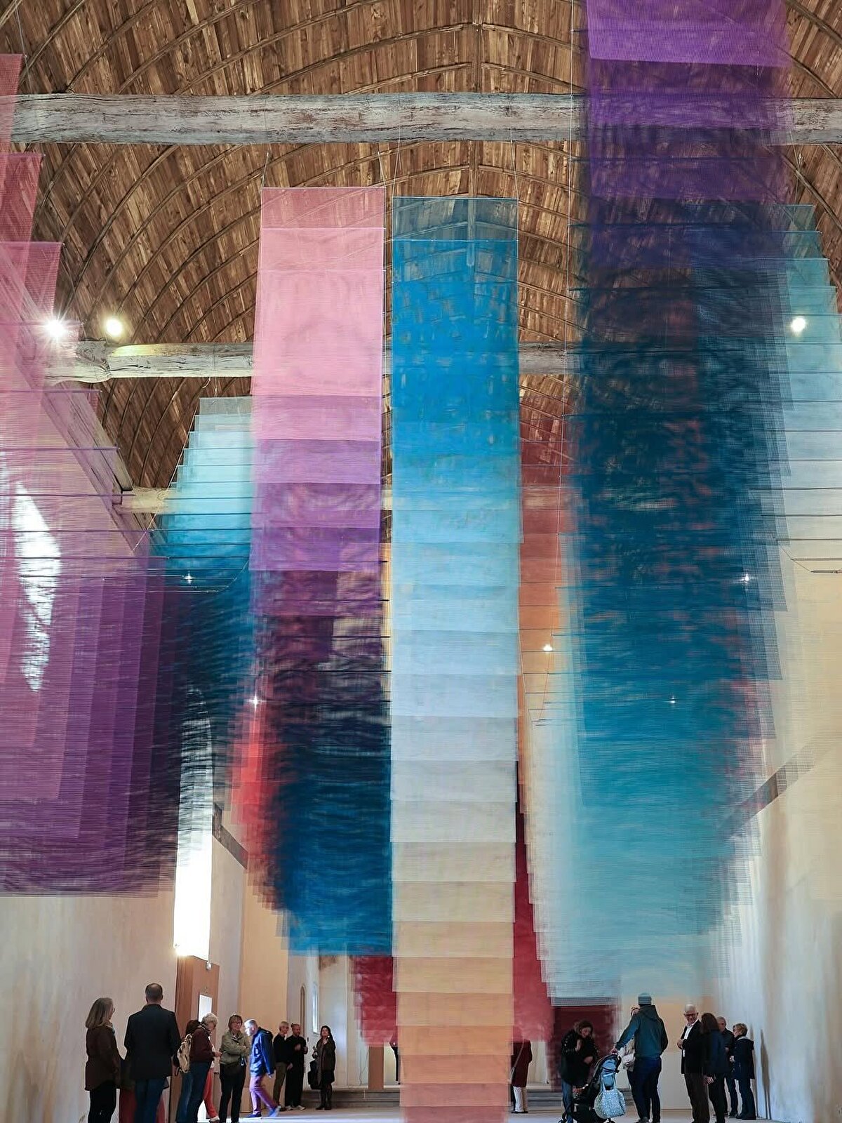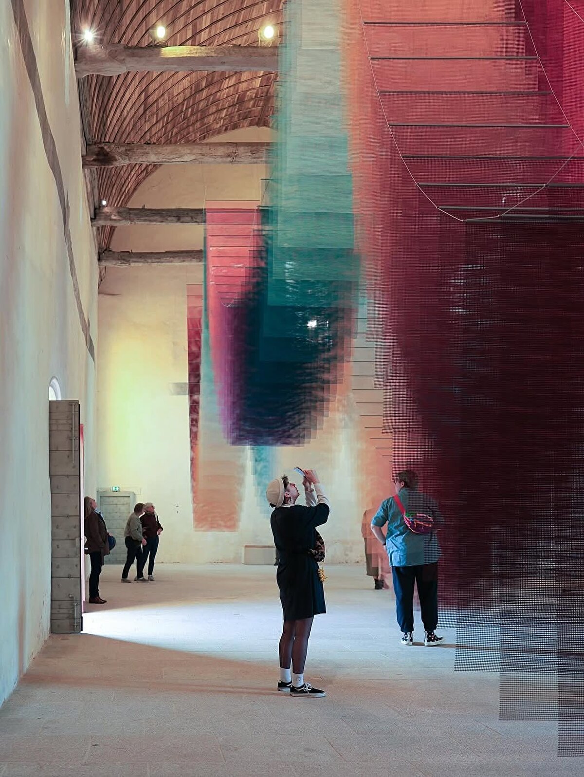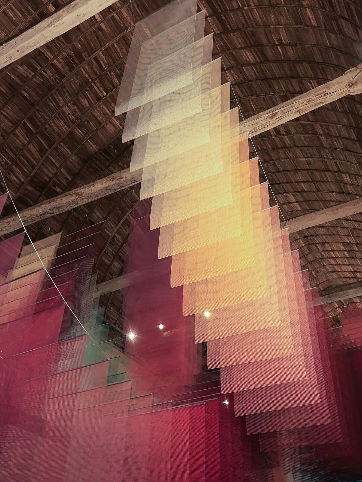 Berlin-based artist Tomislav Topić's installation Echoverse, @topic_tomislav, reconfigures the interior of the Centre d'Art Les 3 CHA in Châteaugiron, @centredart_les3cha, with transparent textile panels. This temporary spatial arrangement, which changes with light, color, and movement, establishes a new visual relationship with the historic building.