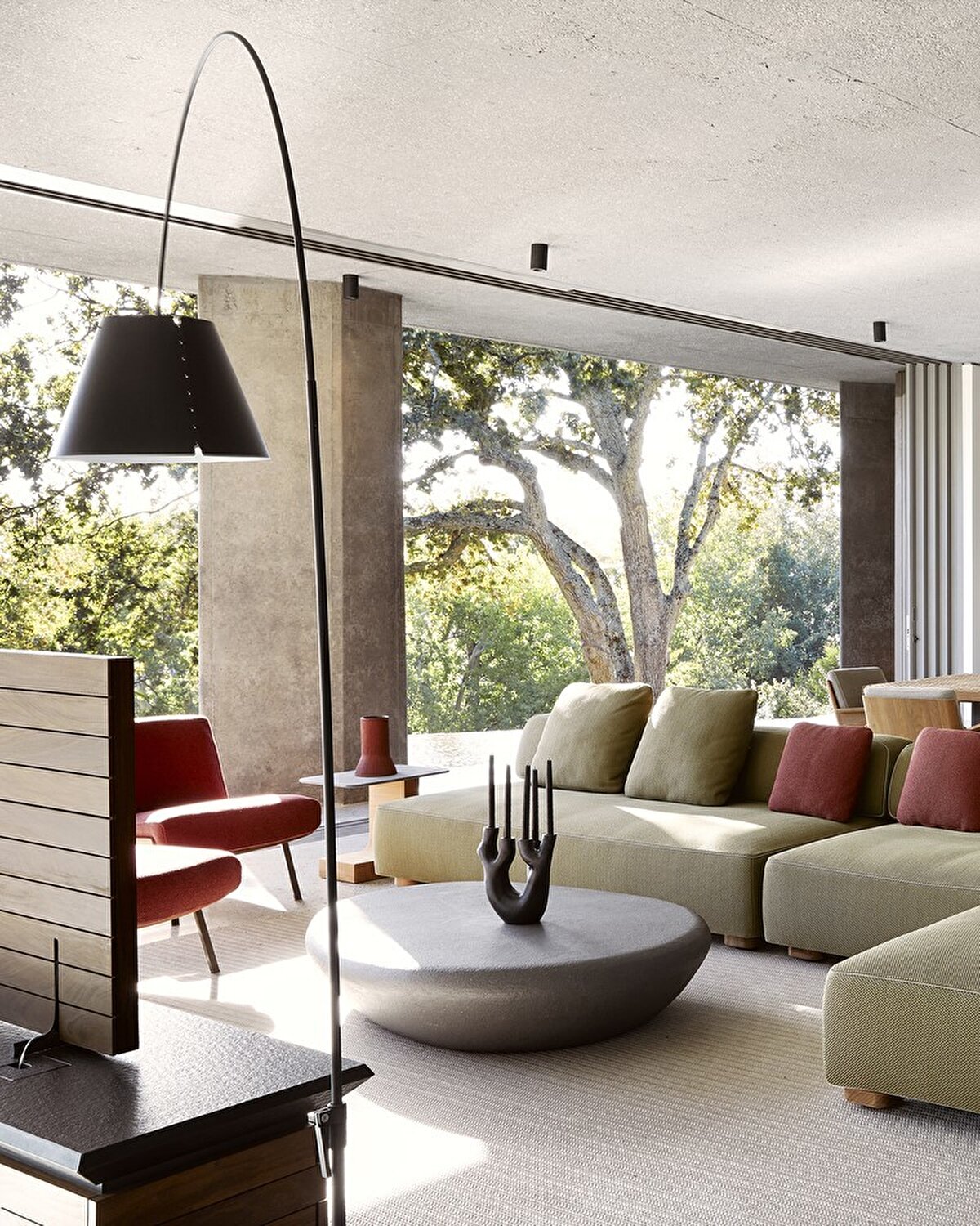 The building sits low on the hillside, in harmony with its natural surroundings in Cape Town. Its strategic location offers sweeping panoramic views through shady trees to Table Mountain. The large glass facades and open-plan interior design provide a seamless connection with nature, while natural materials such as concrete, stone and terrazzo create an aesthetic harmony with the surroundings.
