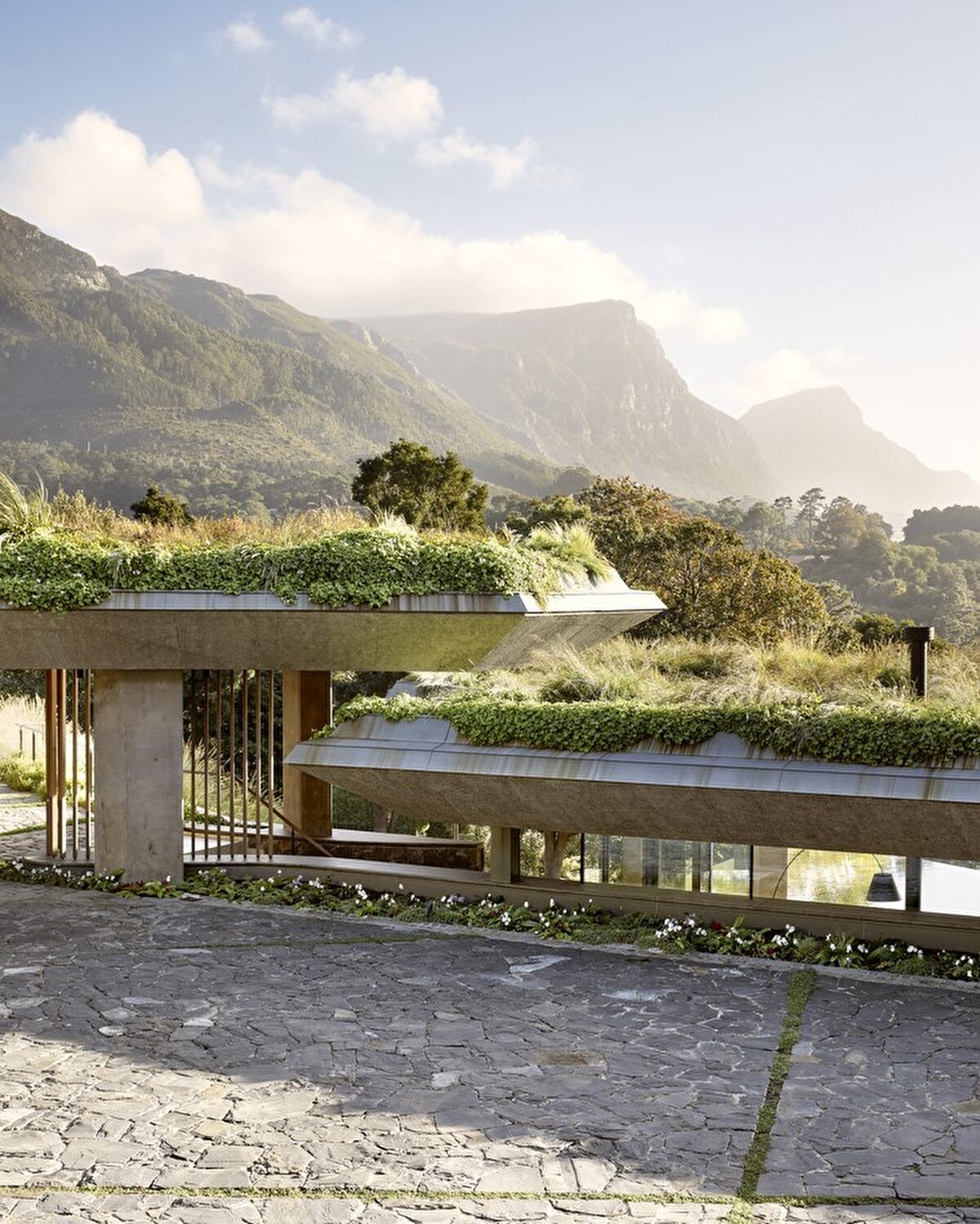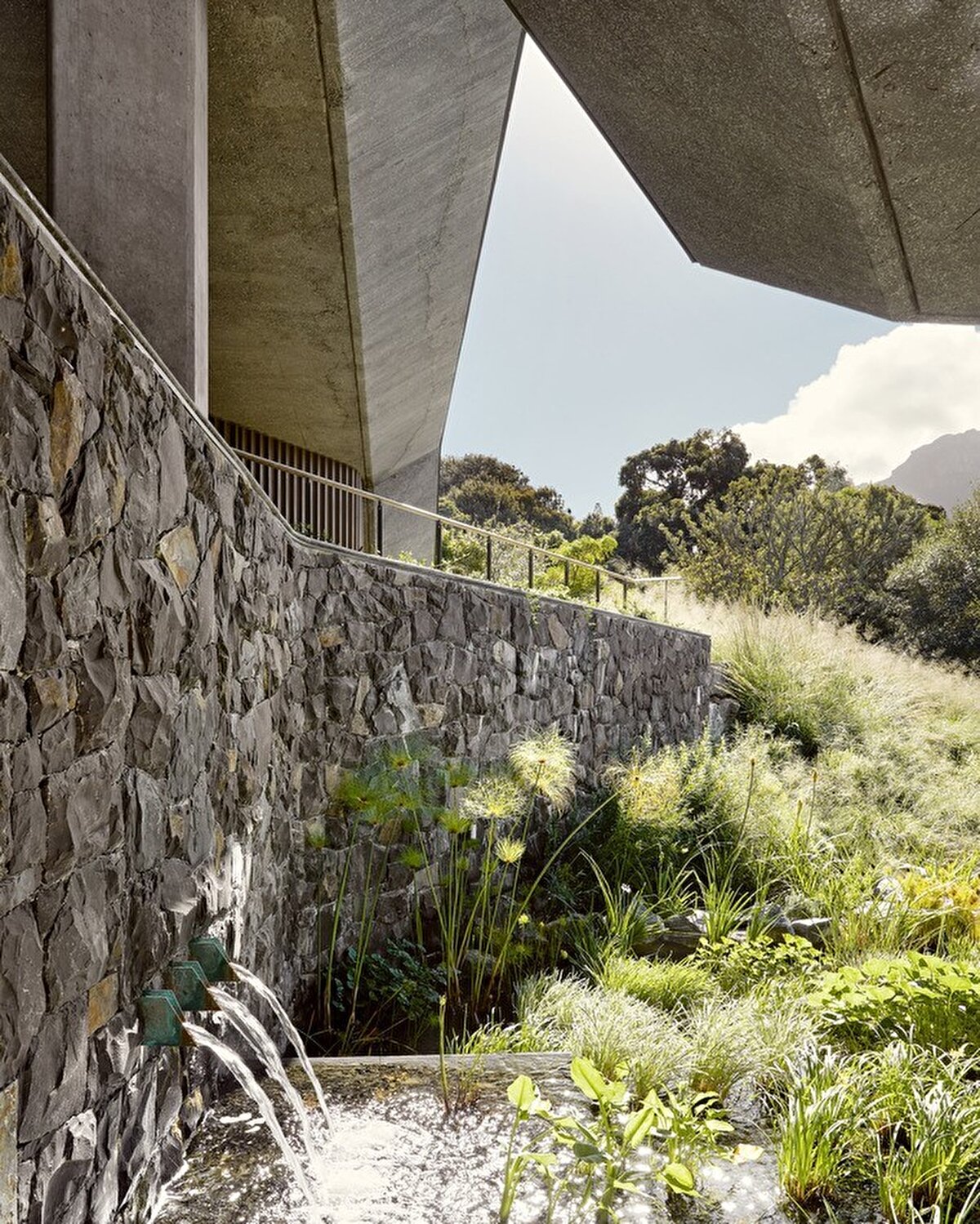 Planted roofs and water features that support biodiversity enhance both visual and environmental sustainability. The landscape design invites exploration and contemplation with vegetation reflecting the local ecology and carefully positioned pathways. Constantia is a striking example of how architecture can offer a profound experience in harmony with nature.
