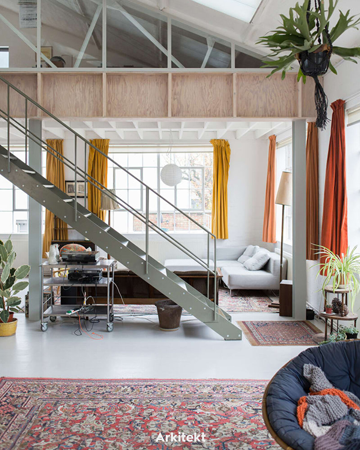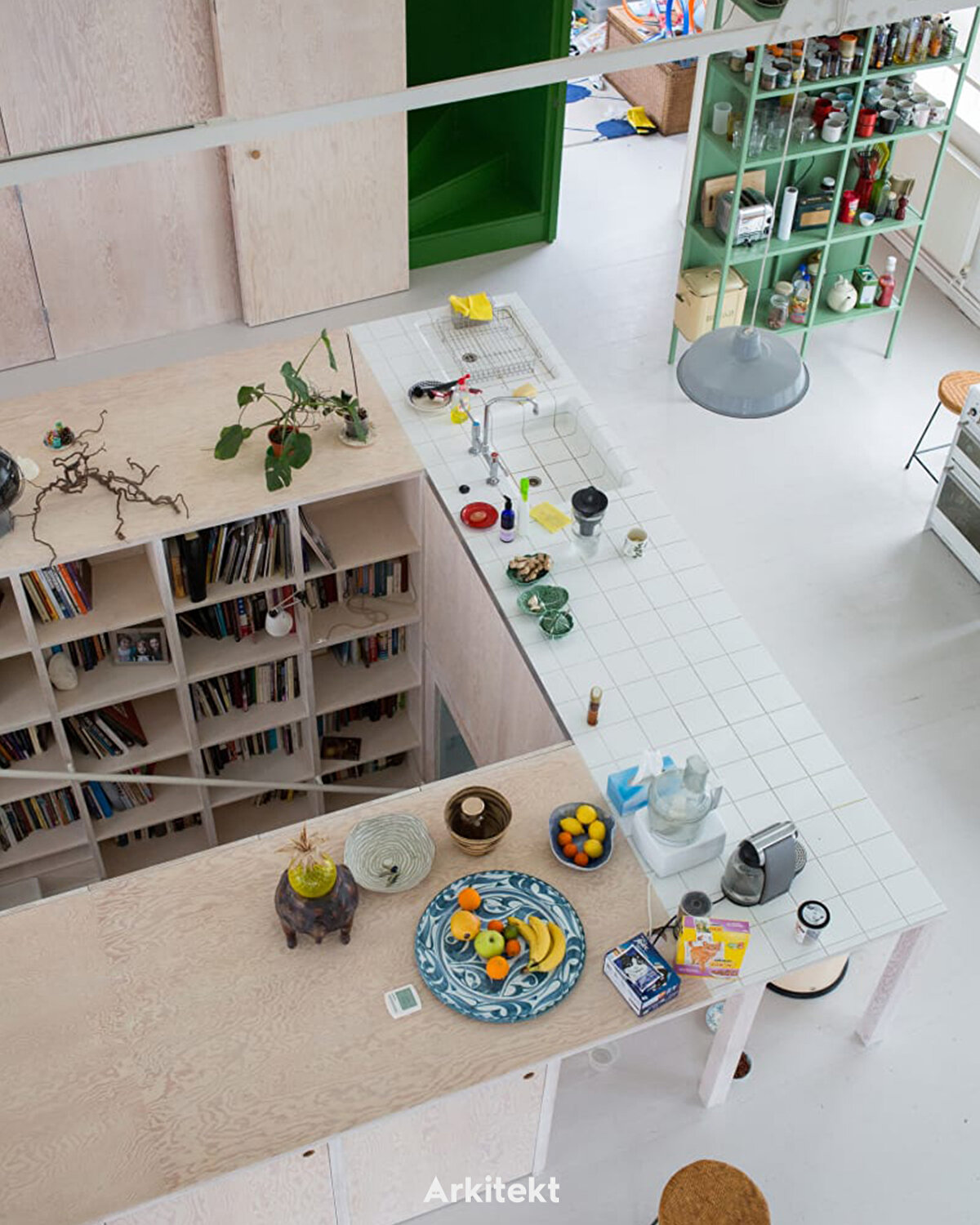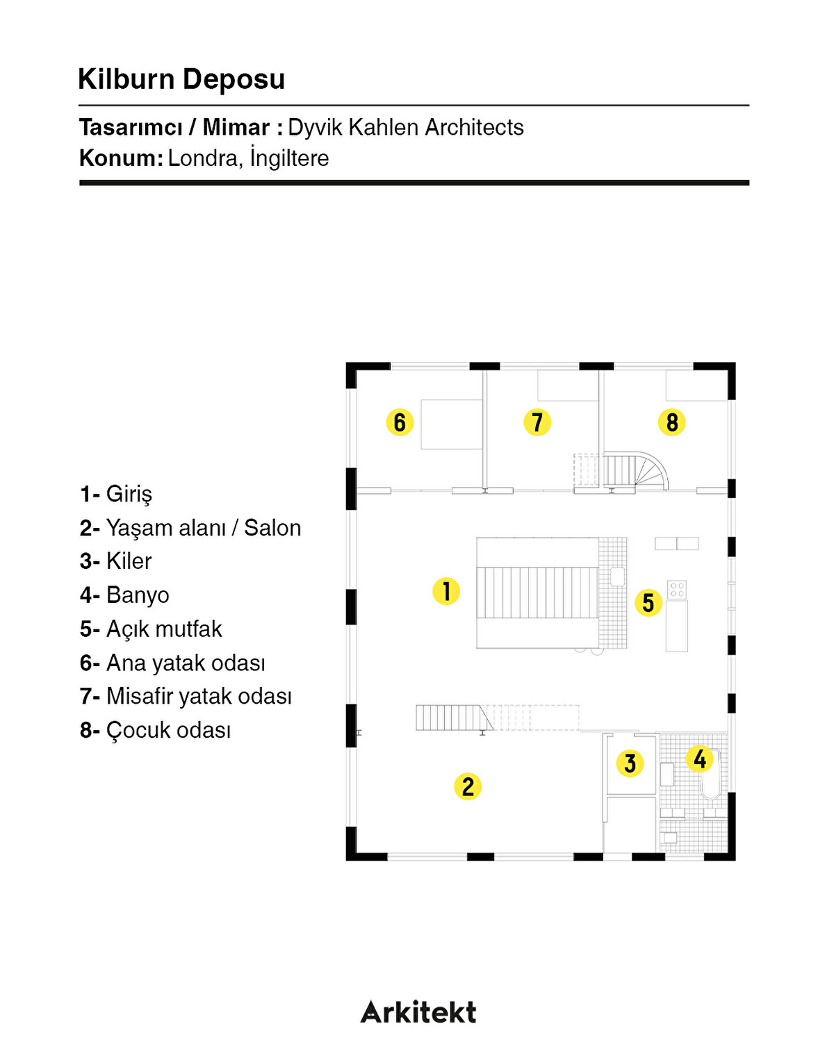 Eski bir deponun bir sanatçı ve ailesi için açık plan konuta dönüştürüldüğü proje, 200 m2'lik bir zemine oturuyor. Orijinal mekanın mevcut pencere açıklıkları korunarak iç mekanda aydınlık ve ferah bir atmosfer oluşturuldu. Ana mekan, açık mutfaklı bir yaşam alanına açılan merkezi bir merdiven etrafında düzenlendi ve yatak odaları bu merkezi alana doğru açılıp kapanan sürgülü kapılar aracılığıyla bölümlendi. Diğer tarafta asma katı taşıyan bir dizi sütun; yaşam alanı, banyo ve kilere geçişi tanımlayarak farklı karakterdeki mekanları açık plan içinde düzenledi. Proje: @dyvikkahlen (ig) Fotoğraflar: Antoine Espinasseau