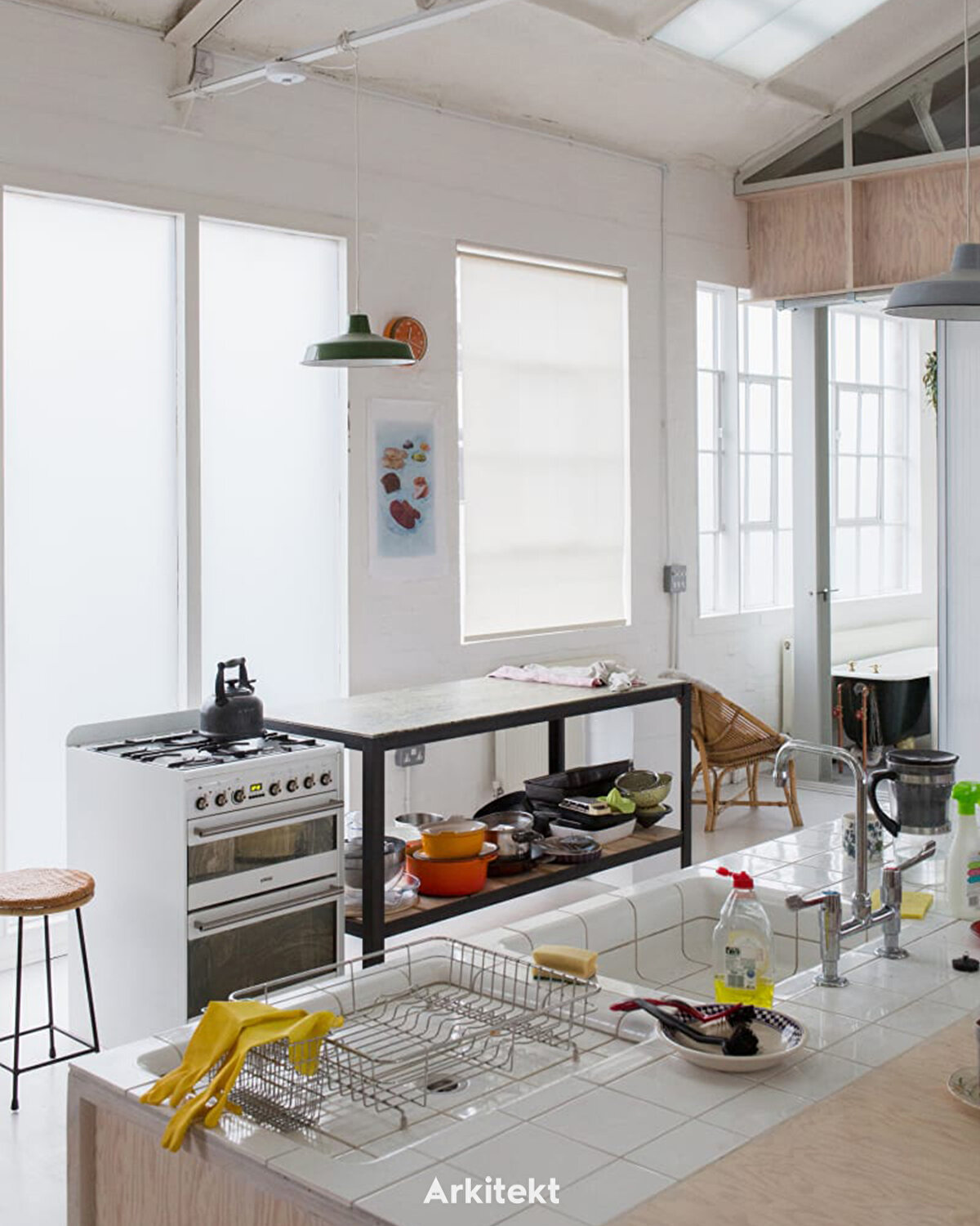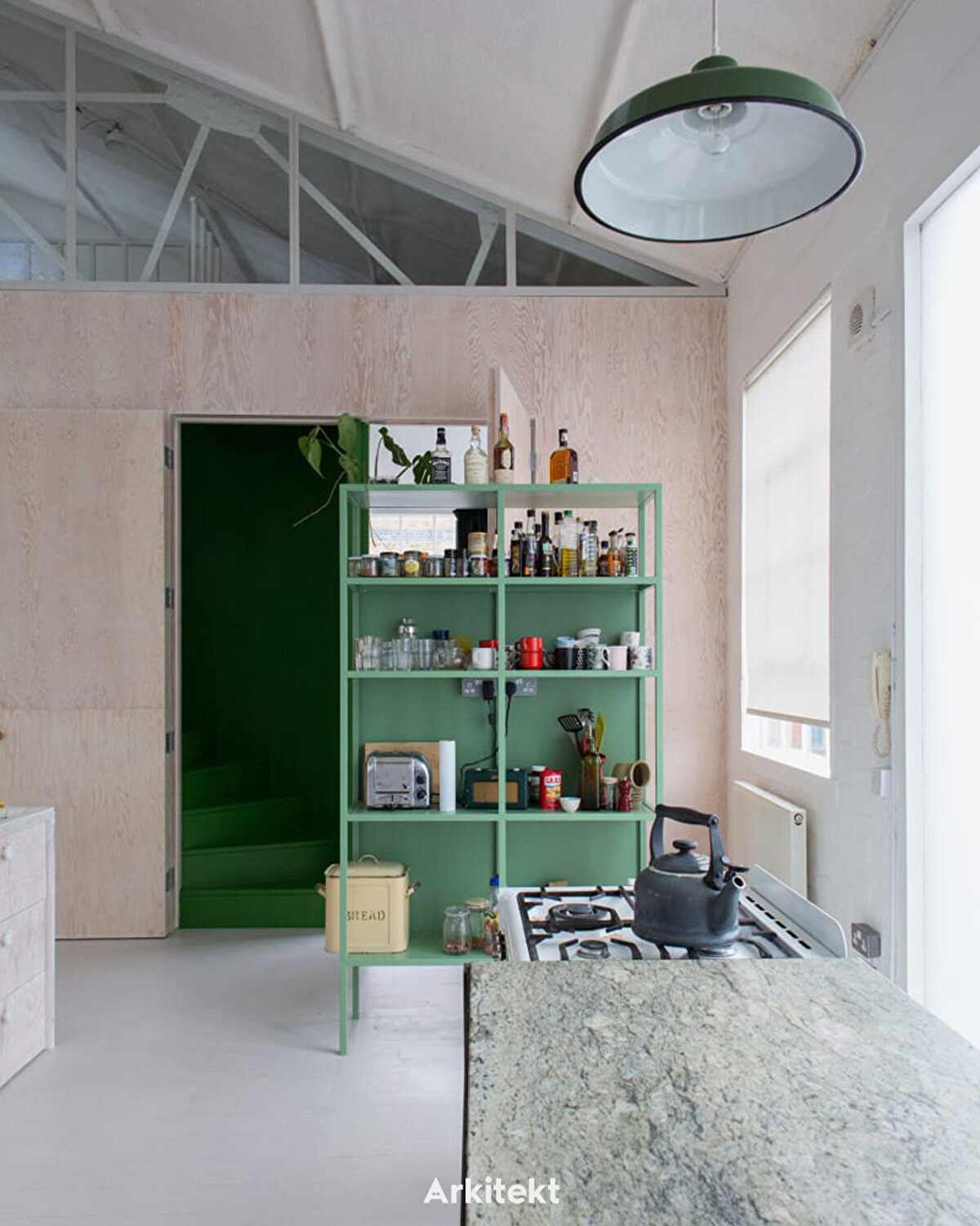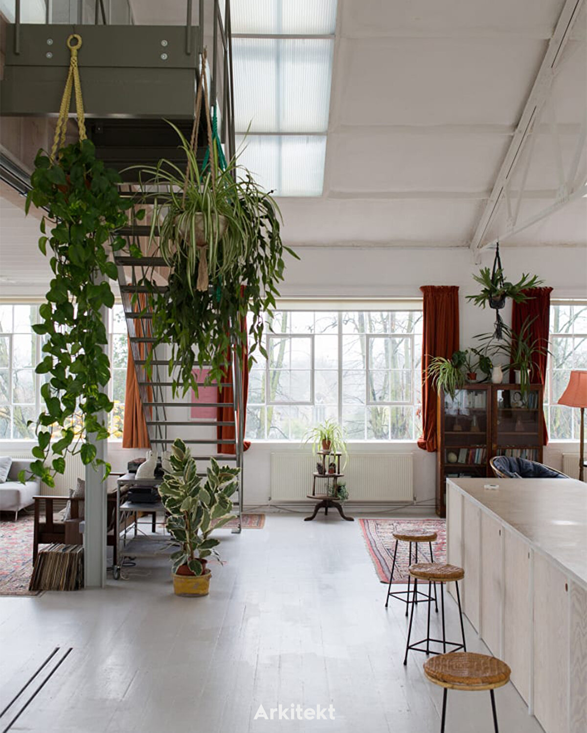 Eski bir deponun bir sanatçı ve ailesi için açık plan konuta dönüştürüldüğü proje, 200 m2'lik bir zemine oturuyor. Orijinal mekanın mevcut pencere açıklıkları korunarak iç mekanda aydınlık ve ferah bir atmosfer oluşturuldu. Ana mekan, açık mutfaklı bir yaşam alanına açılan merkezi bir merdiven etrafında düzenlendi ve yatak odaları bu merkezi alana doğru açılıp kapanan sürgülü kapılar aracılığıyla bölümlendi. Diğer tarafta asma katı taşıyan bir dizi sütun; yaşam alanı, banyo ve kilere geçişi tanımlayarak farklı karakterdeki mekanları açık plan içinde düzenledi. Proje: @dyvikkahlen (ig) Fotoğraflar: Antoine Espinasseau