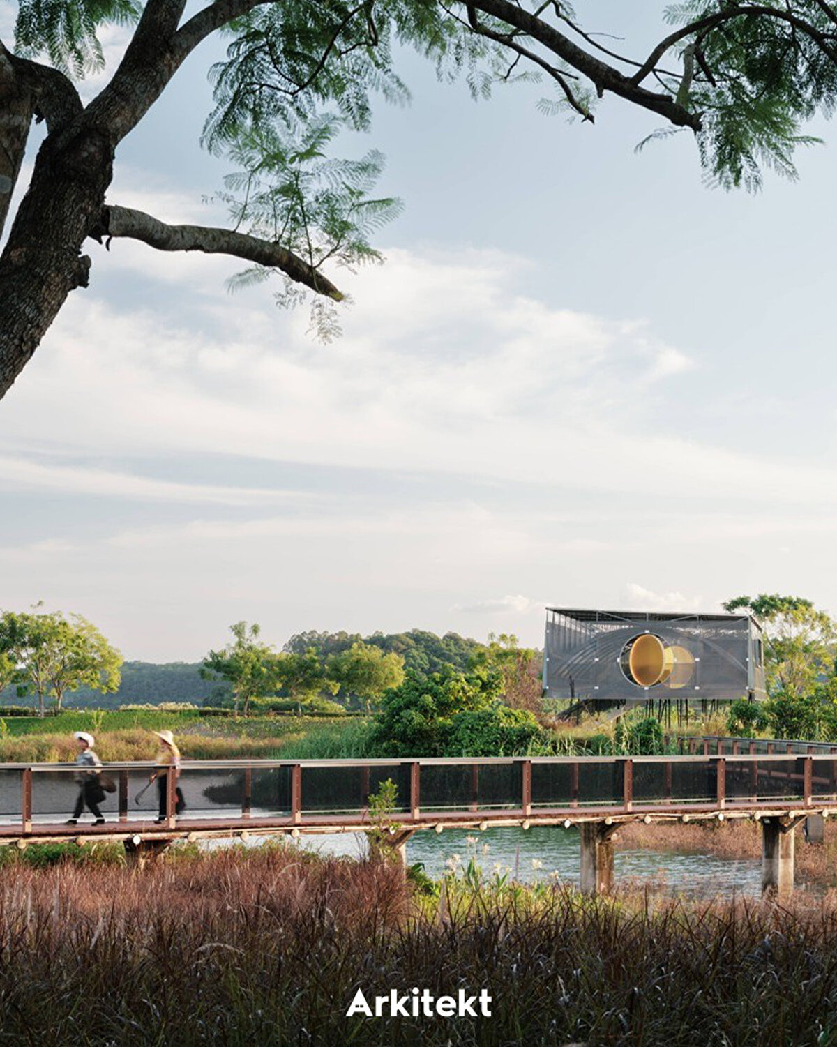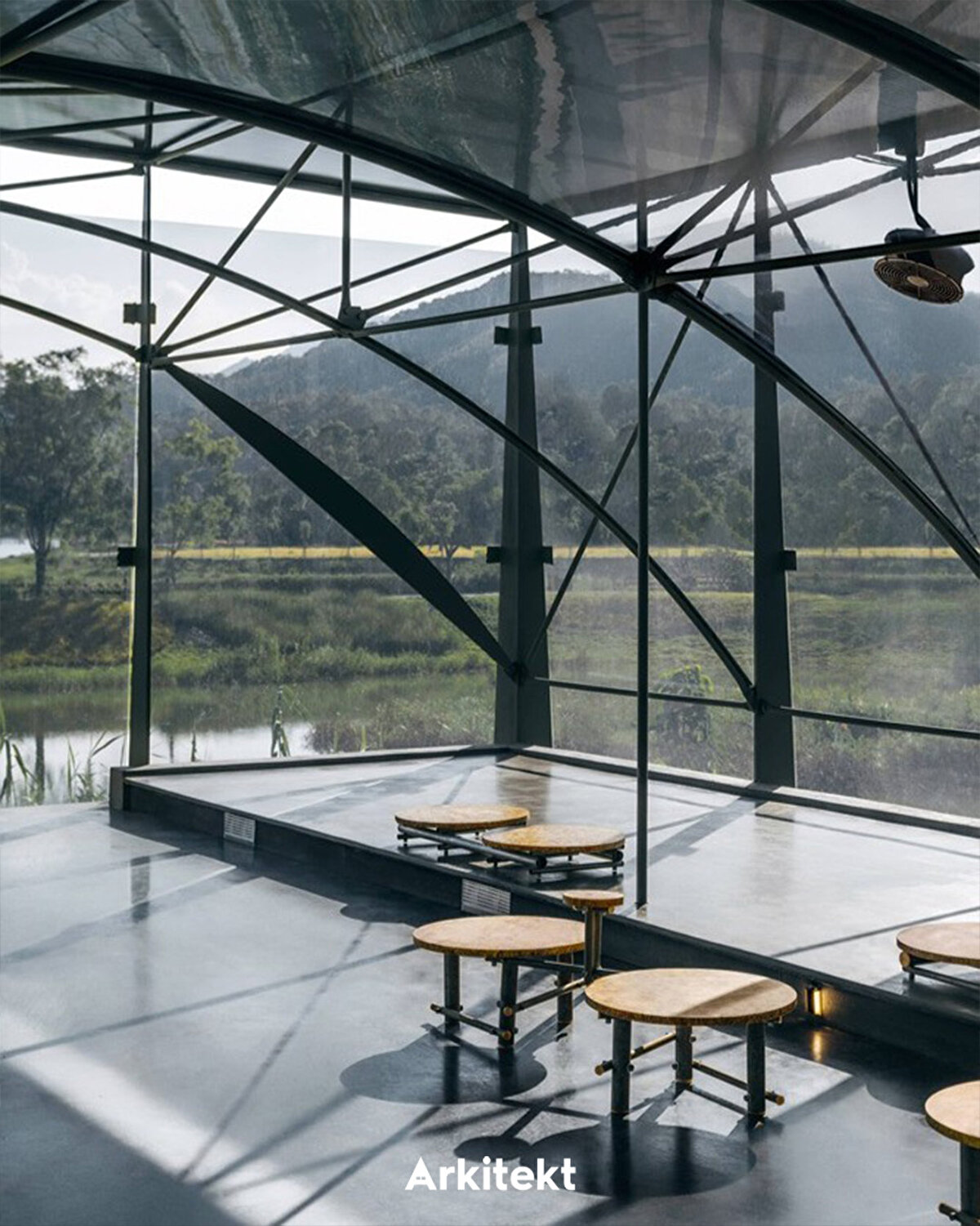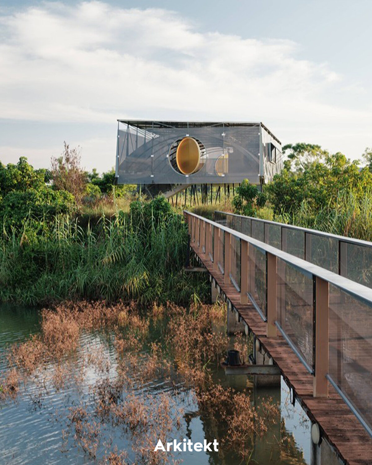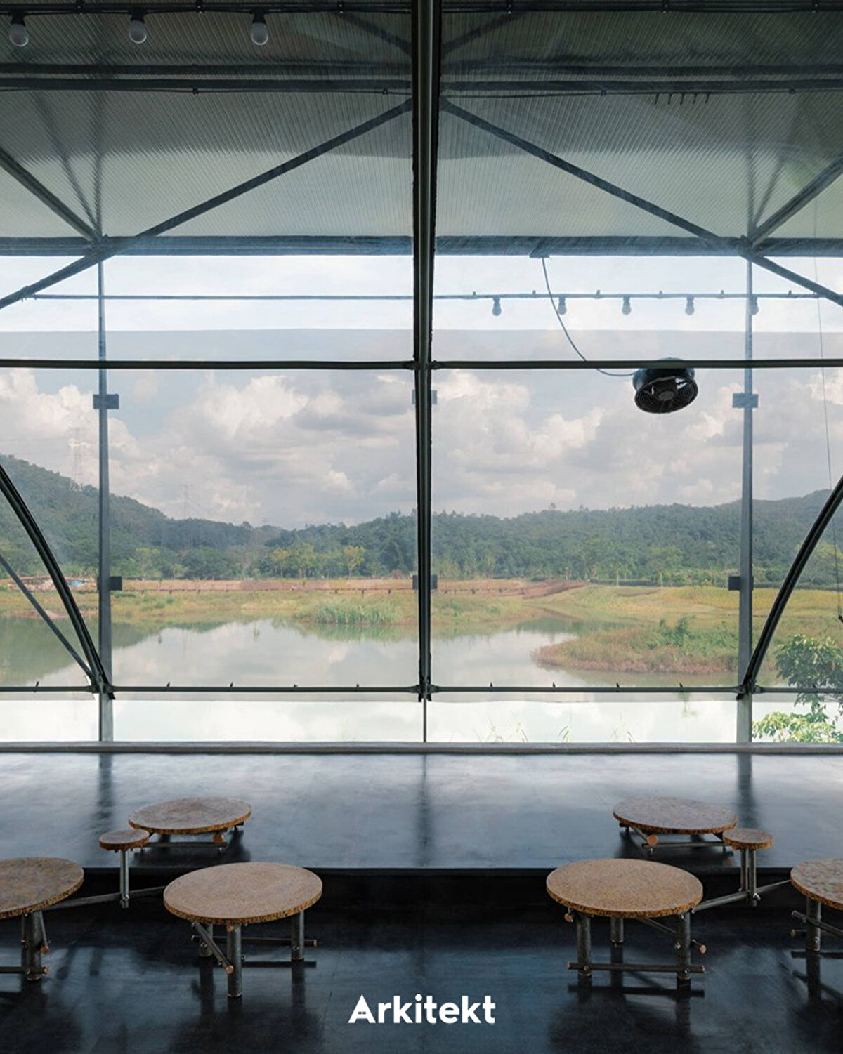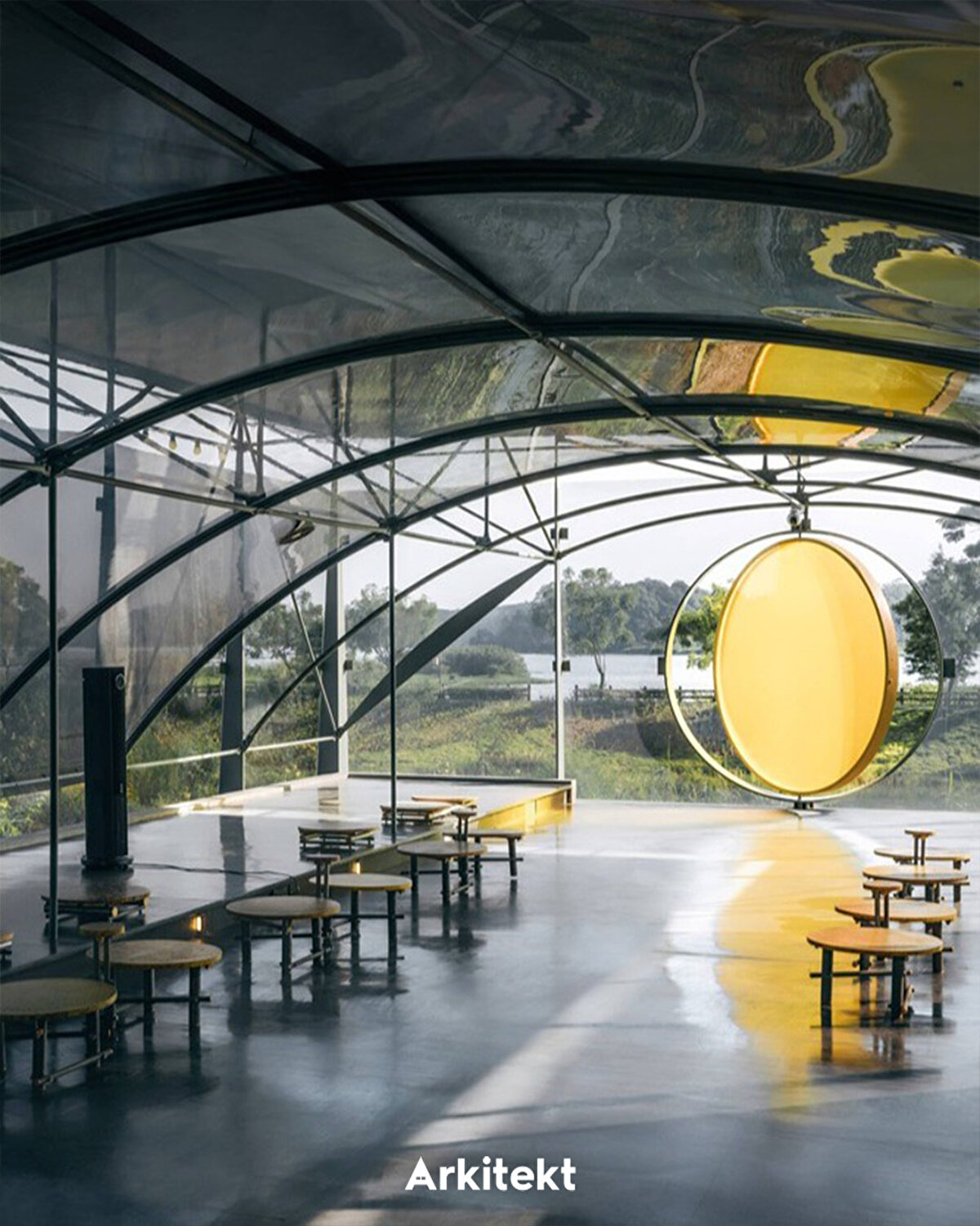 Designed by Atelier Guo in Huizhou, the Moon Pavilion is a 120-square-meter public structure completed in 2025, repurposed from an abandoned greenhouse. The design preserves the greenhouse's lightweight steel structure and temporary character, transforming the concepts of “moon," “water," and “boat" into architectural form through spatial abstractions. The facade, defined by polycarbonate panels, enhances the relationship between permeability and reflection, defining the boundary between interior and exterior spaces with a semi-transparent surface.