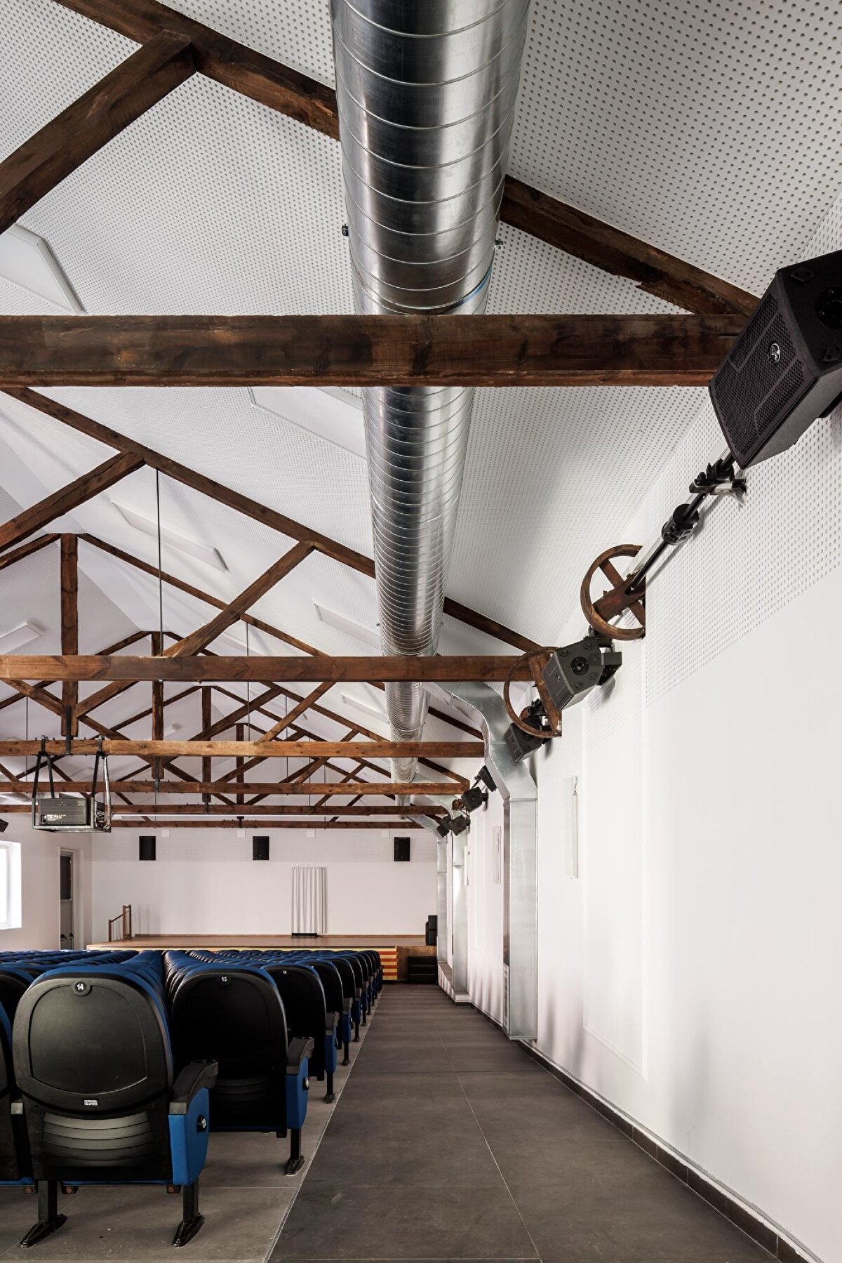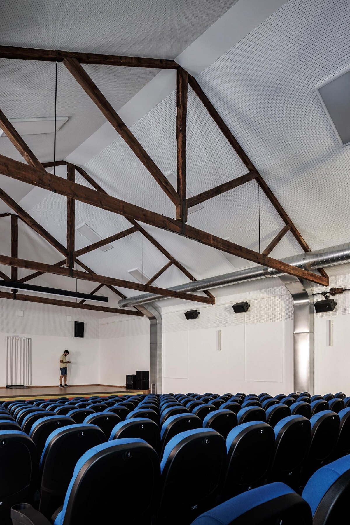 Radiz Arquitectura's 2021 intervention transforms the former shoe factory in Brea de Aragón into a multifunctional cultural venue hosting theatre and cinema programs. The existing structure, with its strong architectural character, is preserved; the ashlar stone blocks and timber beams are kept visible, and the original openings are reinterpreted to accommodate the new spatial configuration.
