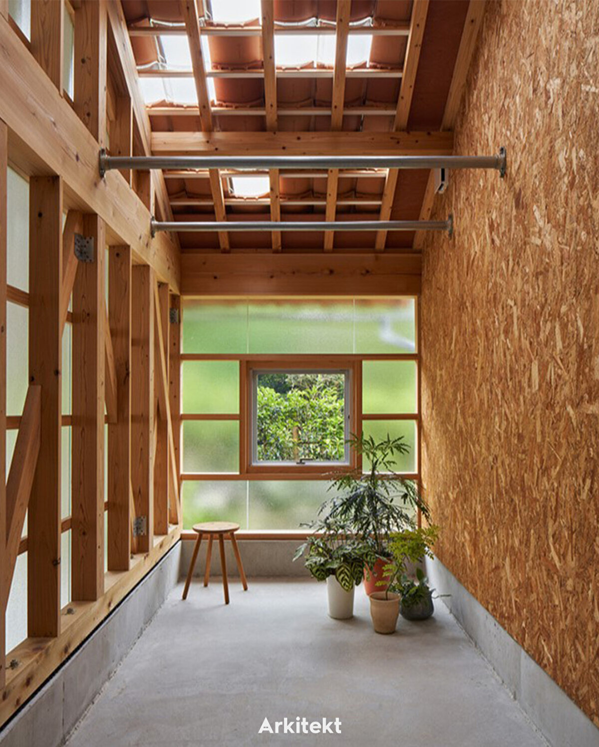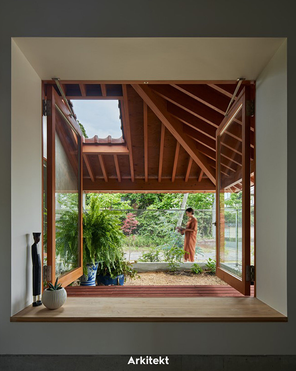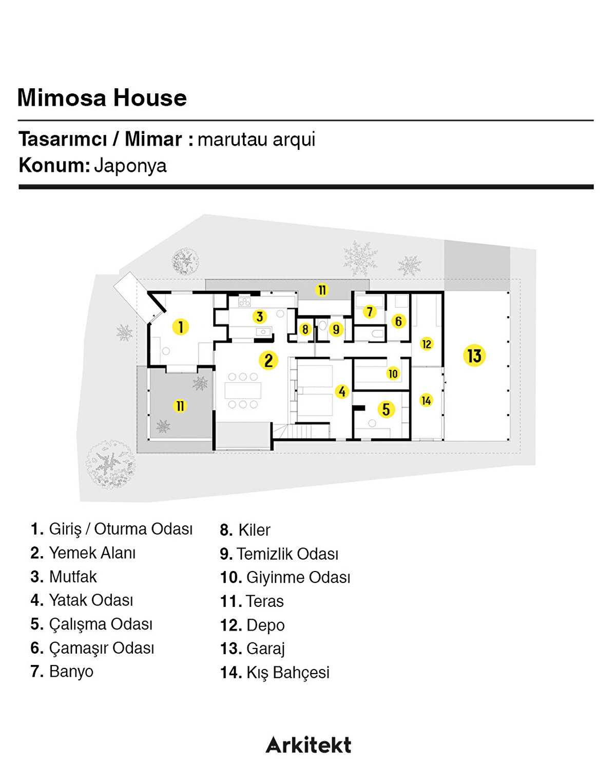 Marutau Arqui tarafından, yaşlı bir çift için tasarlanan evin birinci katında, yatak odası merkezi bir konumda yer alıyor. Yüksek tavanlı oturma ve yemek odası, ışık ve gölgelerin gün boyunca hareket ettiği bir alan sunuyor. Batıdaki avlu ve giriş salon olarak kullanılabiliyor.
