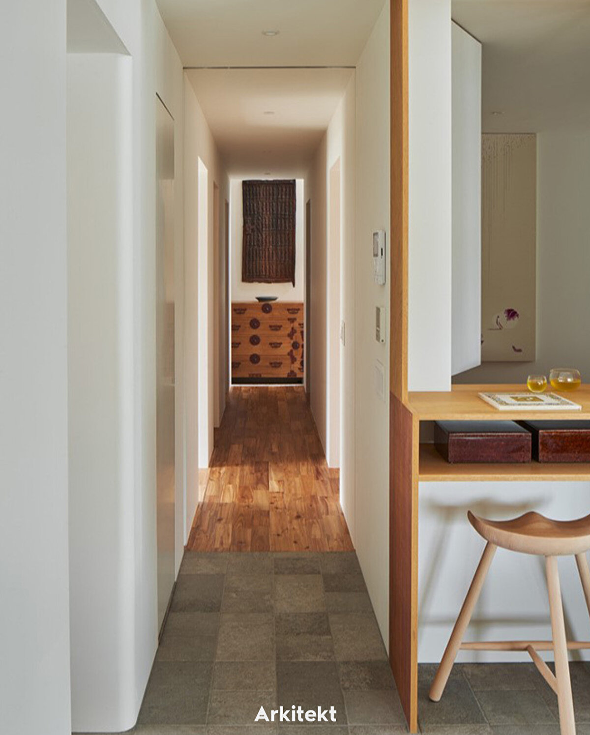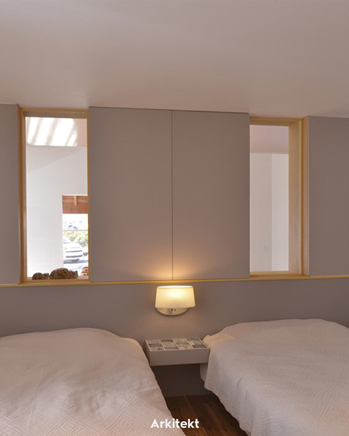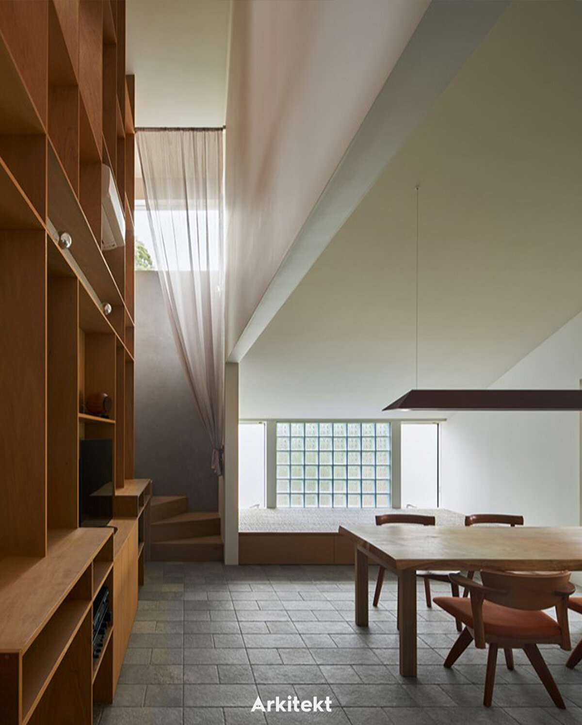 Designed by Marutau Arqui for an elderly couple, the bedroom is centrally located on the first floor. The high-ceilinged living and dining room offers a space where light and shadows move throughout the day. The courtyard and entrance to the west can be used as a living room.