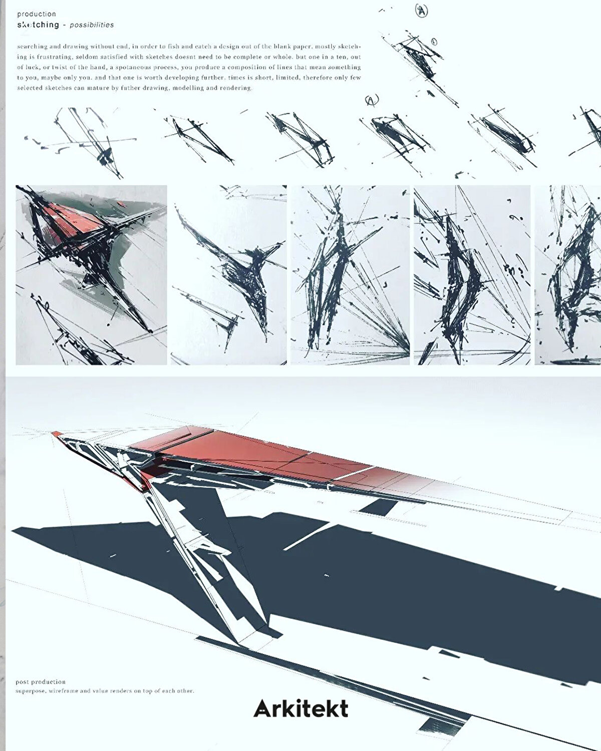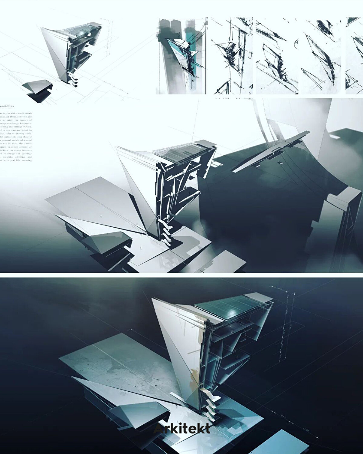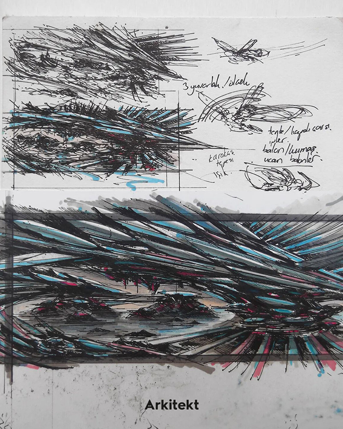 Altlık olarak kullandığı minimal eskizleri daha sonrasında dijital platforma taşıyarak wacom kalem ile tamamlıyor.