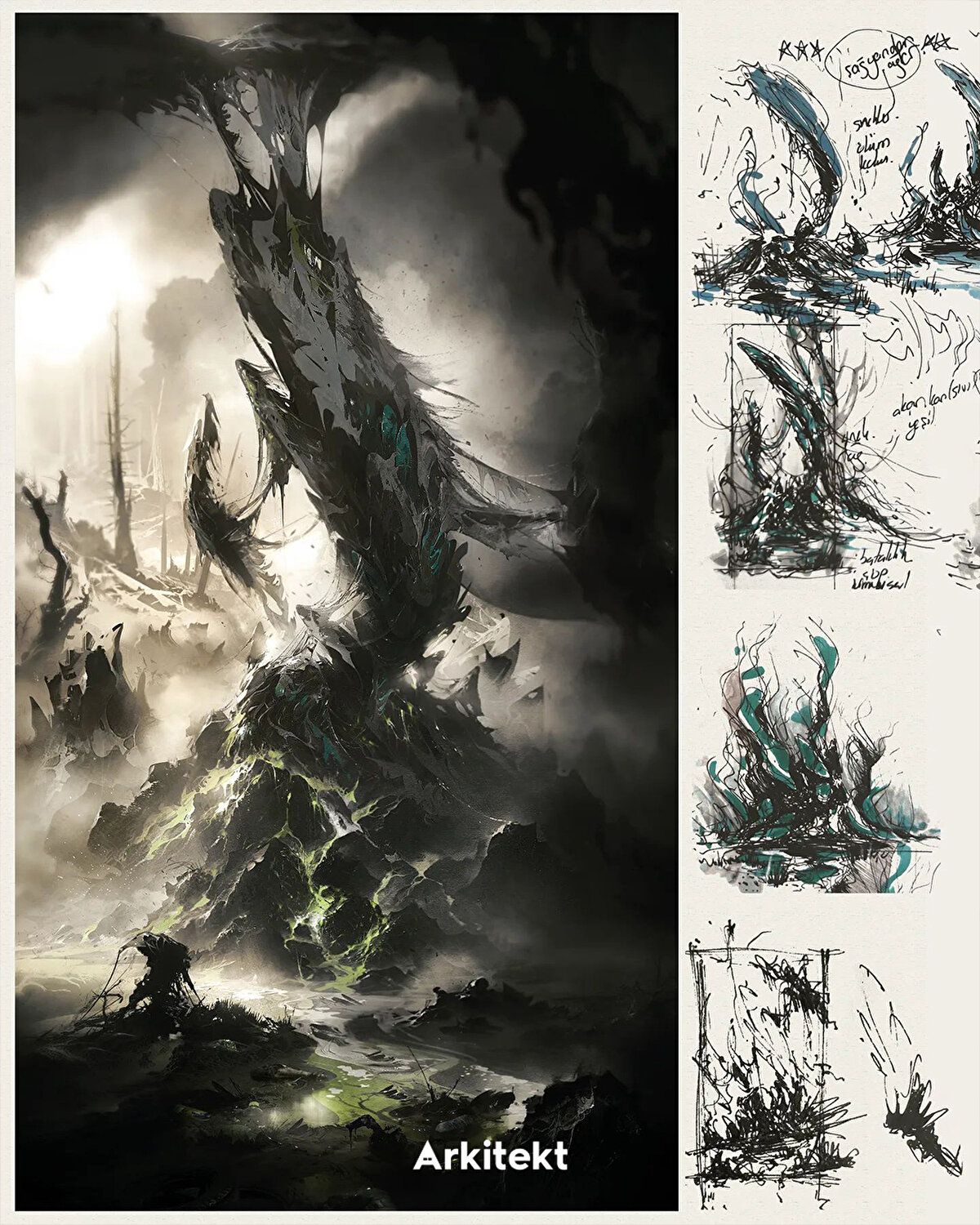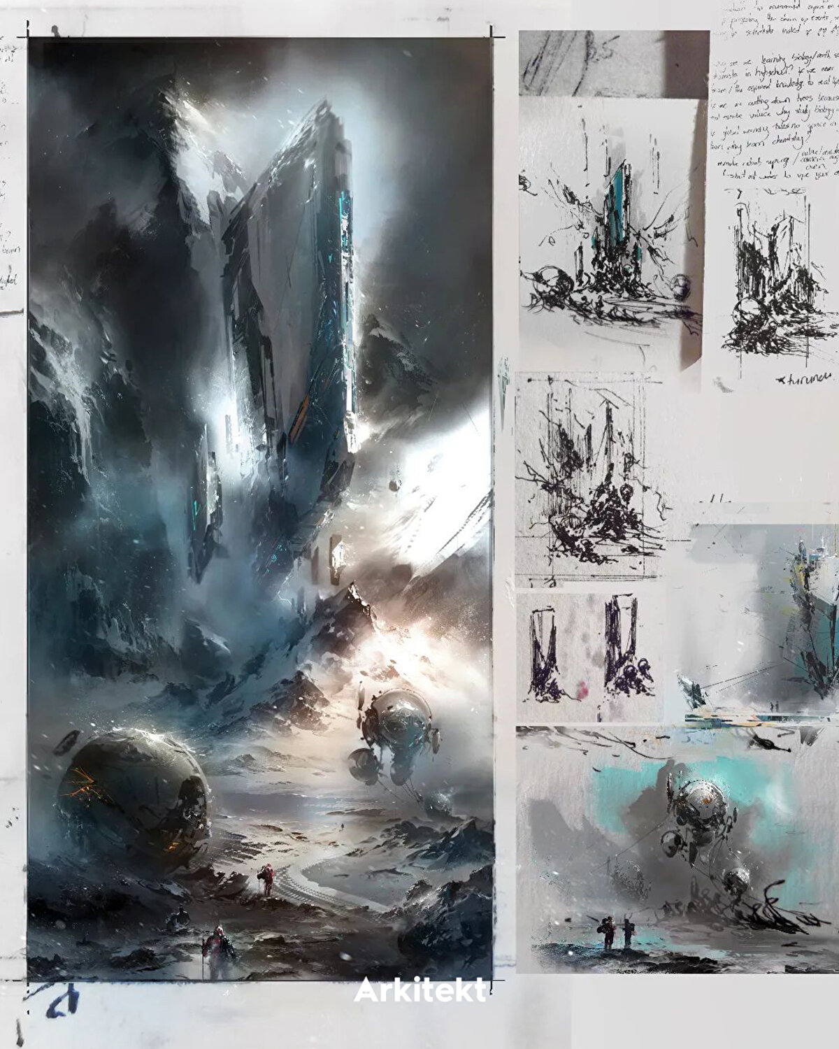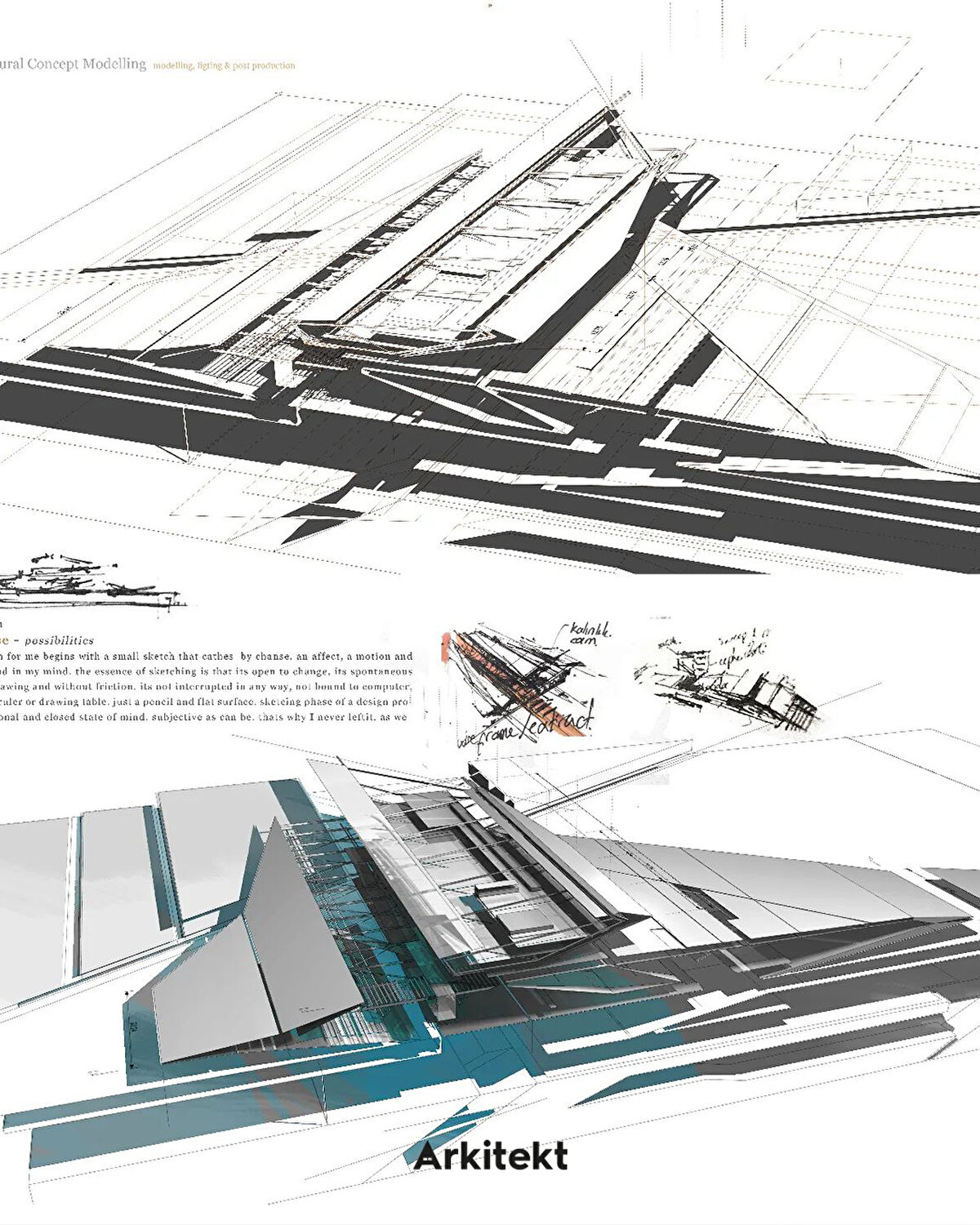 Altlık olarak kullandığı minimal eskizleri daha sonrasında dijital platforma taşıyarak wacom kalem ile tamamlıyor.