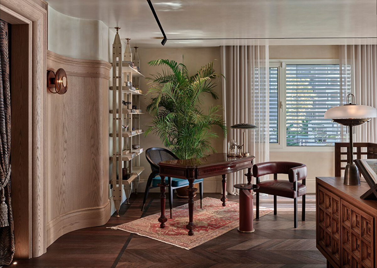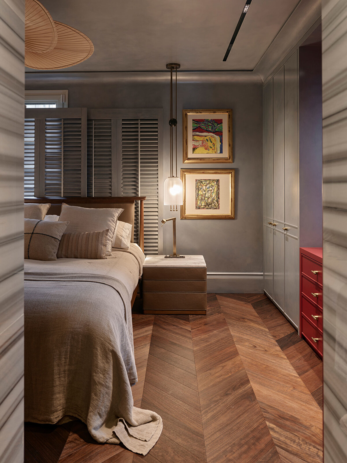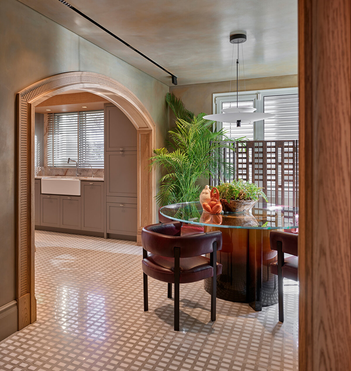 Orijinalini küçük olan mutfak yanındaki oda ile birleştirilerek genişletiliyor. Bu birleşme sonucunda hem mutfak hem de yemek alanı oluşturuluyor ve aralarında kemerli bir geçişle bağlantı sağlanıyor. Ebeveyn yatak odasına, apartmanın bahçesine panoramik bir görüntü sunacak şekilde sürpriz bir koridor ekleniyor. Bu koridor, evin orijinal balkonunu da kapsayacak şekilde oluşturuluyor. Evde kullanılan renkler ve materyaller doğal malzemelere dayanıyor. Meşe, seramik ve mermer gibi doğal malzemelerle pastel renk paletleri bir arada kullanılarak hem şık hem de sıcak bir atmosfer elde ediliyor.